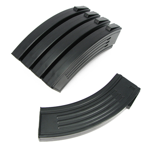 The magazines are made of plastic. Capacity - 100 BBs. They have available for some time. They are sold in sets of 5 and cost about 70 USD to a single set.