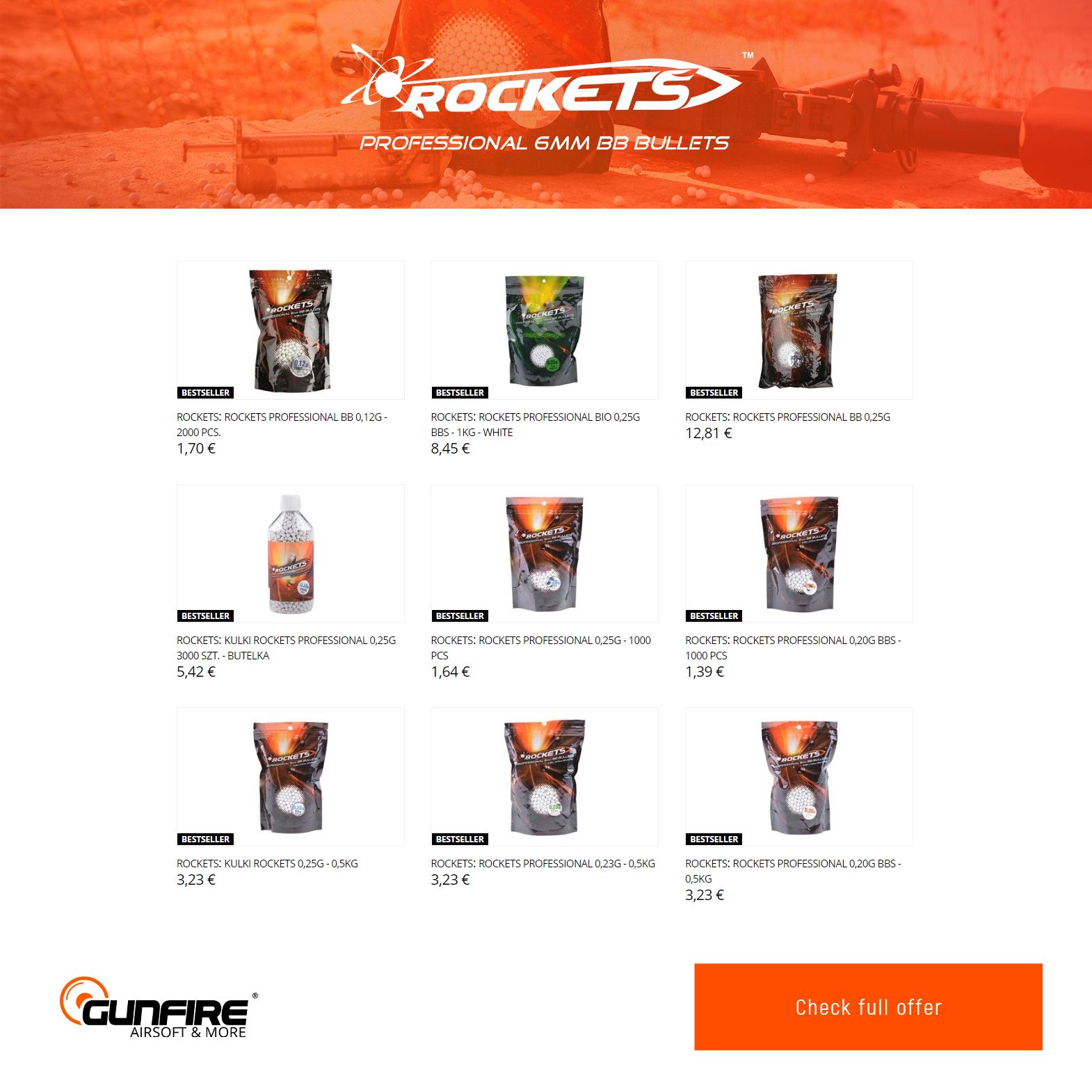 A new shipment of Rockets BBs! The offer includes a wide range of types including BIO or Tracer variants, as well as different package sizes, from small ones (1000 pieces) to big bags (25KG).