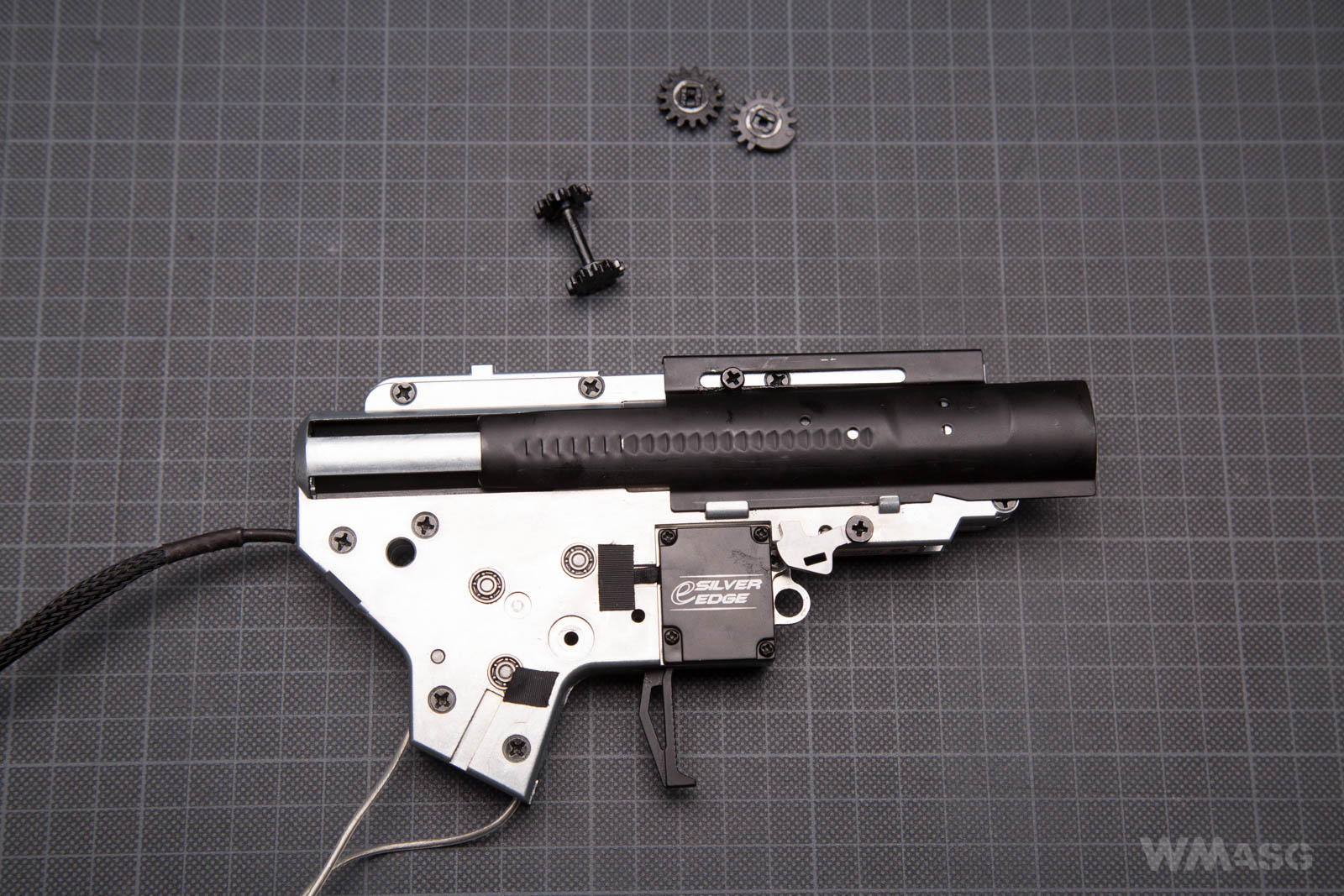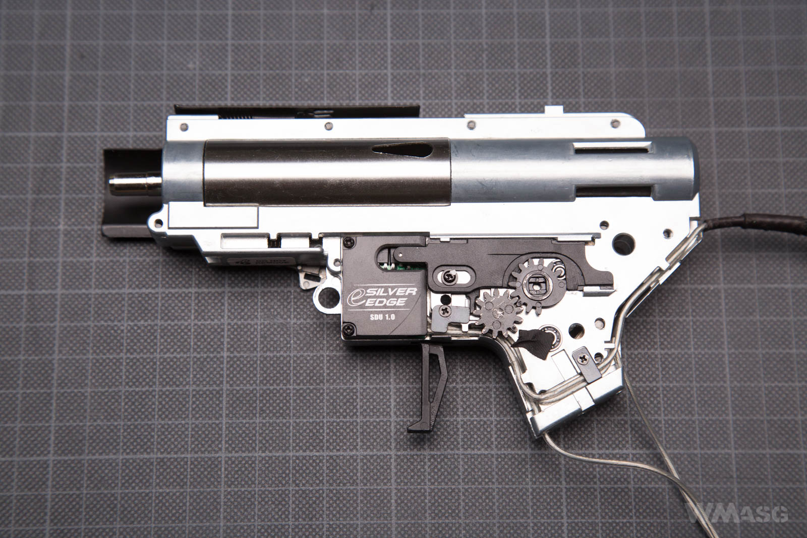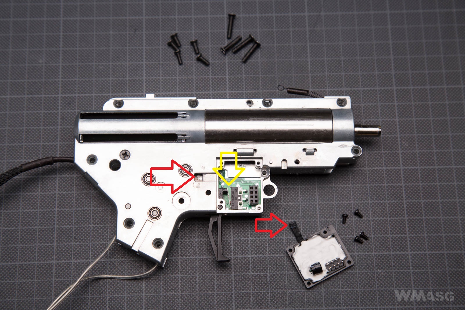 The opened SDU. The yellow arrow indicates the micro-switch arm that works with the trigger. The eSilver Edge has cut-off lever. In single fire mode, the Hall effect sensor tracks the rotation of the sector gear and disconnects the power supply after every full turn. A reset and and firing a next shot is carried out by releasing and pressing the trigger again. The sensor does not work in the full-auto mode. The larger red arrow indicates the magnet pressed into the sector gear visible through a port in the frame. The smaller arrow shows the Hall effect sensor.