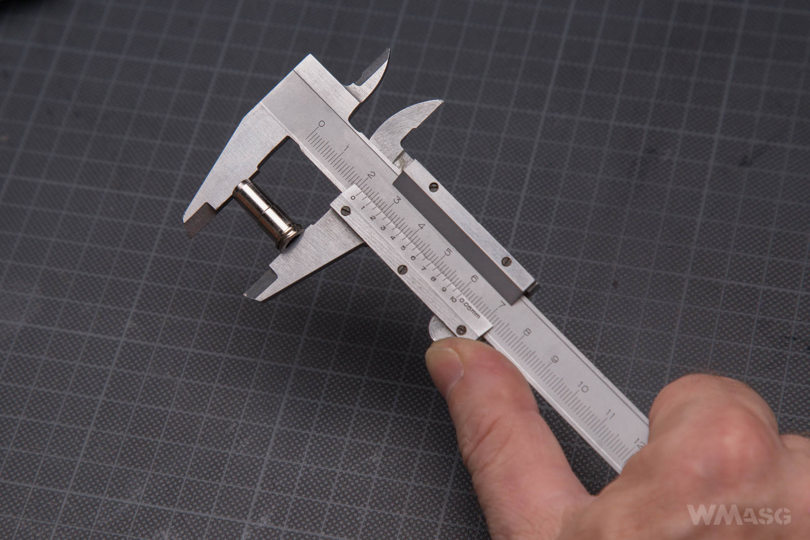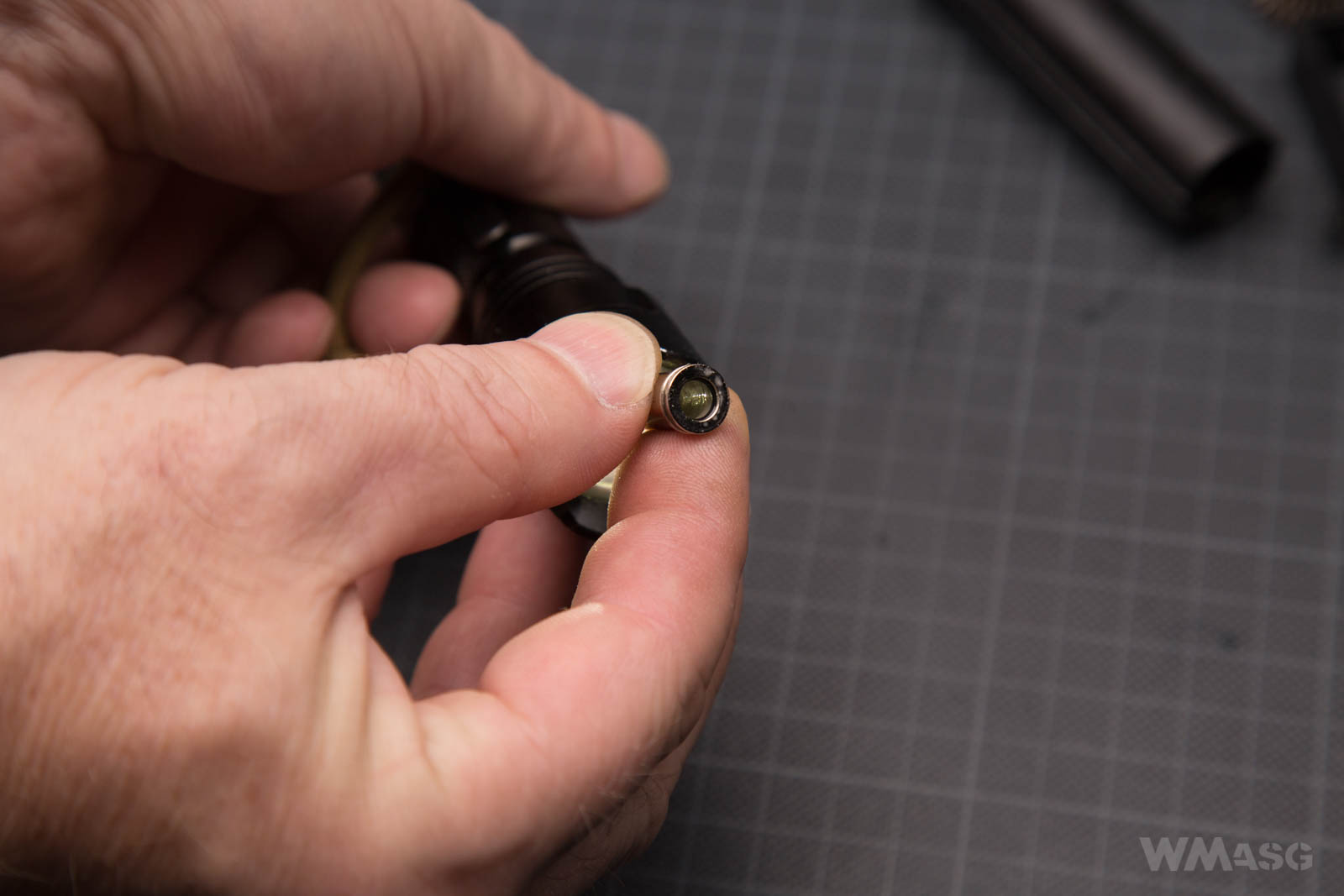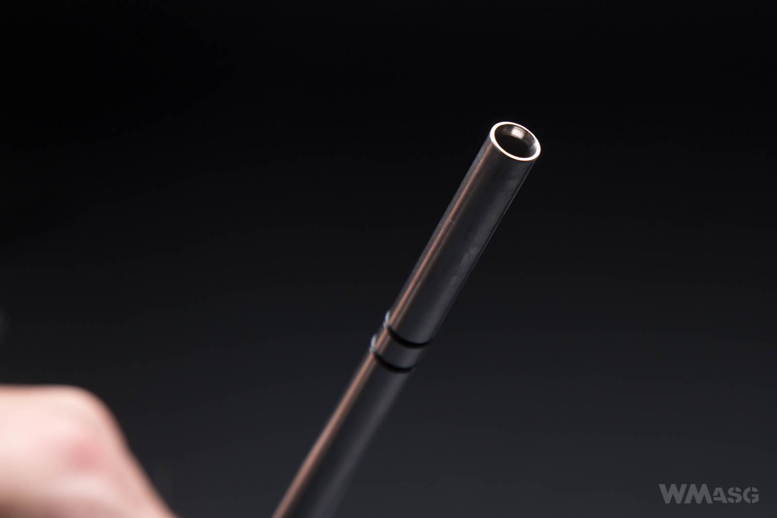 A steel inner barrel with a diameter of 6.03 mm. Its exiting end is beveled. The photos also shows two groves in which o-rings stabilizing the barrel inside the external barrel were placed.