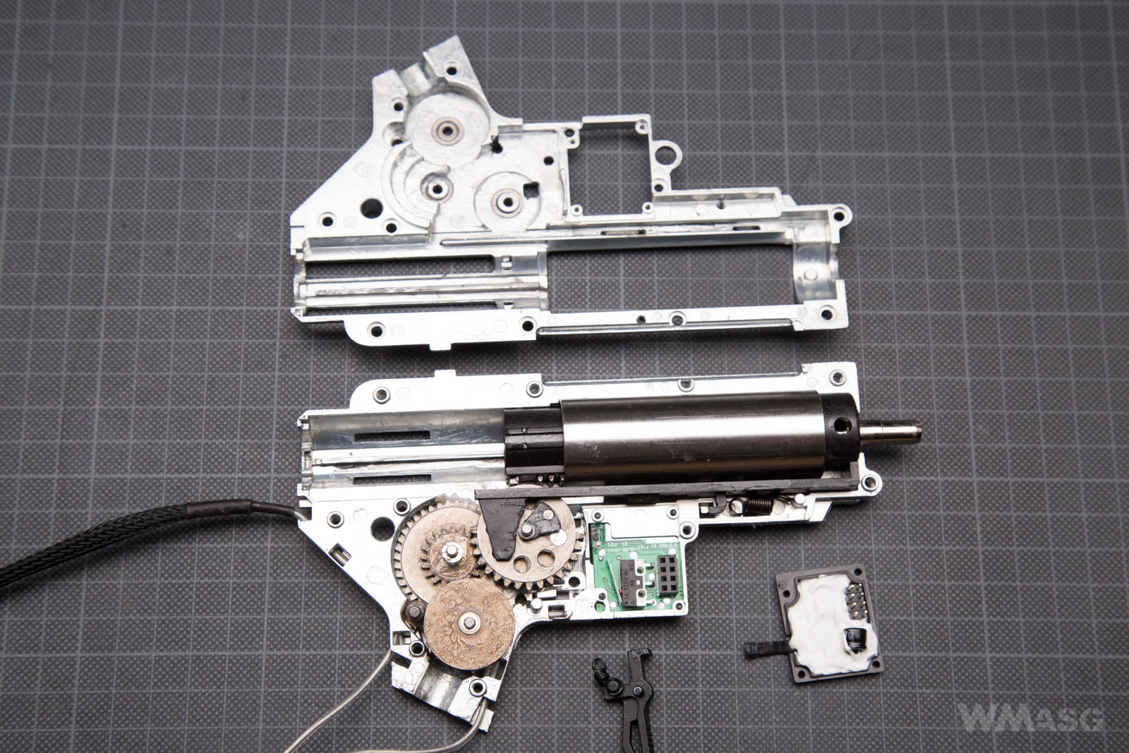 The right side of the gearbox with the dismantled dummy bolt carrier.