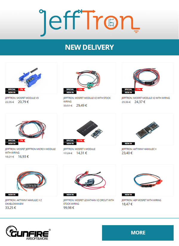Upgrade your replica with parts by Jefftron! The new delivery consists of new, high-quality MOSFET modules dedicated to airsoft replicas. Modules are available in various versions including the Leviathan V2!