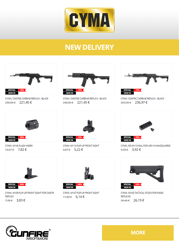 Among over 200 products we have received from Cyma, you will find electric and gas-powered replicas such as the popular AEP pistols, shotguns, sniper rifles and new series of CM076 carbines equipped with tactical accessories.