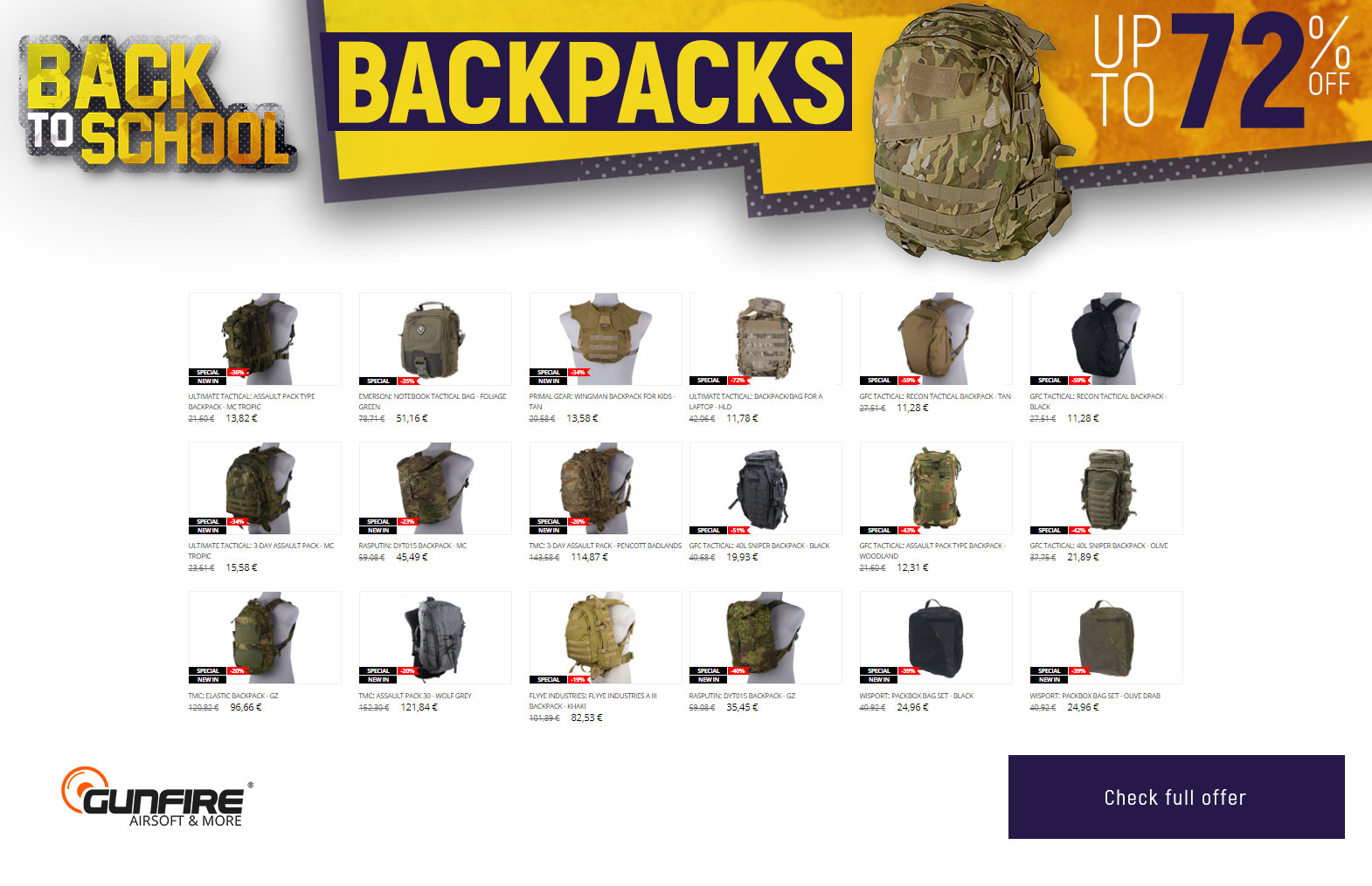 With the new school year around the corner Gunfire’s team want to cheer you up by launching a new sale. In the Back To School special offer, you will find over 4500 products discounted by up to 75%. If you are looking for backpacks, bags or other EDC items just check out their reduced prices. The start of school doesn’t mean the end of the airsoft season. So if you are looking for some airsoft gear you won’t be disappointed. Parts, accessories and replicas by Modify, SHS, VFC, G&G and other popular brands at prices reduced by up to 75%!