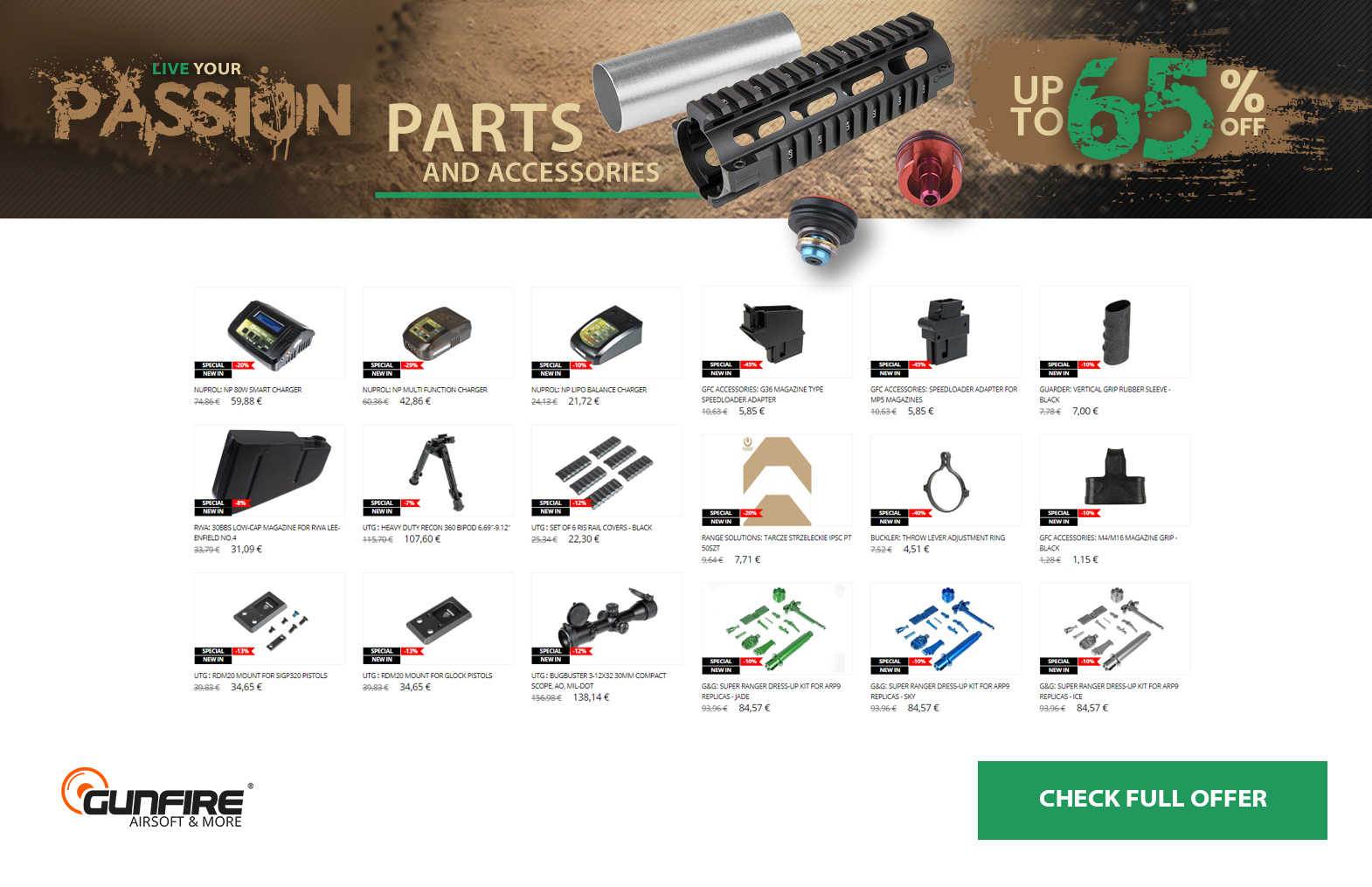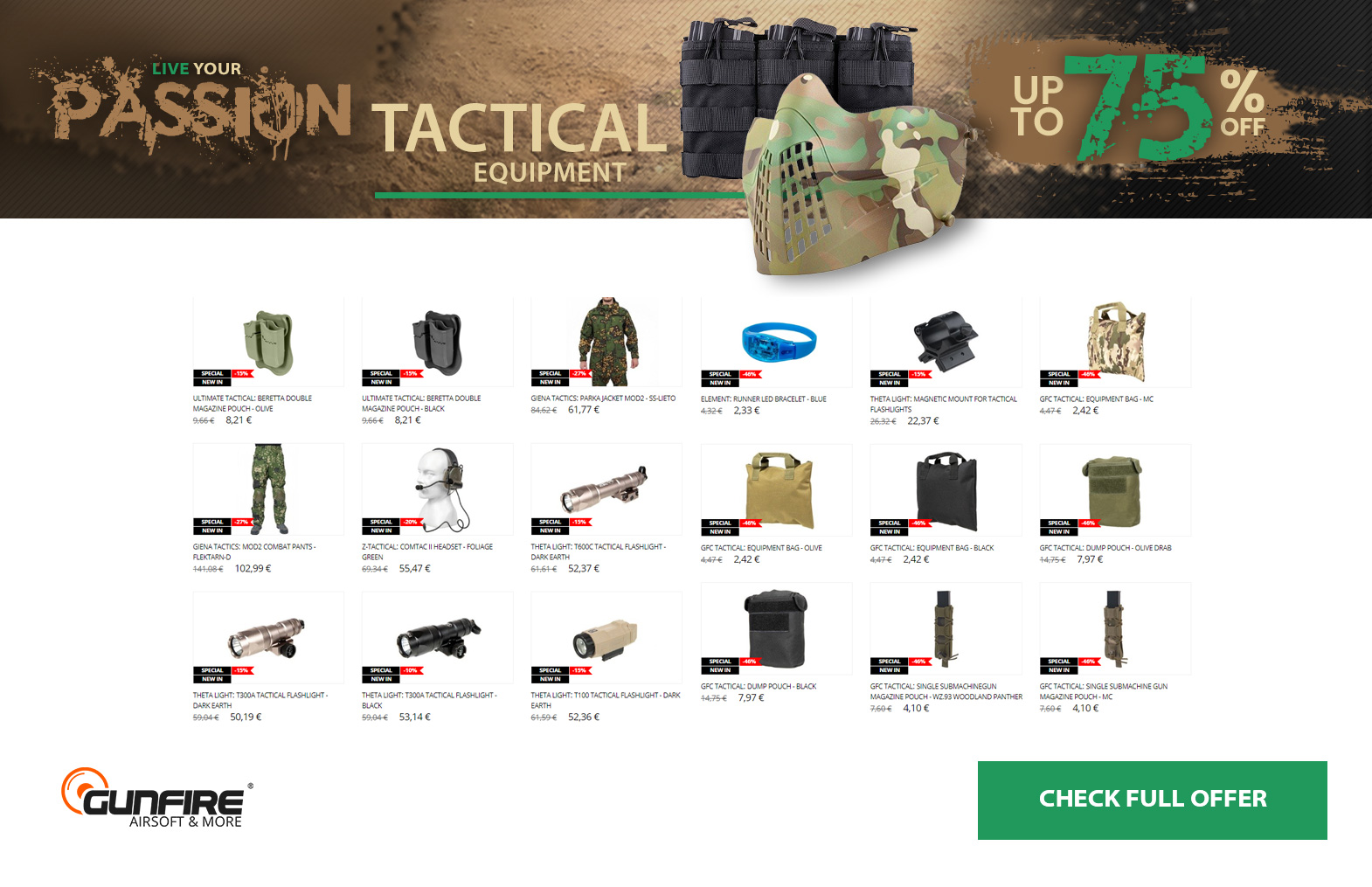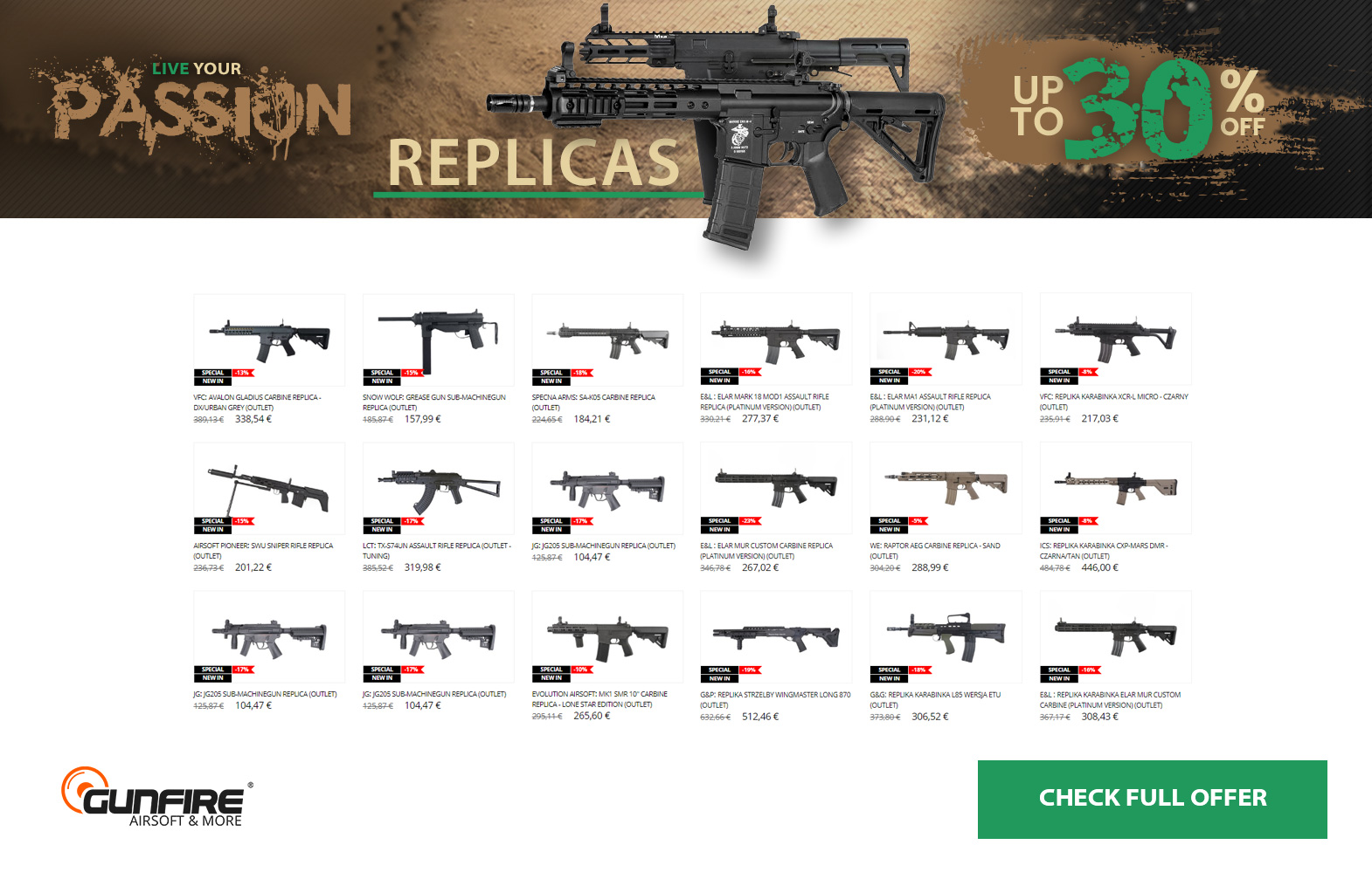 Airsoft is our passion which we want to share with you. However, to fully enjoy the game, you should think about the right equipment. How can you gear up without spending too much? It’s easy. Just check our special "Live Your Passion" offer and get discounts of up to 75% on over 4500 products. Among them are EMG, VFC, or G&G replicas at prices reduced by up to 30%. We have also reduced the prices of gear, parts, and accessories. Some of Element, Primal Gear, Guarder or Airsoft Engineering products can be bought with a 75% discount. Live Your Airsoft Passion with Gunfire and visit our store!