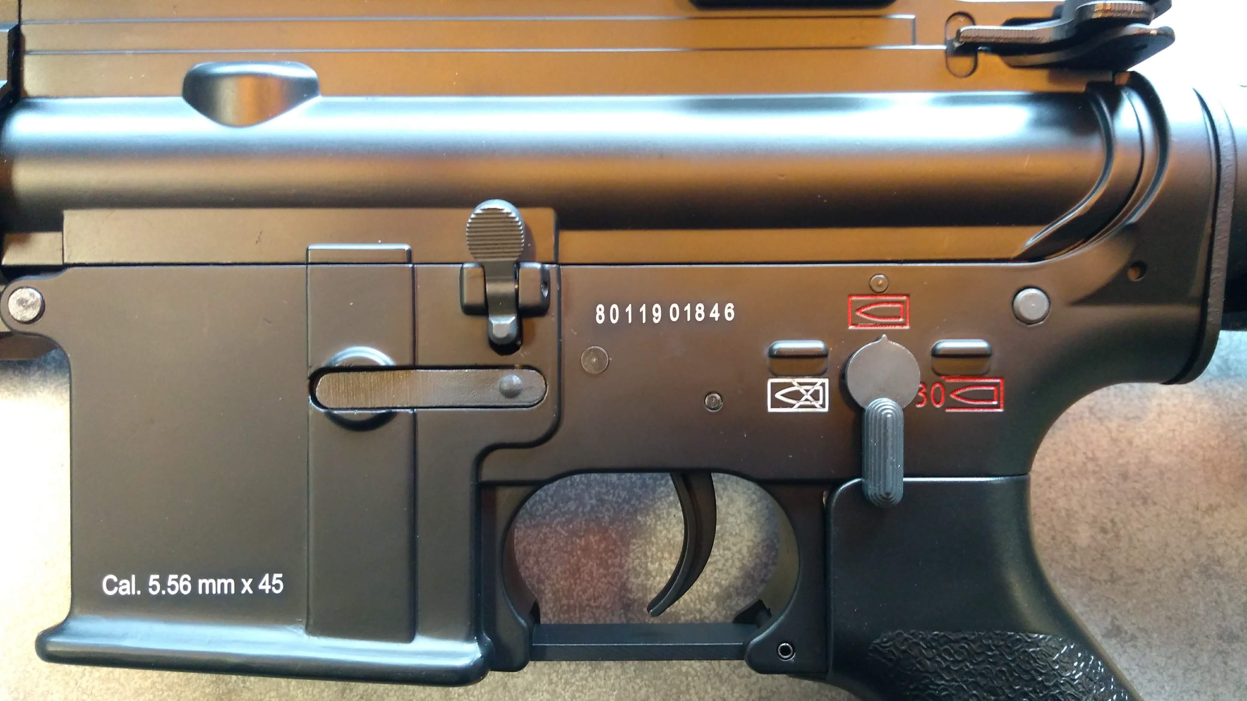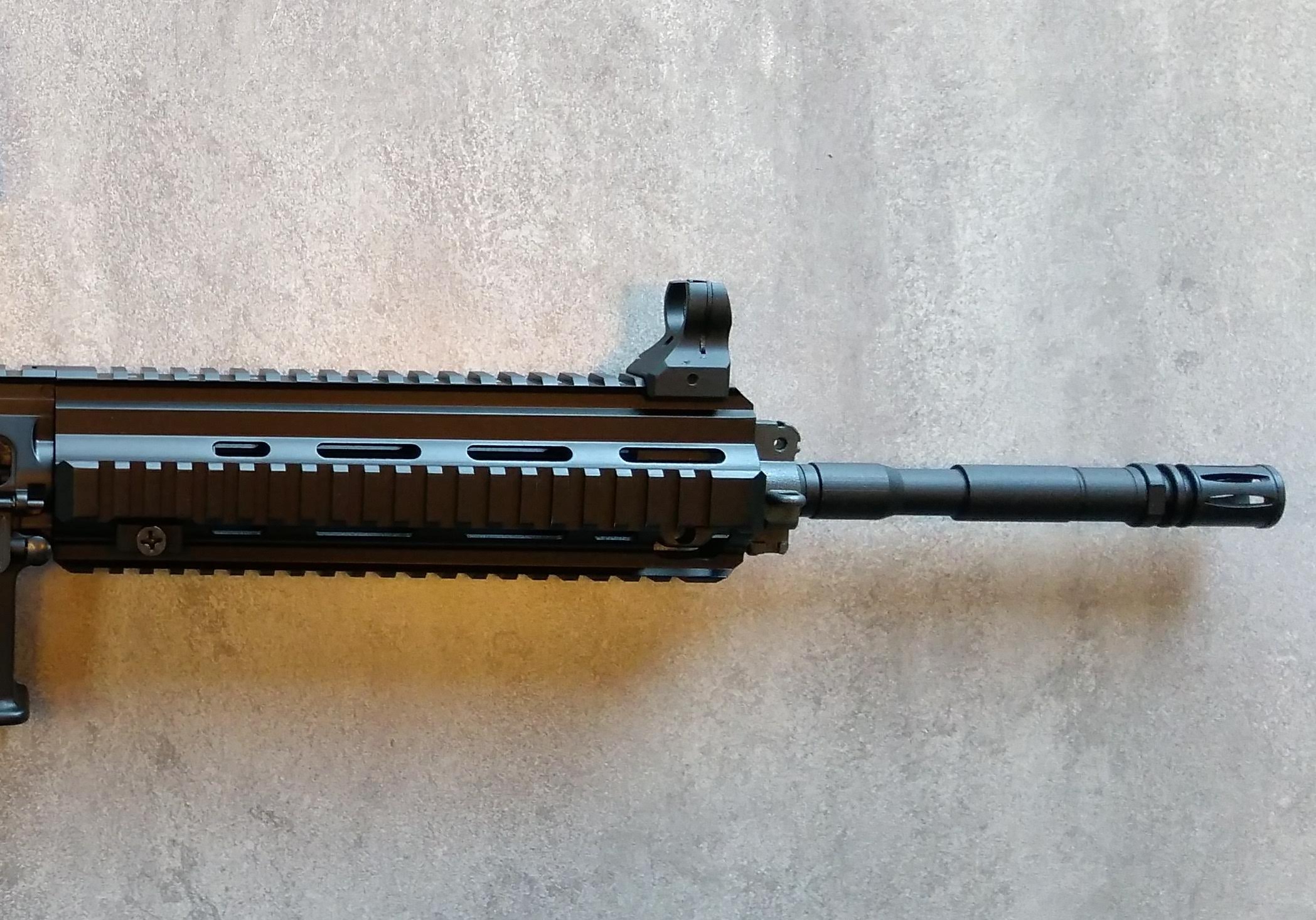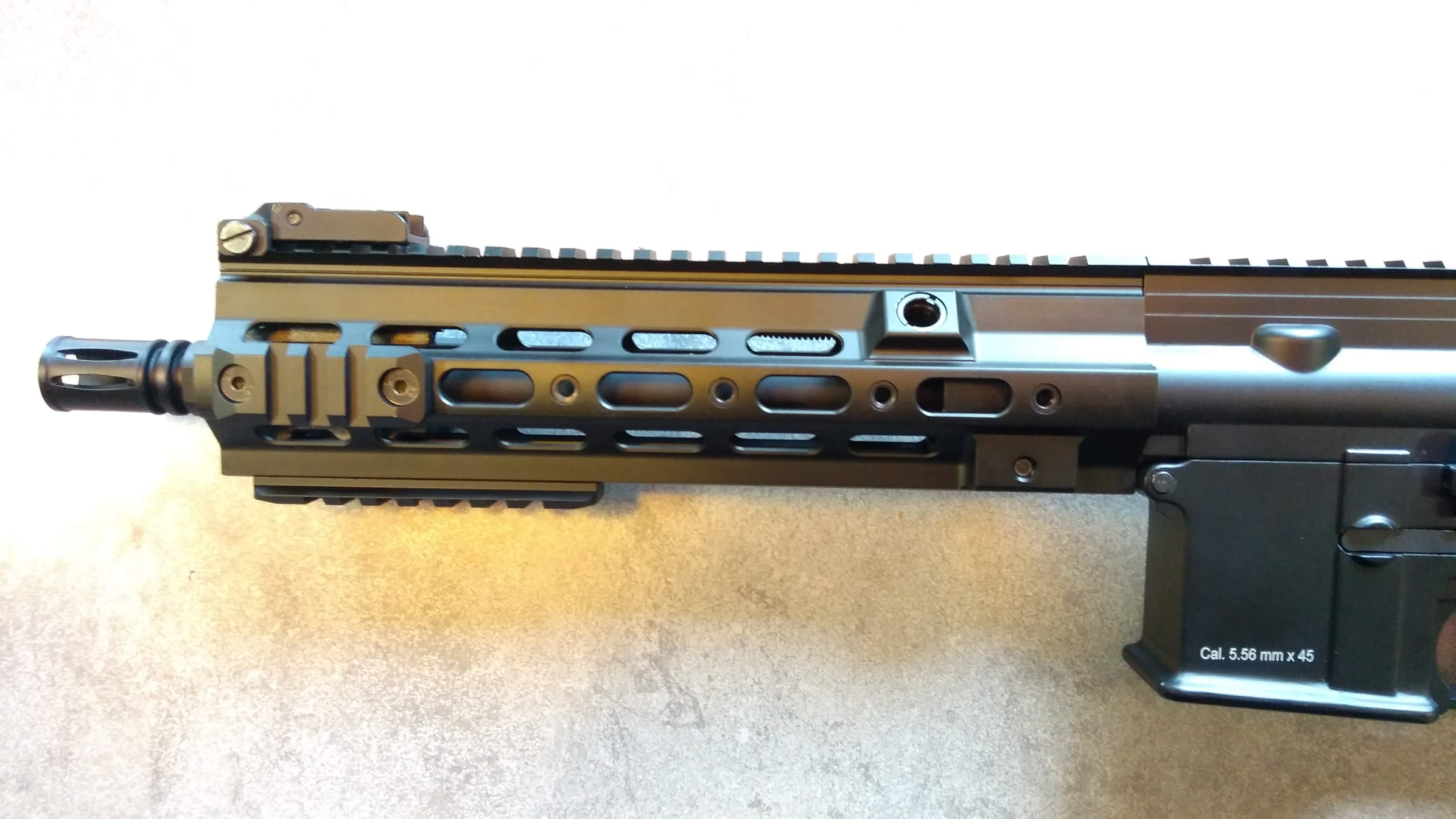 We also noticed a moving dummy bolt carrier, which can be locked in the rear position for easier HopUp adjustment and a functional bolt-catch button. It is also worth noting that both new HK replicas have fronts modeled after the Geissele Super Modular Rail HK front, in 10.5 and 14.5 inch versions. Below is the 10.5 version.