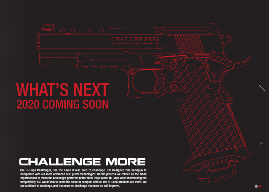 ICS has published an extensive, 150-pages long online catalog, which presents the products planned for release in 2020. In addition to the list of already known replicas that will be produced next year, we can see the initial preview of the Hi-Capa Challenger pistol: