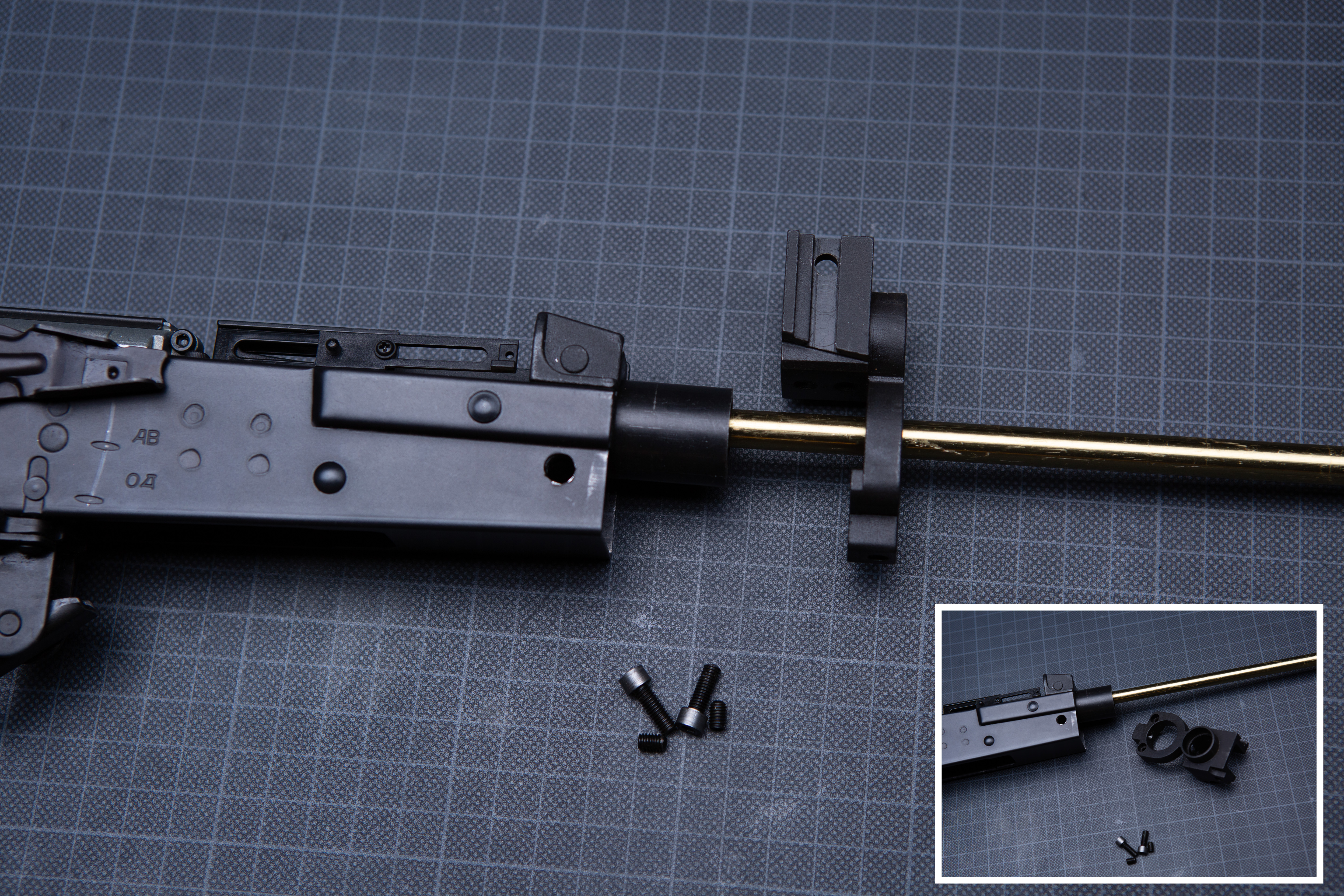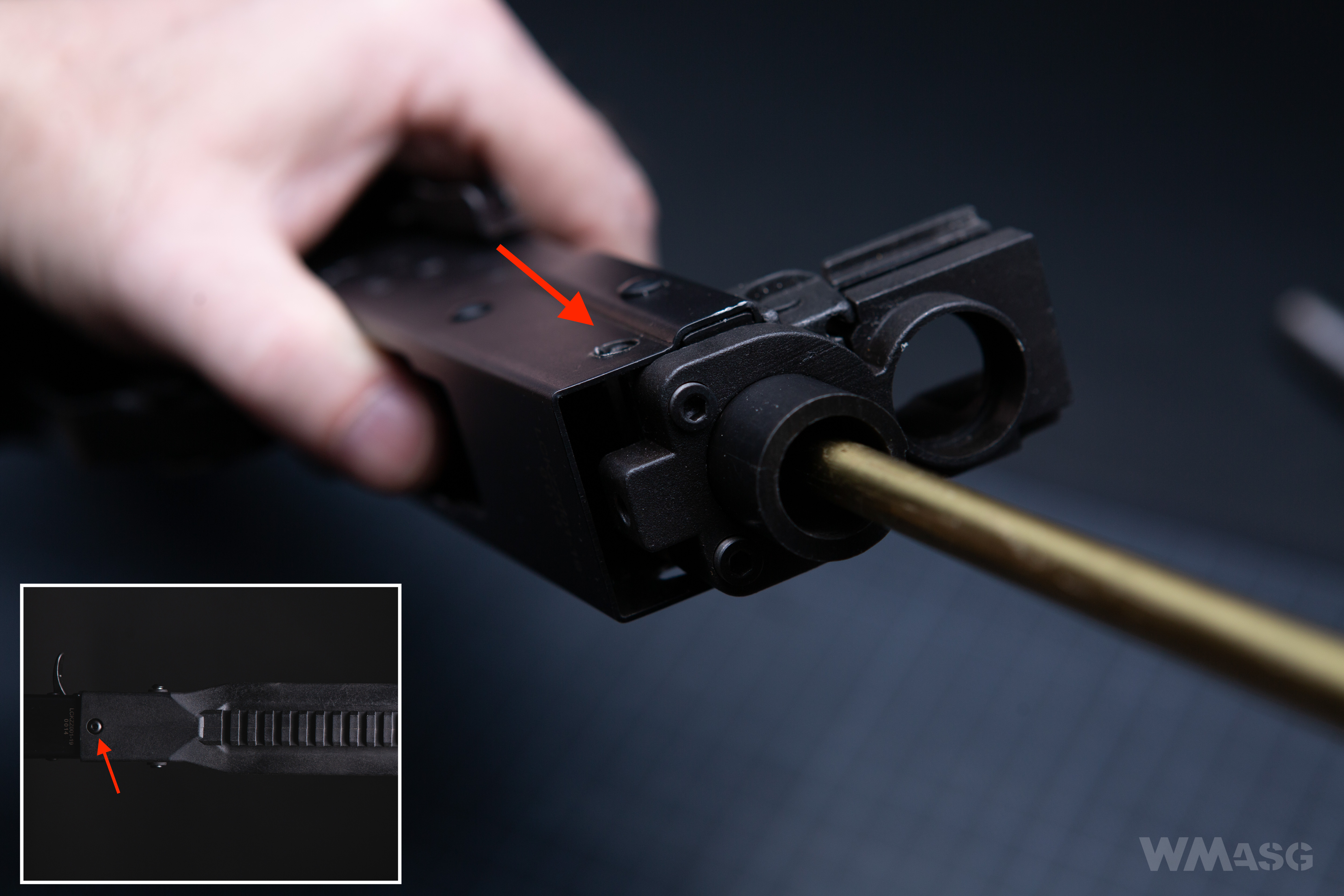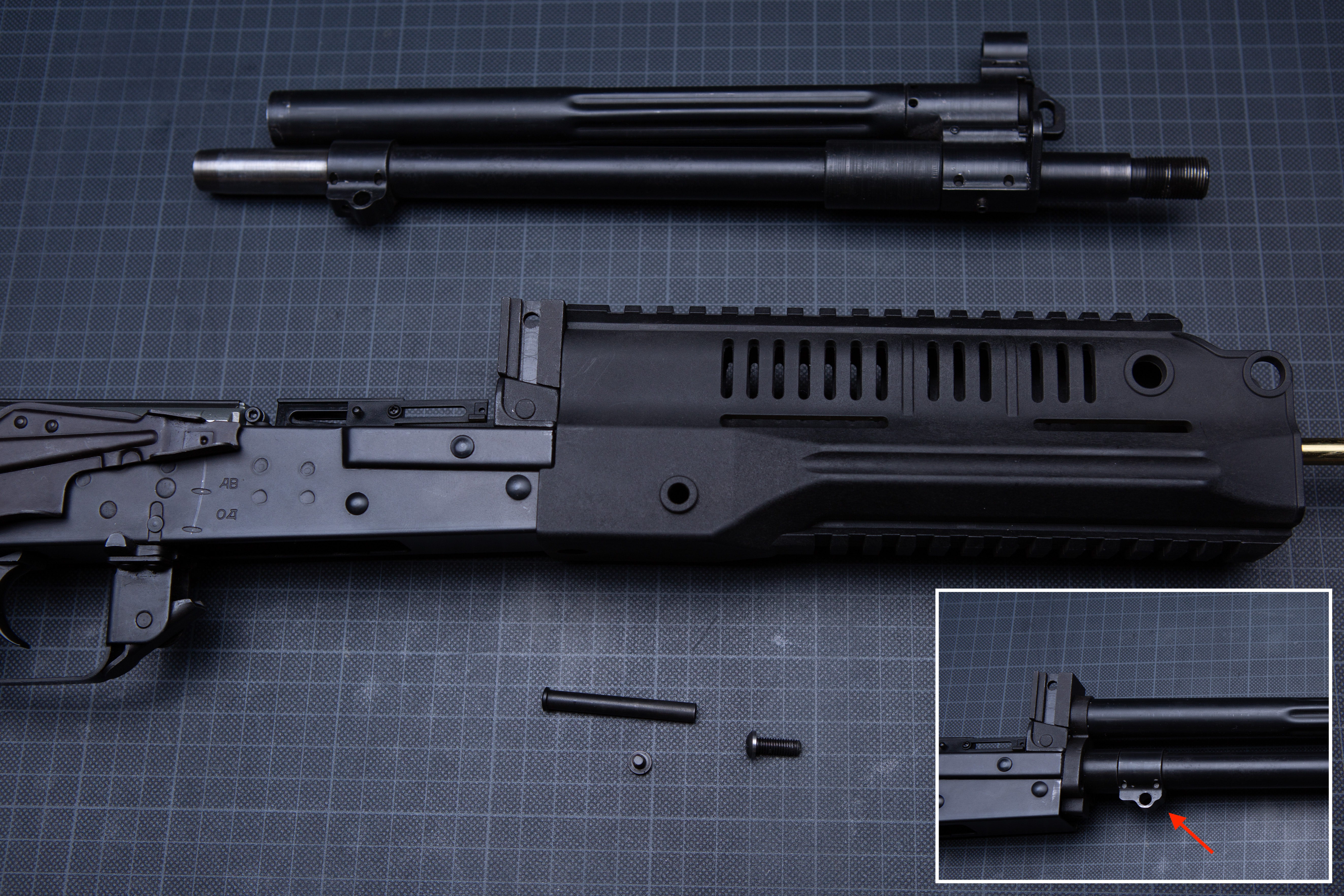 The pin is secured with a screw. After removing it from the handguard, you can slide out the outer barrel. And here we have two comments. First of all, if a longer outer barrel will appear on the market, then changing the length of the replica will be child's play. Secondly, the method of locking mechanism o the outer barrel in its mount (the mentioned pin) does not result a rigid connection. There is a small looseness of the outer barrel, which results in the aforementioned light clatter. The barrel is just inserted into the mount and the pin fastens it to the handguard rigidly connected to the receiver. The red arrow on the thumbnail below indicates the place where the pin passes through.