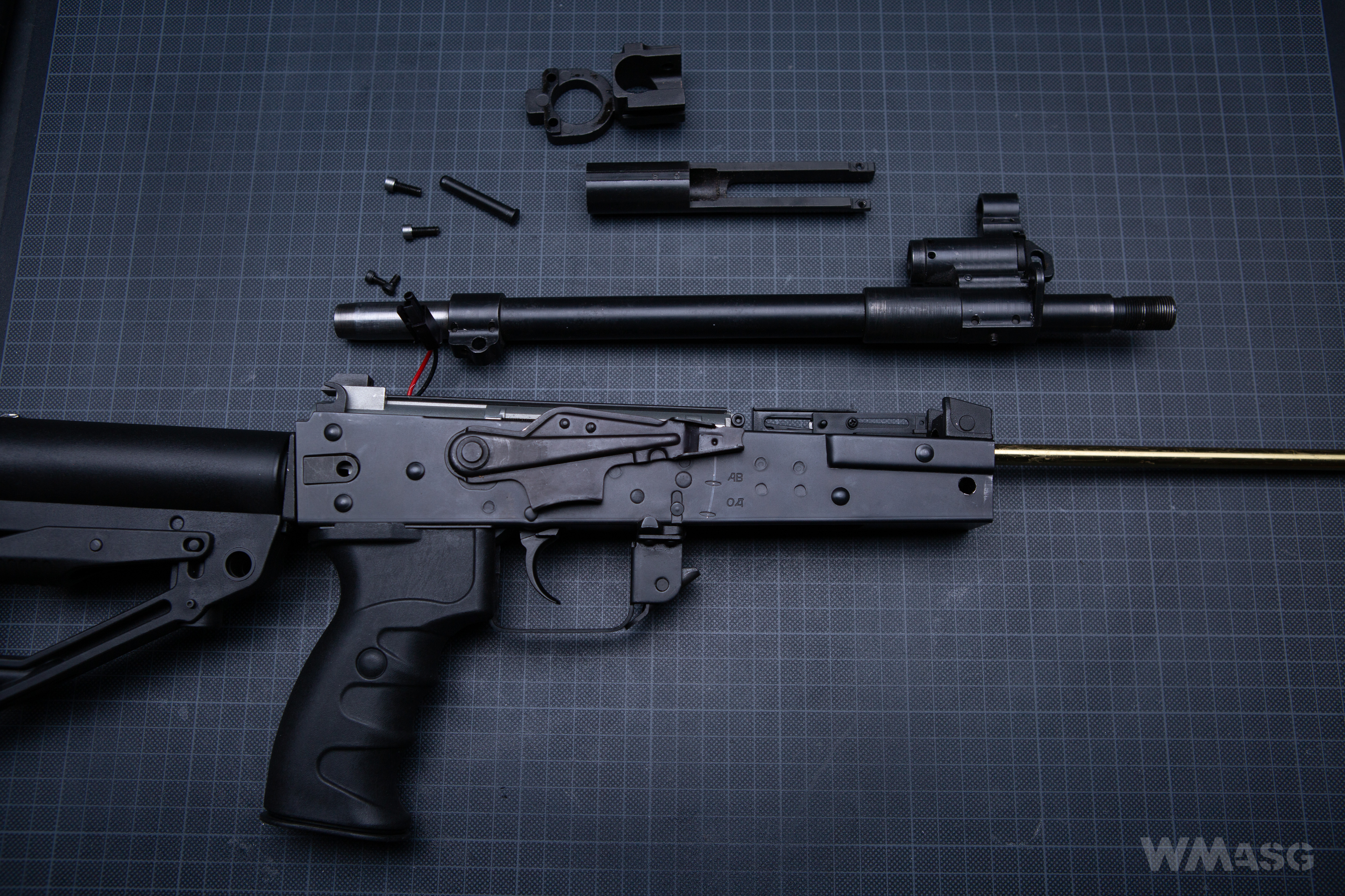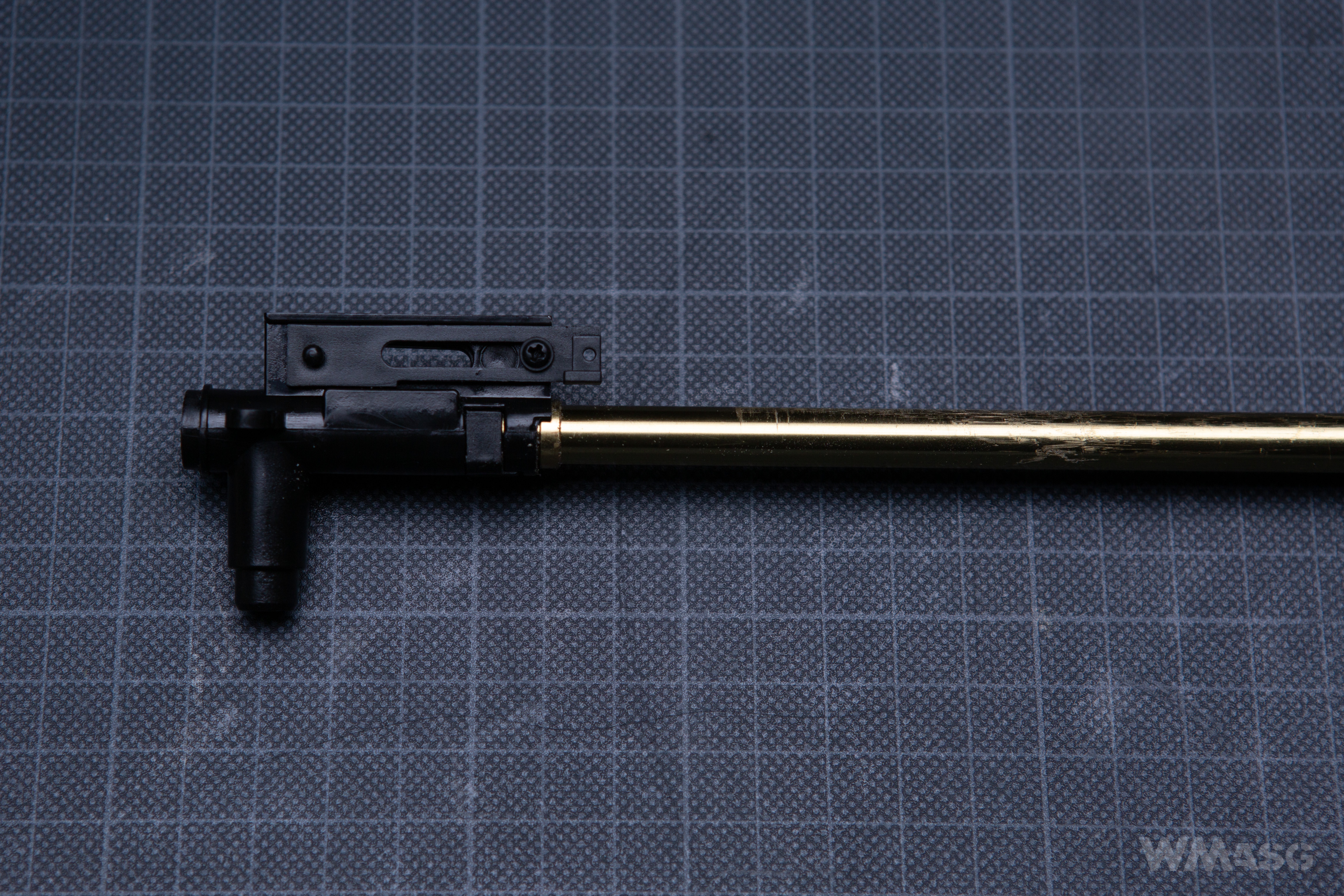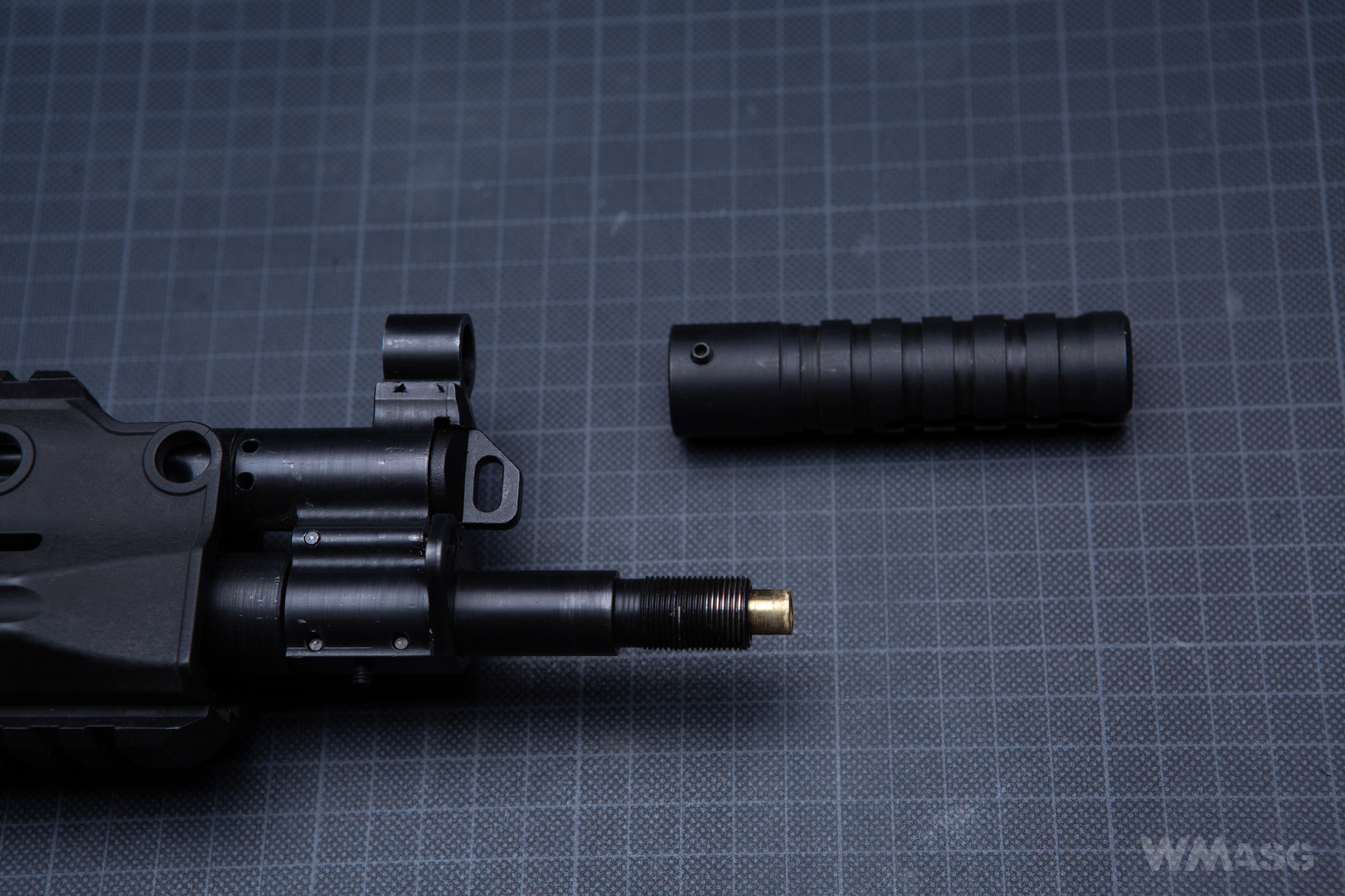 The pin is secured with a screw. After removing it from the handguard, you can slide out the outer barrel. And here we have two comments. First of all, if a longer outer barrel will appear on the market, then changing the length of the replica will be child's play. Secondly, the method of locking mechanism o the outer barrel in its mount (the mentioned pin) does not result a rigid connection. There is a small looseness of the outer barrel, which results in the aforementioned light clatter. The barrel is just inserted into the mount and the pin fastens it to the handguard rigidly connected to the receiver. The red arrow on the thumbnail below indicates the place where the pin passes through.