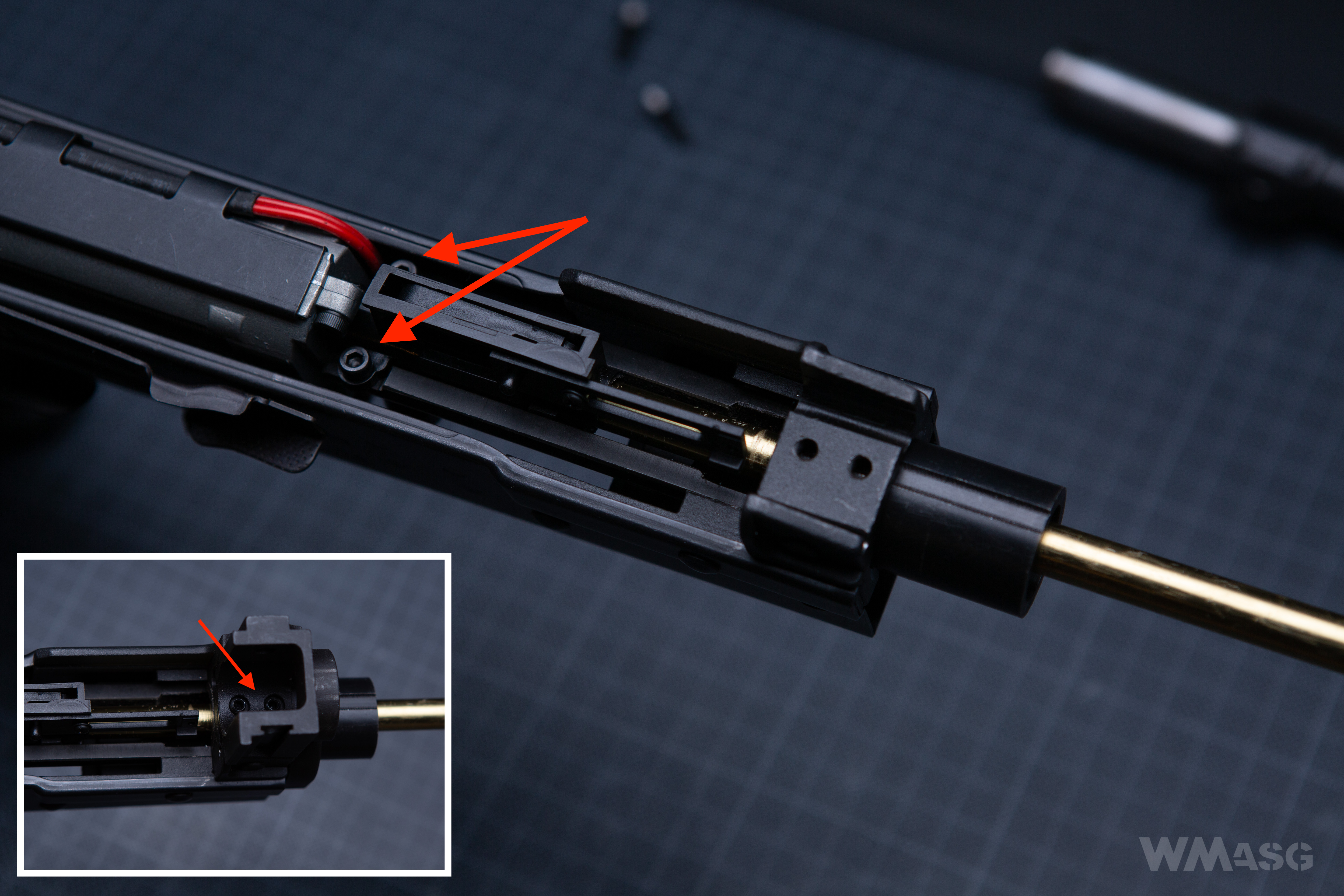 The HopUp chamber fixing element can be removed by unscrewing the 2 screws marked on the thumbnail and the screws holding the chamber.