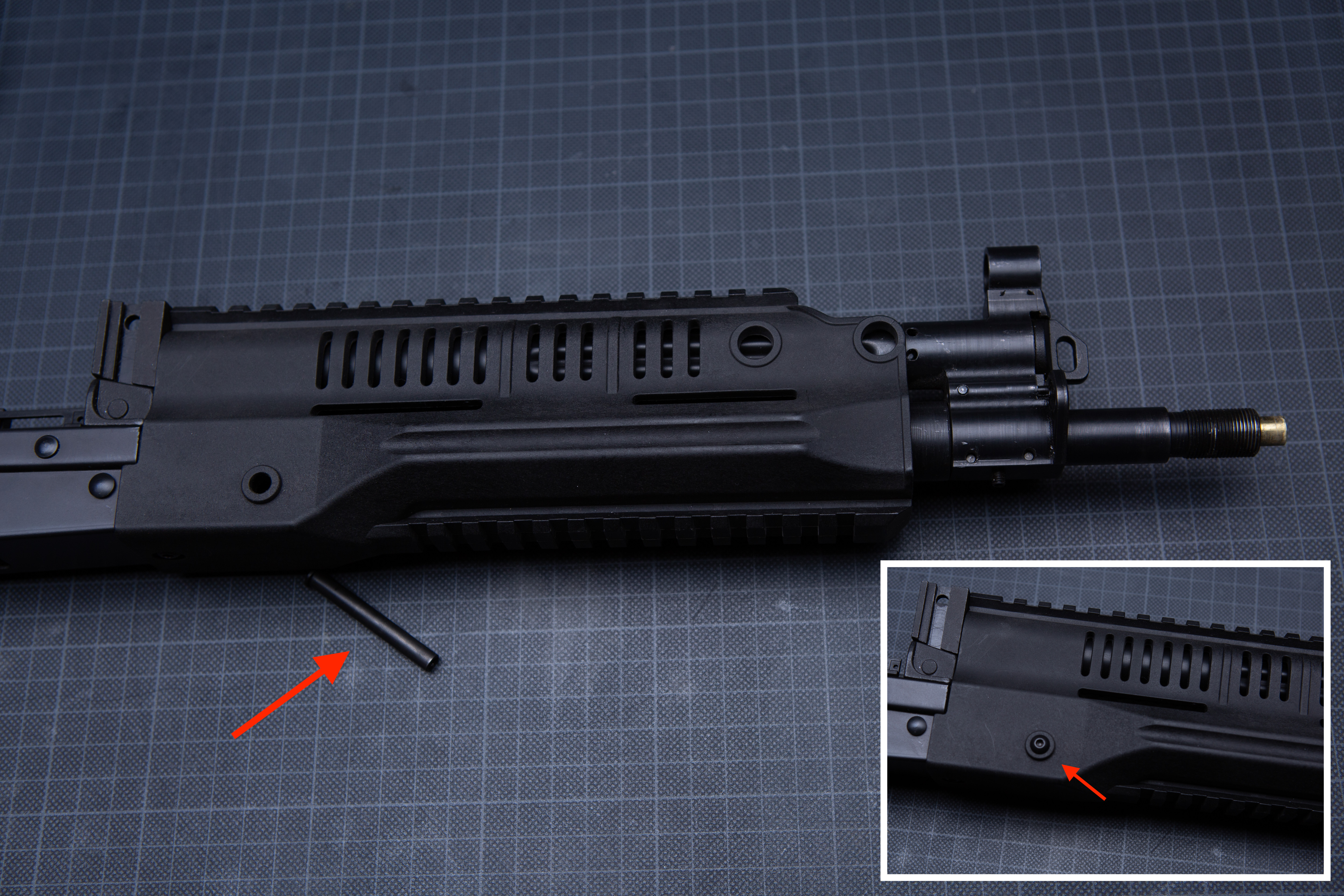 Disassembly of the handguard requires unscrewing the bottom mounting screw and taking out the pin passing through the replica's receiver.