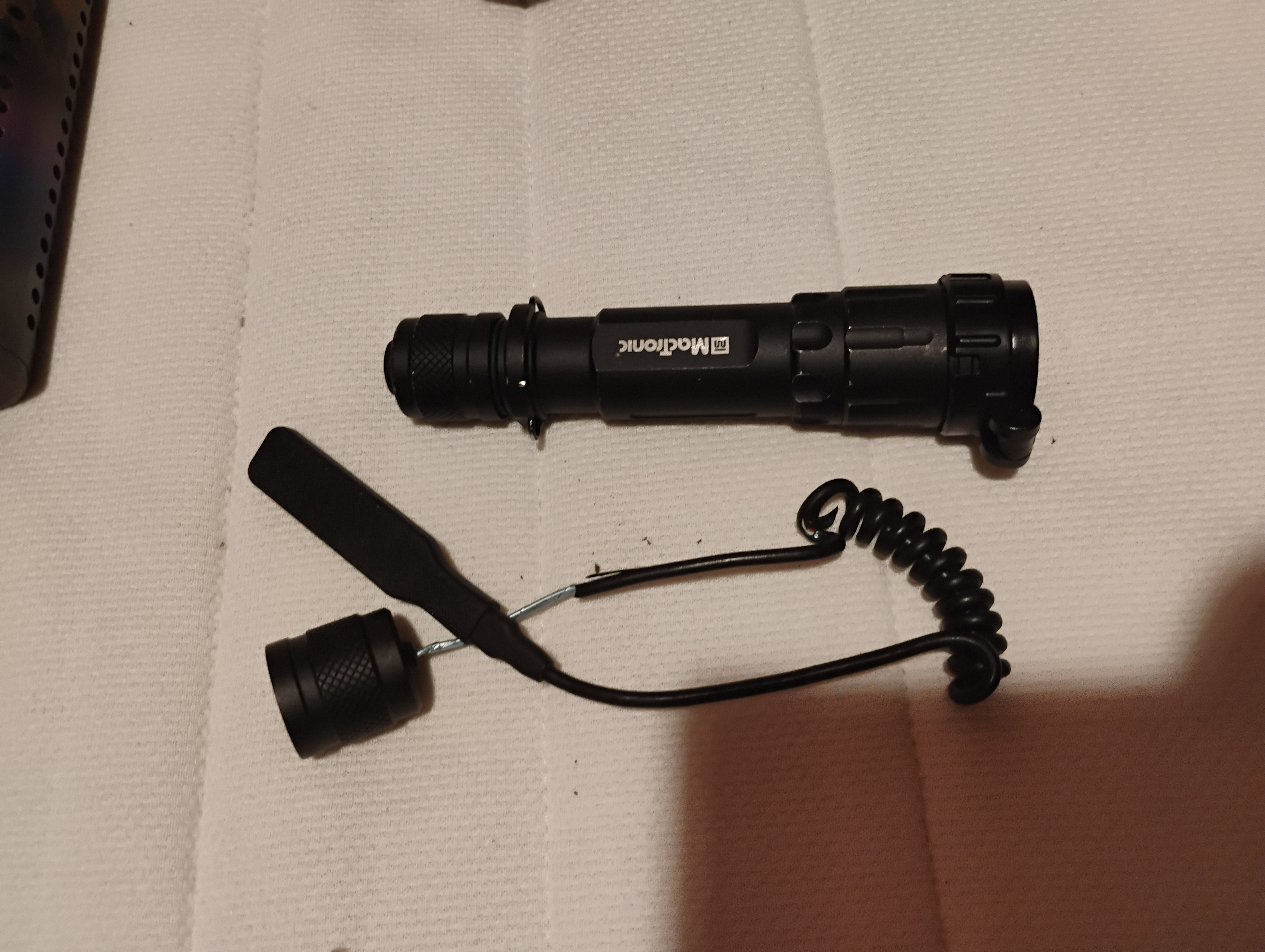 Latarka mactronic (na 2x cr123) plus przycisk na przewodzie gratis (brzydki ale działa)