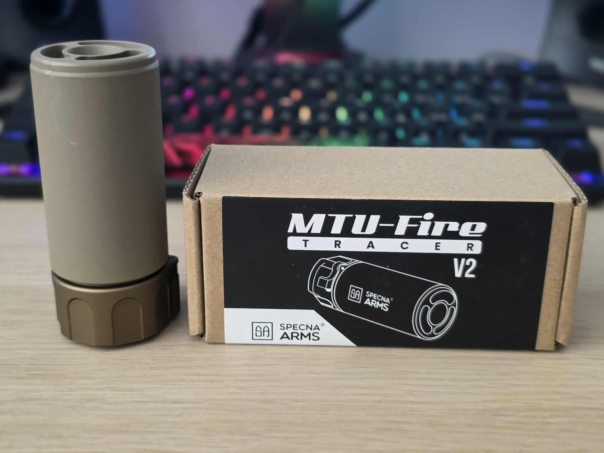 Tłumik Specna Arms MTU-Fire V2 został wyposażony w zielone diody UV LED (5W), które pozwalają na naświetlanie kulek tracer. Ponadto ma funkcję imitacji płomienia wylotowego. Korpus tłumika wykonano z lekkiego oraz wytrzymałego aluminium. Jego kształt przypomina wielofunkcyjne urządzenie wylotowe do broni palnej. Został wyposażony we wbudowany akumulator litowy ze wskaźnikiem poziomu baterii. Ładowanie możliwe jest za pomocą dołączonego kabla micro-USB. Tłumik ma również funkcje: oszczędzania energii (wyłącza urządzenie po 40 minutach bezczynności) oraz Quick Charge (5 minut ładowania pozwala na naświetlenie ok. 1000 kulek).