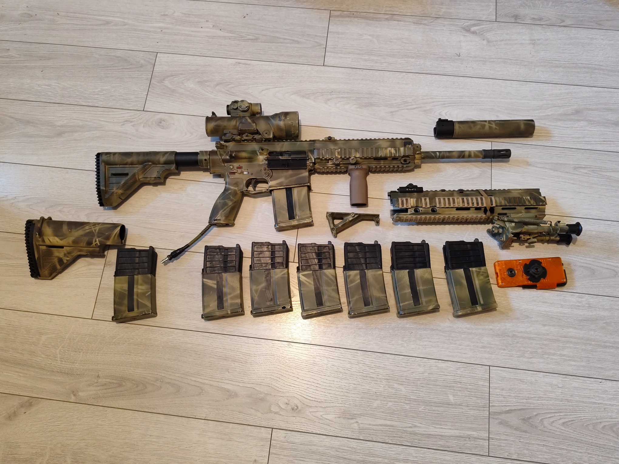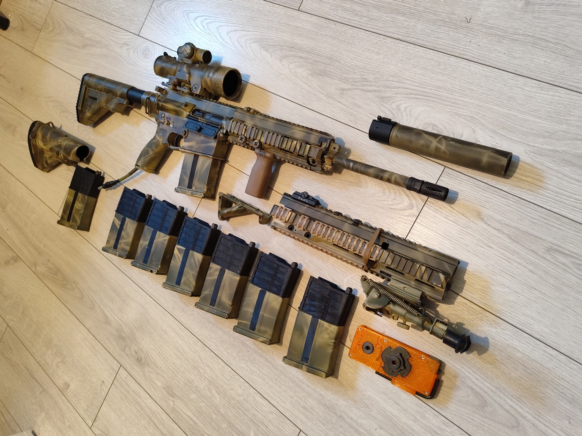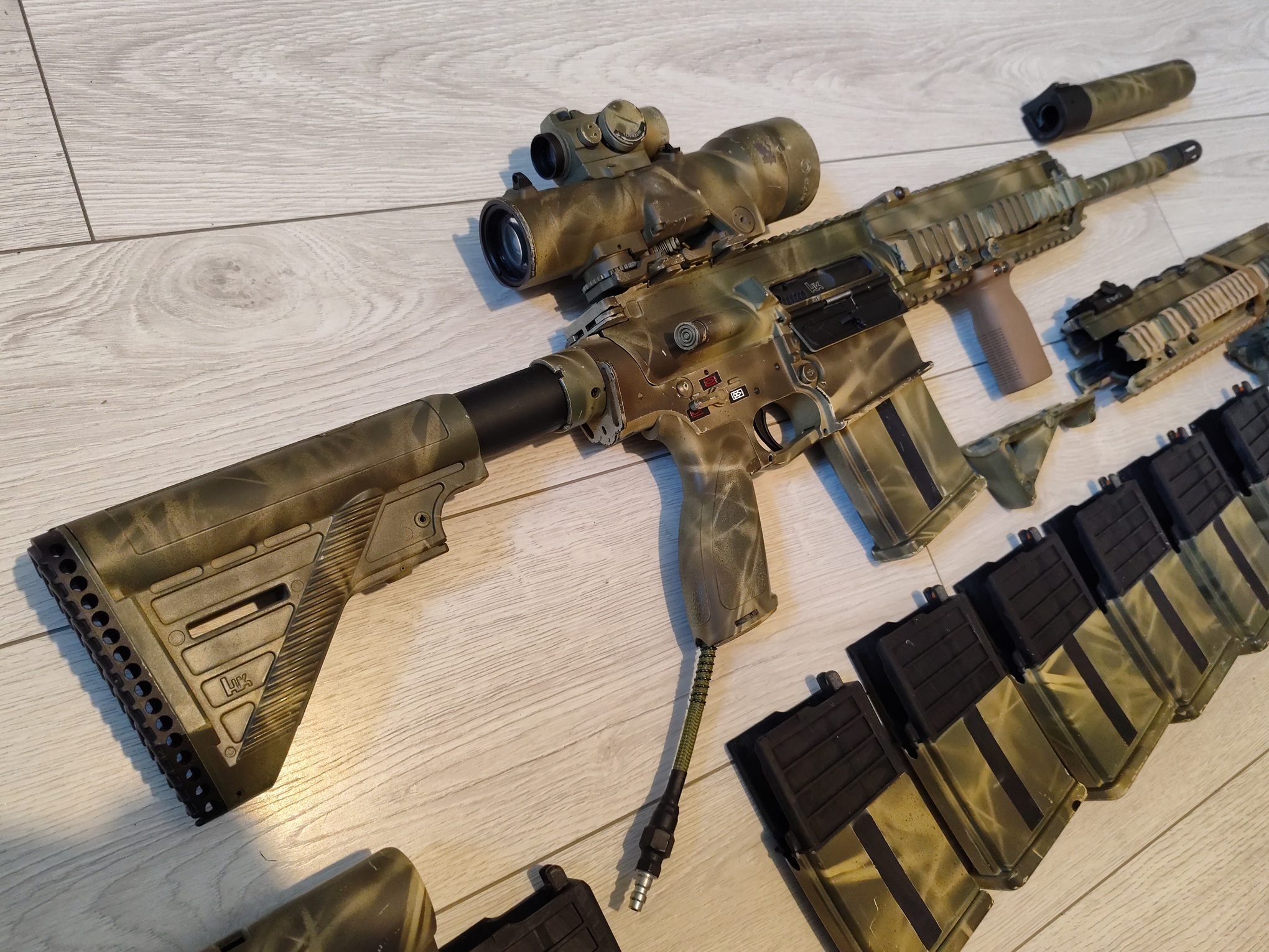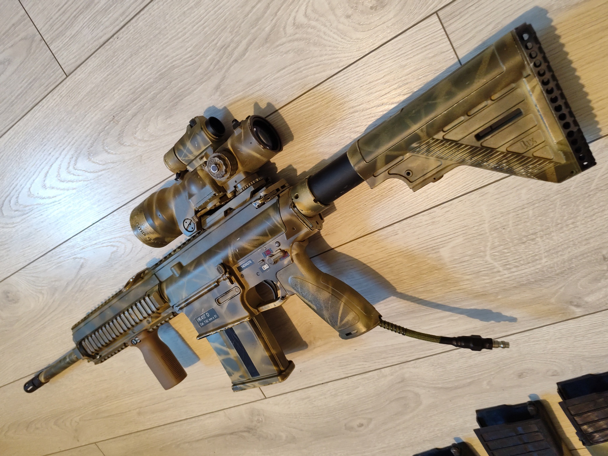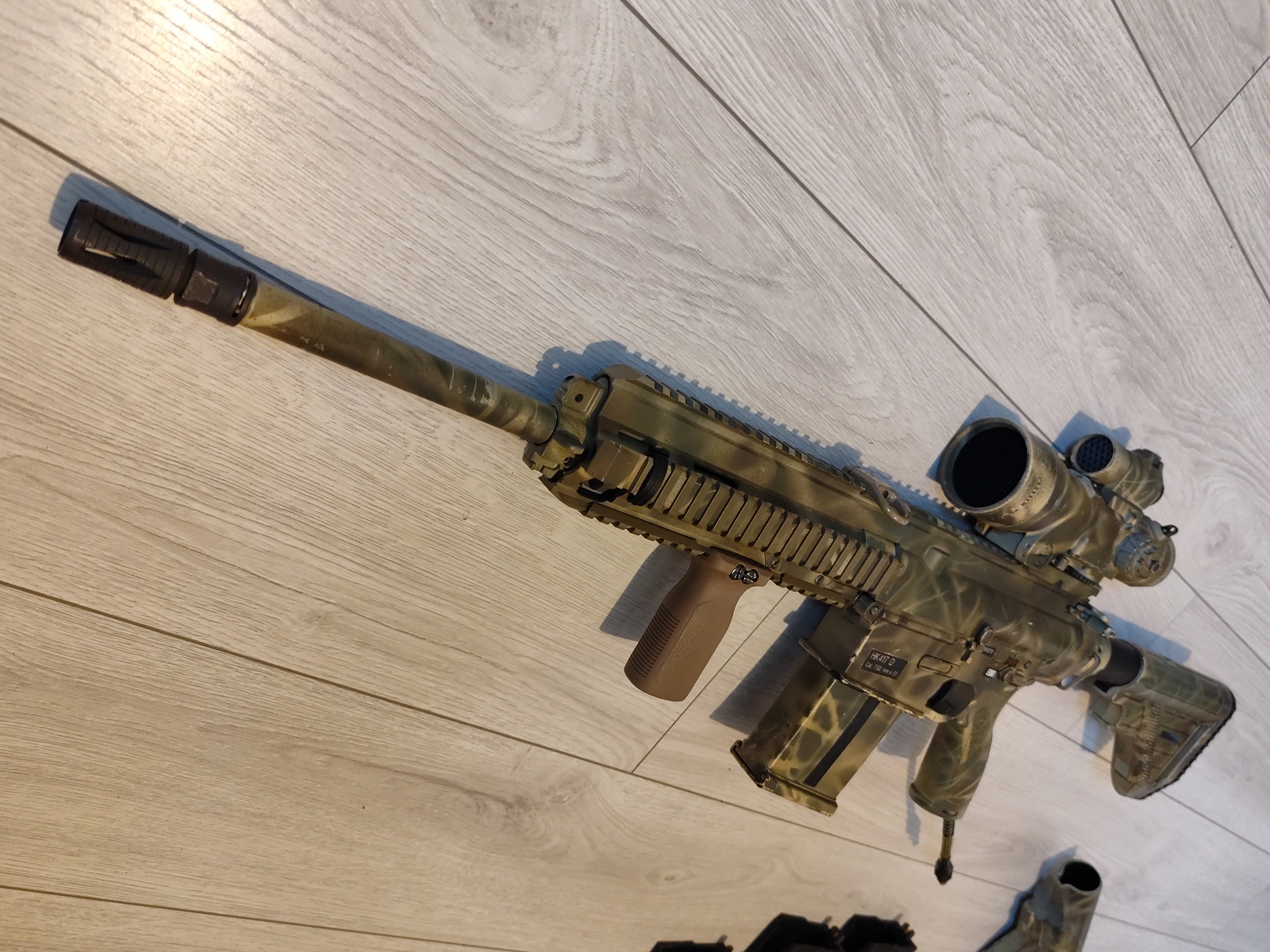 Witam, mam na sprzedaż moją osobistą prywatną replikę HK417 w bogatym zestawie z wieloma dodatkami. Na początek odnośnie samego karabinu. To karabin VFC HK417 Recon GBBR, z 16" lufą, obecnie w konfiguracji G27 (krótka szyna RIS). Generacja 1 podniesiona do gen 2, to znaczy: - Regulacja hop up od przodu, śrubą w bloku gazowym, komora gen 2 ze stalowym dystanserem, - Upper receiver gen 2, wzmocnione ucho tylnego pina, - Powiększony zatrzask rączki przeładowania gen 2, - Chwyt HK battle grip bez poprzeczki na palce (jak w gen 2, oryginalny VFC), Replika zasilana jest HPA przez konwersję Frog Engineering, gen 1 (generacje konwersji różnią się od siebie tylko łatwością montażu, działają tak samo). Jest po tuningu wewnętrzym i zewnętrznym, ma zamontowany: - NPAS VFC, - Lufę 6.01 Ra tech, 410mm, - gumkę hop up Modify X range 65 deg, - buffer anti bounce back Hepaestus, - oryginalny crown nut VFC do prowadnicy kolby, jak do kolb slim line, - Stalową płytkę zawieszenia pod prowadnicę kolby Crusader, - Stalowy barrel nut Z-parts, - Stalowy obustronny selektor Z-parts, - Kolbę slim line KWA do HK417 ze stalowym pinem blokującym pozycję, Dodatkowo w zestawie ma następujące części: - Długa szyna VFC RIS Recon razem z dwójnogiem typu Harris i przyrządami mechanicznymi, - Tłumik dźwięku Rotex III, QD, z drukowanym wkładem który trochę redukuje dźwięk wystrzału (zauważalna różnica w lesie z większych odległości), - Oryginalna kolba HK417 SF VFC, ale z wypukłą stopką VFC. Oryginalna wklęsła od palnej widoczna na zdjęciach poszła sprzedana osobno, - 8 magazynków FMAG 417 V1, pojemność 30 kulek, w pełni sprawne, nieuszkodzone, - Nową nieużywaną szybkoładowarkę Frog Engineering V2.4, - Oryginaly Magpul PTS AFG, - Chiński Magpul RVG DE, - Drobnicę widoczną na zdjęciach - panele na RIS, ucho montazu, klipsy na kable na ris Karabin i wszystkie akcesoria są pomalowane w tym samym stylu farbami FOSCO. Jak widać to bardzo bogaty zestaw, wszystko co może być potrzebne do używania karabinu. Przesmarować, podpiąć ciśnienie i można strzelać. Karabin może być zasilany maksymalnym ciśnieniem 150 psi, z regulatorów high flow (dla poprawnej funkcji). Nie ma full auto (zasady DMR). Moc którą można ustawić NPAS to sporo ponad 3J także można go zrobić na 2.8J, można na 2.6J. Ja używałem kulek 0.48g, 2.6J na Mini Redline SFR, 120 psi. Zasięg - dla osoby która potrafi można spokojnie trafiać ludzi na 120m. Ten własnie karabin brał udział w obronie bazy ASAF na Salamandrze 2022 gdzie oddawał celne strzały na taką odległość. Kto był ten widział ;-) Przebieg - 12k kulek. Dużo czy mało? Moje drugie HK417 ma przebieg 30k i działa jak nowy, te karabiny w gen 2 są praktycznie niezniszczalne. Celownik Specter z kolimatorem widoczny na zdjęciach nie jest w zestawie. Sprzedaję bo jak napisałem mam drugie HK417 w konfiguracji DMR i brakuje mi już miejsca żeby trzymać gdzieś te wszystkie karabiny, a muszę wcisnąć kolejne projekty. Ten stoi od dawna i się tylko kurzy. Od razu piszę że jestem całkowicie niezainteresowany jakimikolwiek wymianami. A jedyne co mogę sprzedać osobno to tłumik lub dwójnóg. Wartość całego zestawu to jakieś 6-6.5k zł. Natomiast z racji że jest on używany to cena za całość za którą wystawiam to 4200.