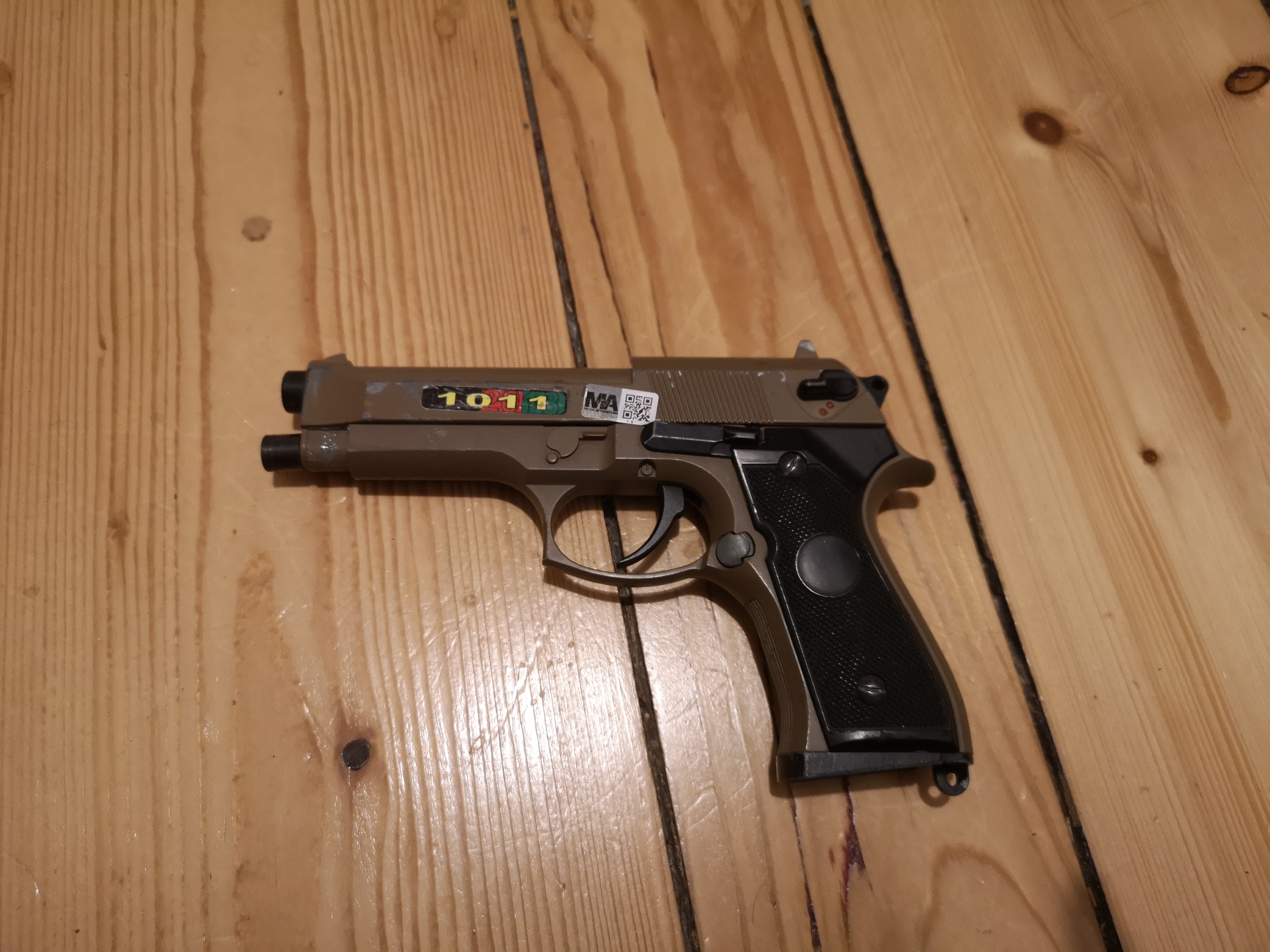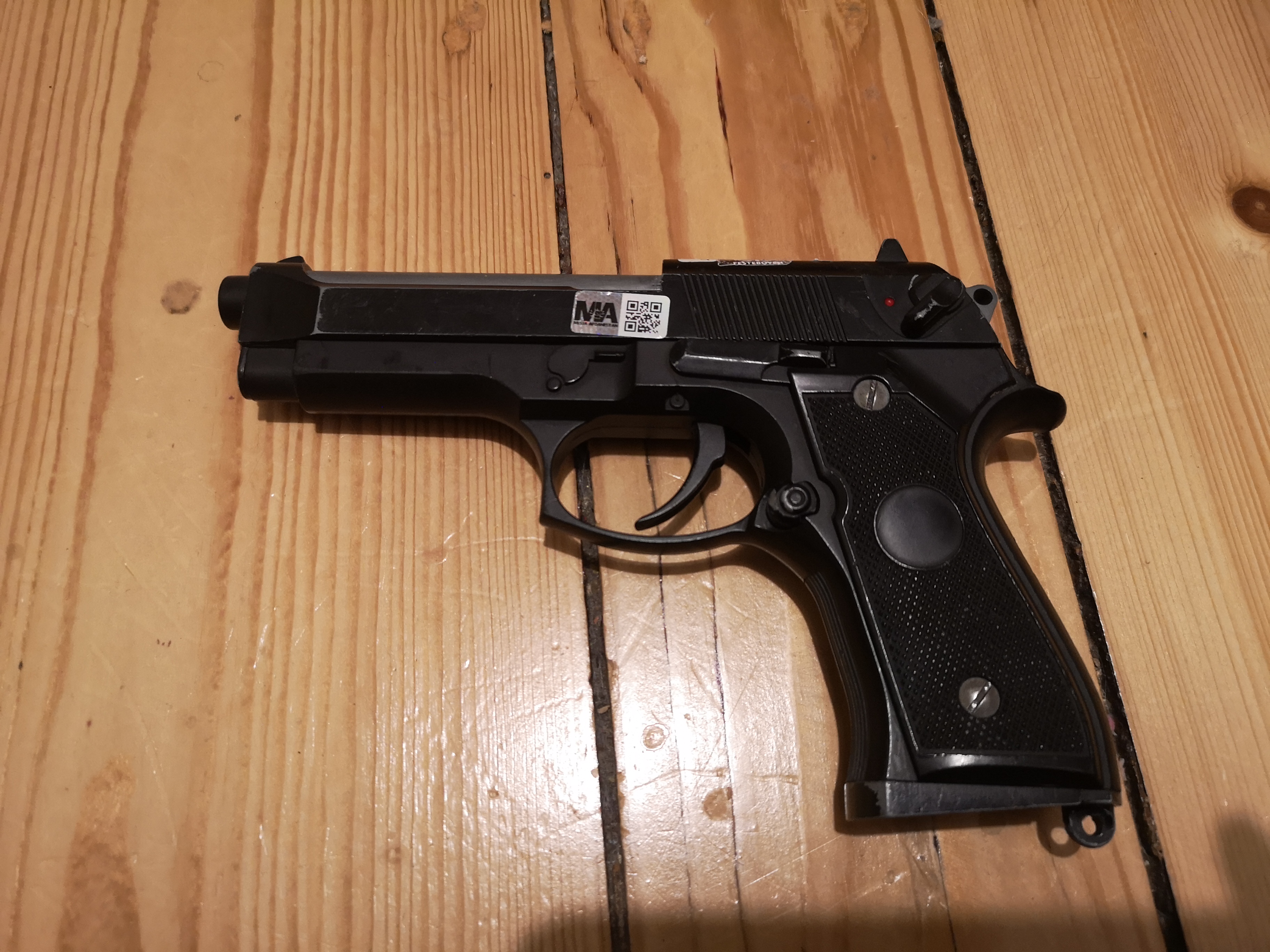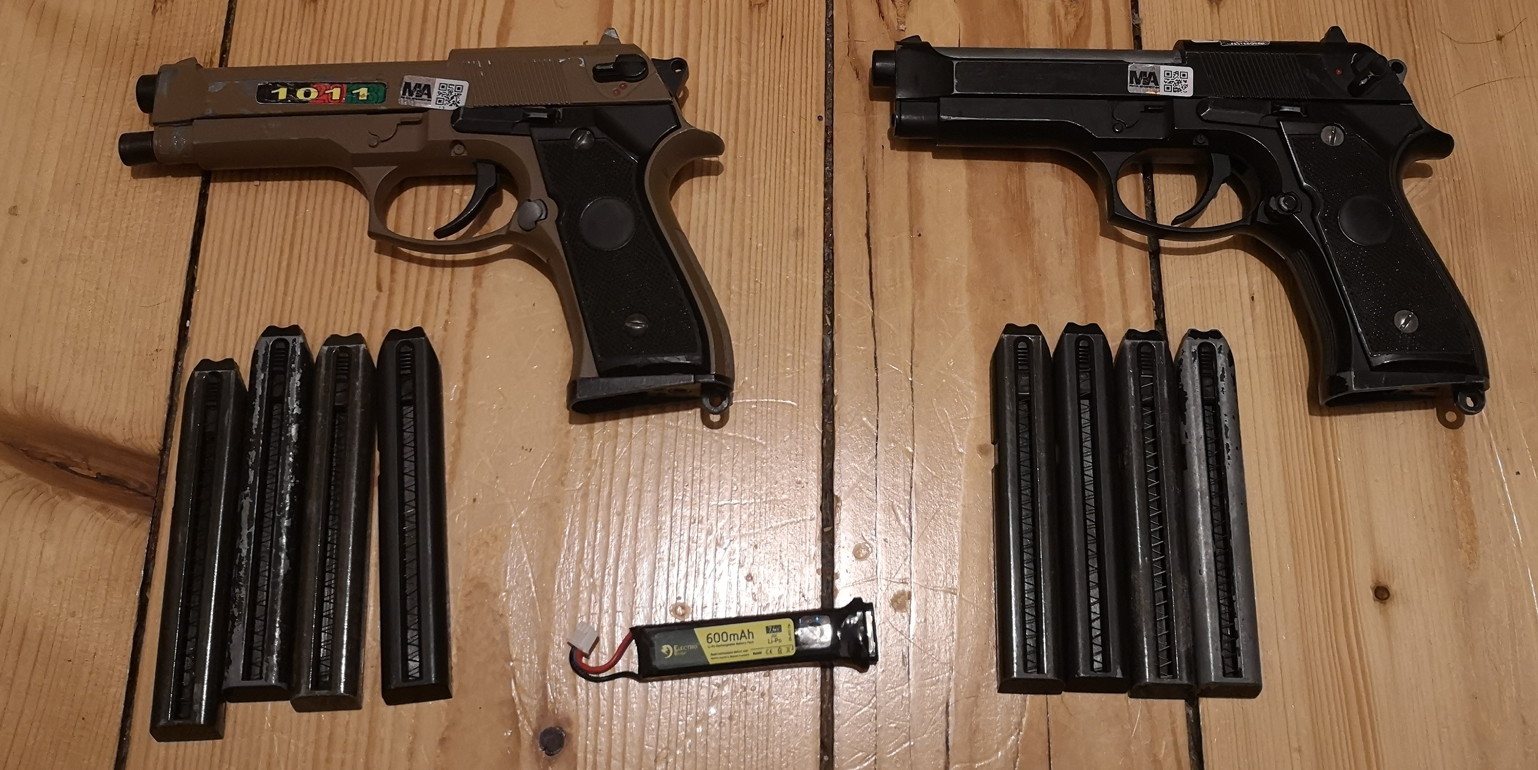 Na sprzedaż posiadam 2 beretty od Cymy. W obu urwały się z tylu oba ząbki trzymające pokrywę zamka. W piaskowej wstawiłem z przodu okrągłą nakrętkę a z tyłu do kurka dokleilem śrubkę trzymająca wszystko na miejscu. W czarnej nic nie zmodyfikowałem, oklejenie taśmą izolacyjną załatwia sprawę. Mechanicznie obie repliki w pełni sprawne. Baterii NiMh dodadawanych oryginalnie brak. Do każdej 4 magazynki w zestawie. Mogę sprzedać oddzielnie: piaskowa 70 zł, czarna 50 zł. Przy zakupie obu bateria ze zdjęcia gratis.