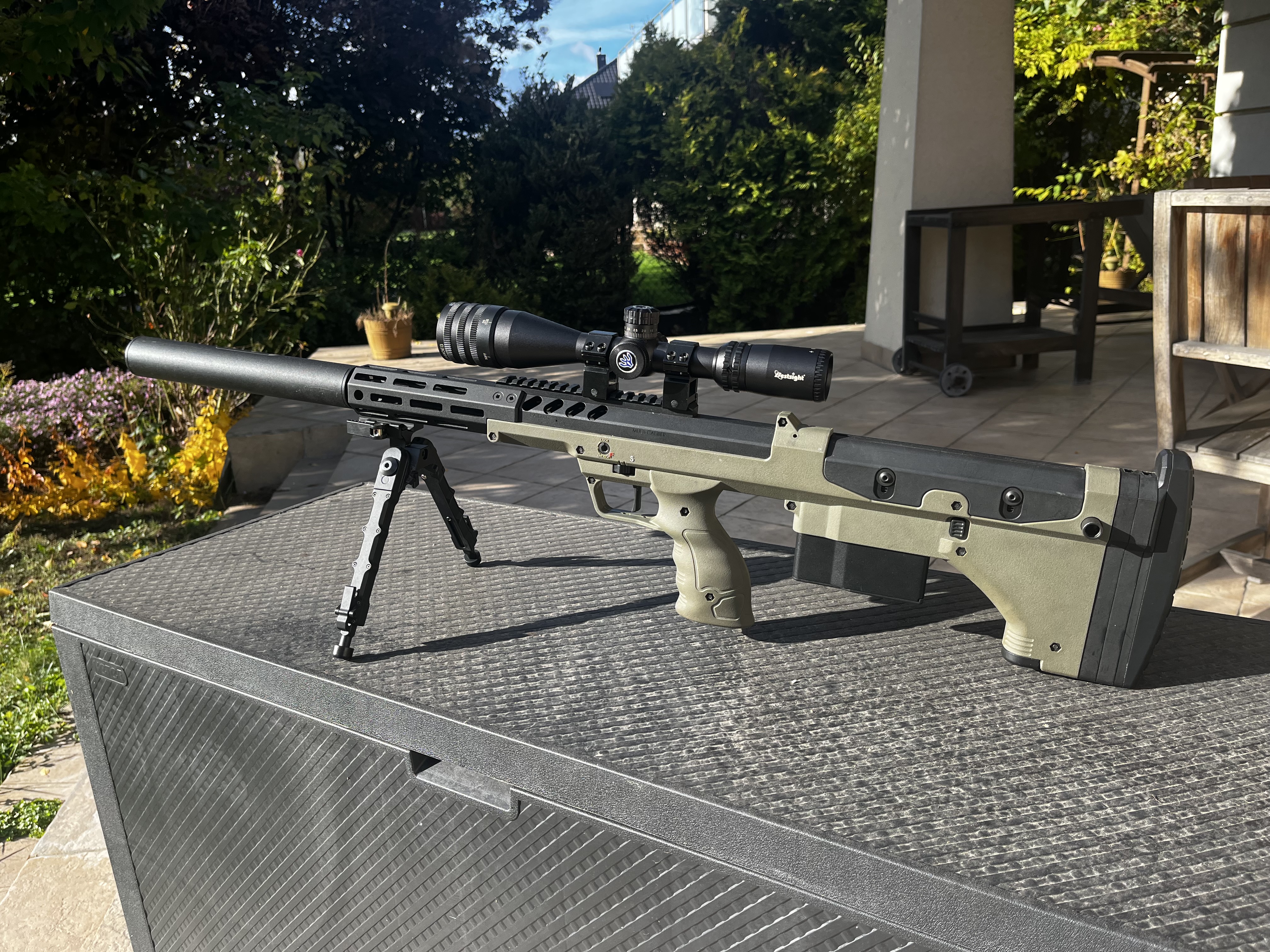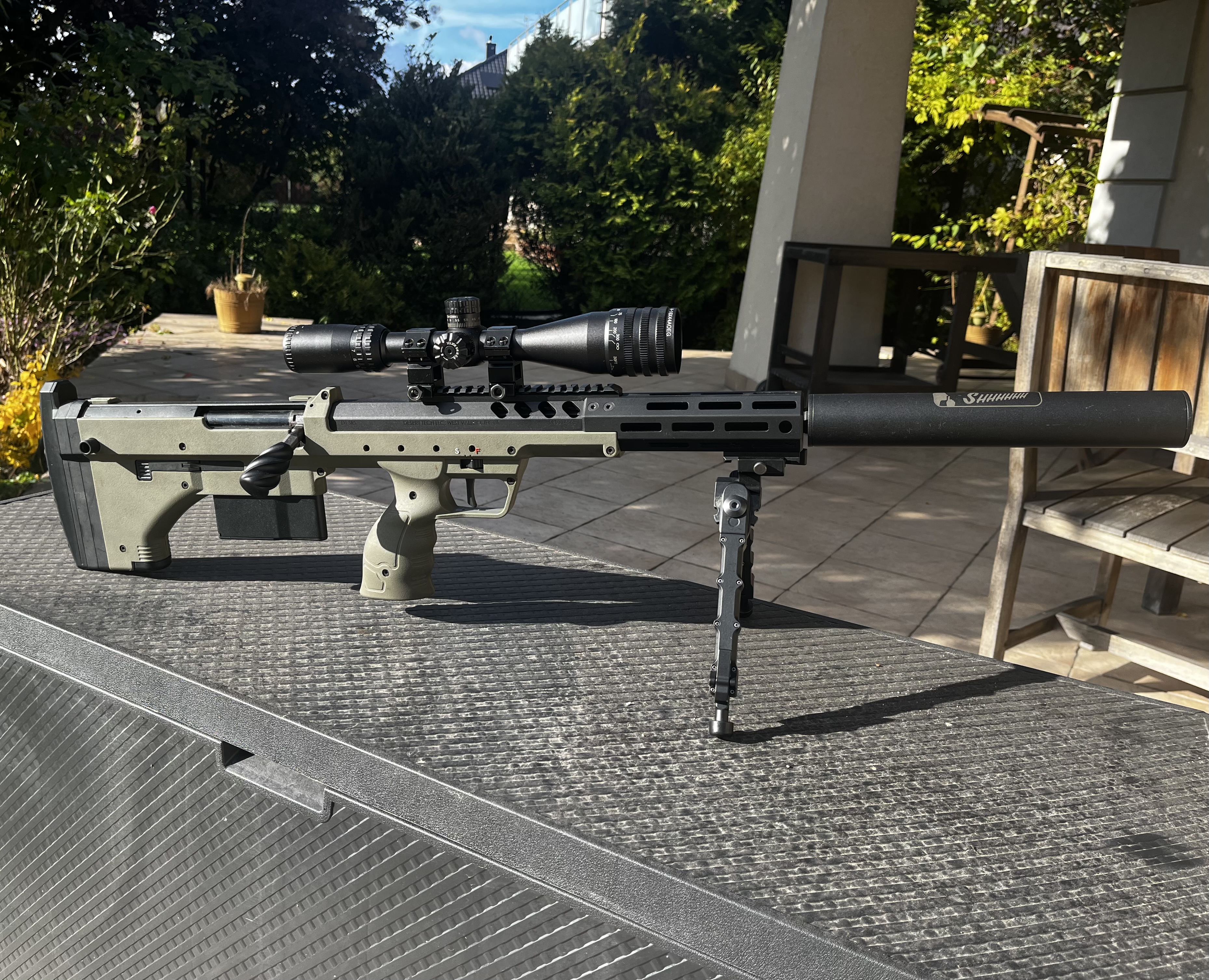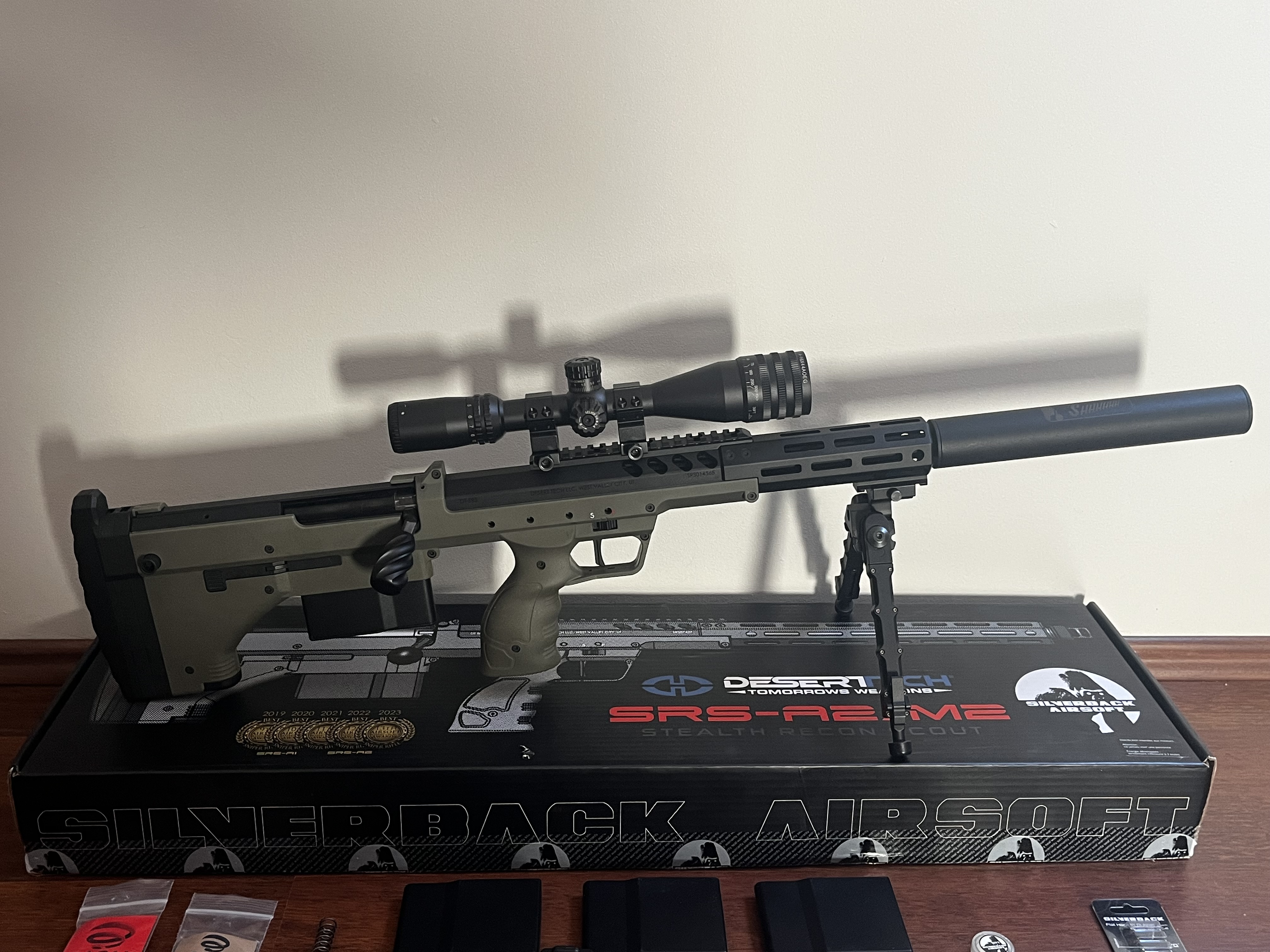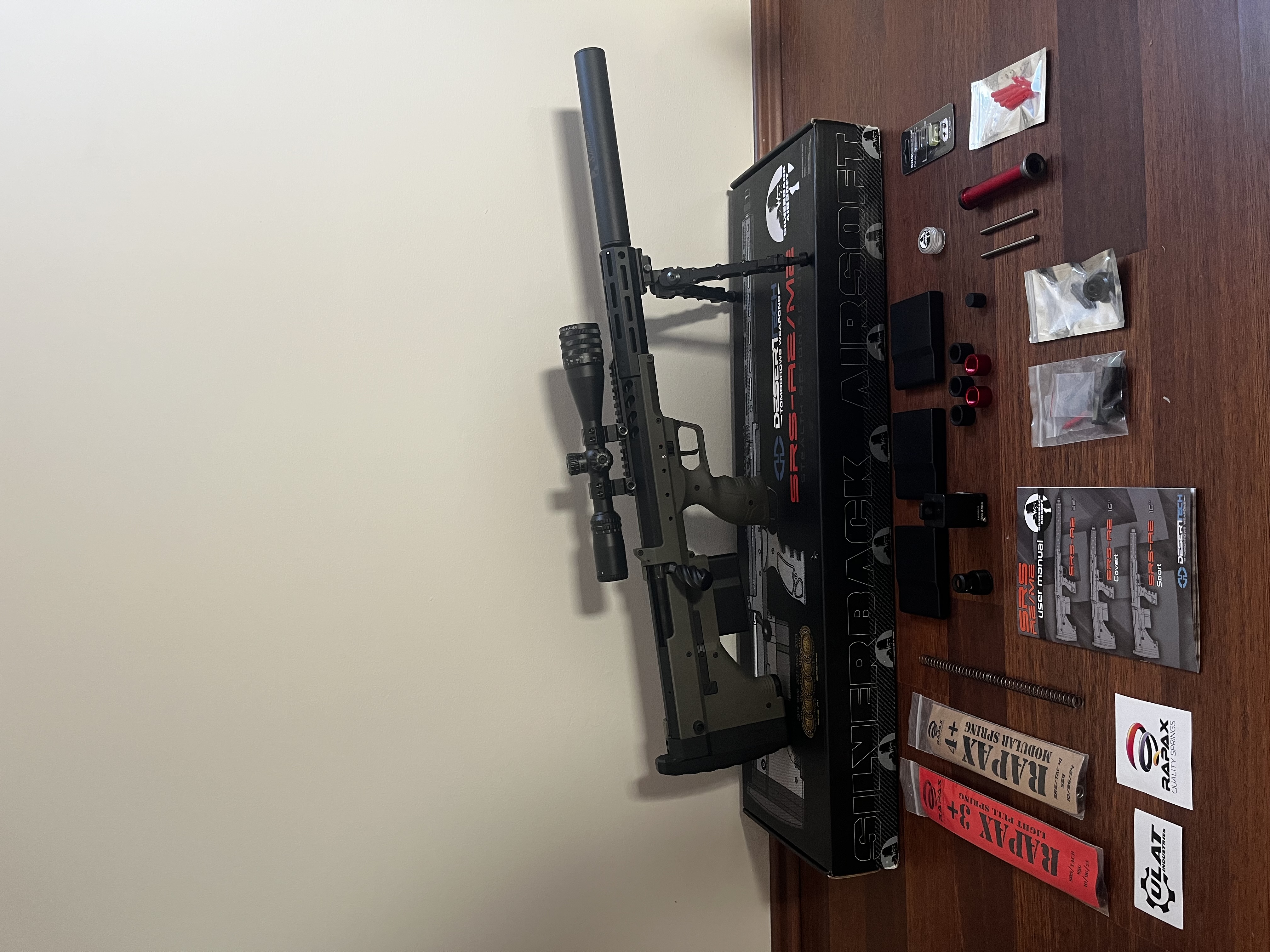 Na sprzedaż moje oczko w głowie replika karabinu desert tech od silverbacka. Kupiona na gunfierze. Jest w idealnym stanie zarówno mechanicznie jak i wizualnie. Replika jest jedną z najcichszych możliwych dostępnych na rynku przy okazji zaskakując zasięgiem. Jeśli chodzi o moc to w zależności od kombinacji można osiągnąć dziesiątki różnych ustawień, ale ja najczęściej strzelałem na 3J lub 3,5J (oba wyniki oczywiście na kulkach 0,48). Lista wymienionych elementów: -tłok o zmiennej masie (silverback) -głowica tłoka i trzy hamulce pneumatyczne (silverback) -komora hop-up (Maxx model) -trzy sprężyny 3J+, 4J+ (Rapax), m150 (airsoft pro) -gumka 70 zielona (silverback) -dystansery sprężyny wycięte przeze mnie na laserze + plastikowe od rapaxa -popychacze kulek 6szt. (Silverback do stalowych magazynków) Na zewnątrz: -trzy magazynki polimerowe (silverback) -magazynek metalowy (silverback) -luneta 4-16 X 44 (bestsight) -tłumik dl. 250mm, gr 40mm (tactical pro) -chwyt przeładowania twisted (silverback) Do zestawu dorzucam oryginalne pudełko, jego zawartość i wszystkie części które zostały mi po wymianach: -smar -komora -tłok i głowica -sprężyna -tłumik płomienia (niestety jest delikatnie porysowany) -oryginalny chwyt przeładowania -gumki oringi śrubki itp. Nie wspomniałem o dwójnogu ponieważ planuję go sobie zachować i o imbusach, które były w zestawie ponieważ mam ich całkiem sporo i nie wiem czy uda mi się zidentyfikować te dedykowane. Replika nigdy mi nie upadła i zawsze była regularnie czyszczona. Zapraszam do kontaktu i na próbne strzelanie.