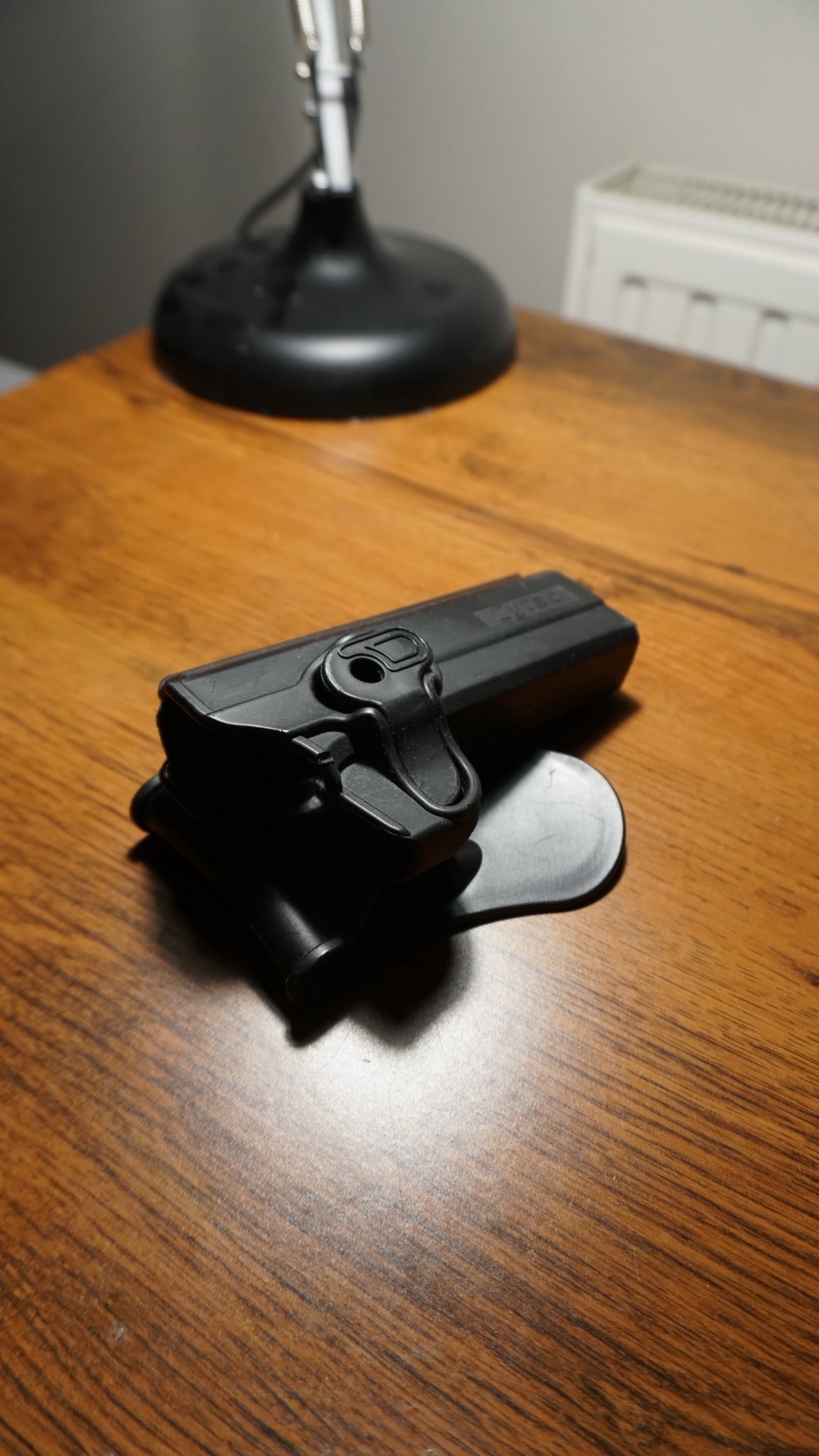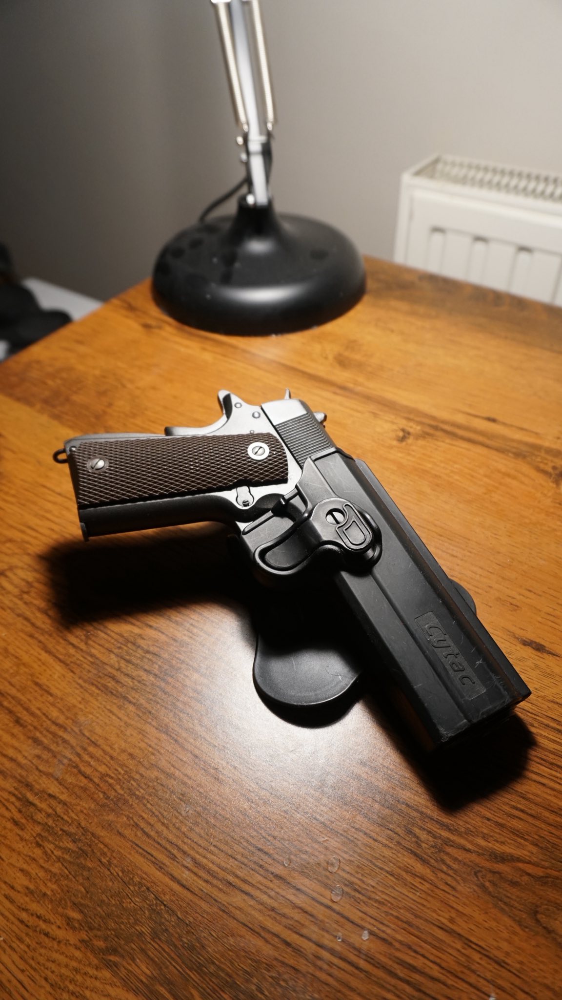 Replika w świetnym stanie używana kilkukrotnie. Cena repliki - 350 zł. Widoczne drobne przetarcia od noszenia w kaburze - mogę dorzucić za 20 zł. Na cześć 100-lecia 1911 roku KWC wprowadziło ten zupełnie nowy model, który radykalnie odbiega od zewnętrznego i wewnętrznego projektu poprzednich modeli KWC 1911. Cały pistolet jest wykonany z metalu i ma w pełni licencjonowane znaki handlowe Colta, dzięki czemu ten pistolet wygląda i jest bardzo realistyczny. W pełni metalowa konstrukcja z laserowo wytrawionymi znakami towarowymi Colt. Dane techniczne: -Co2 blowback -Materiał: metal -Długość: 22 cm -FPS: 328 FPS / 100 ms z 0,20 gr. -Hop Up regulowany - Pojemność magazynu 24 kulek Replika na licencji Colta.