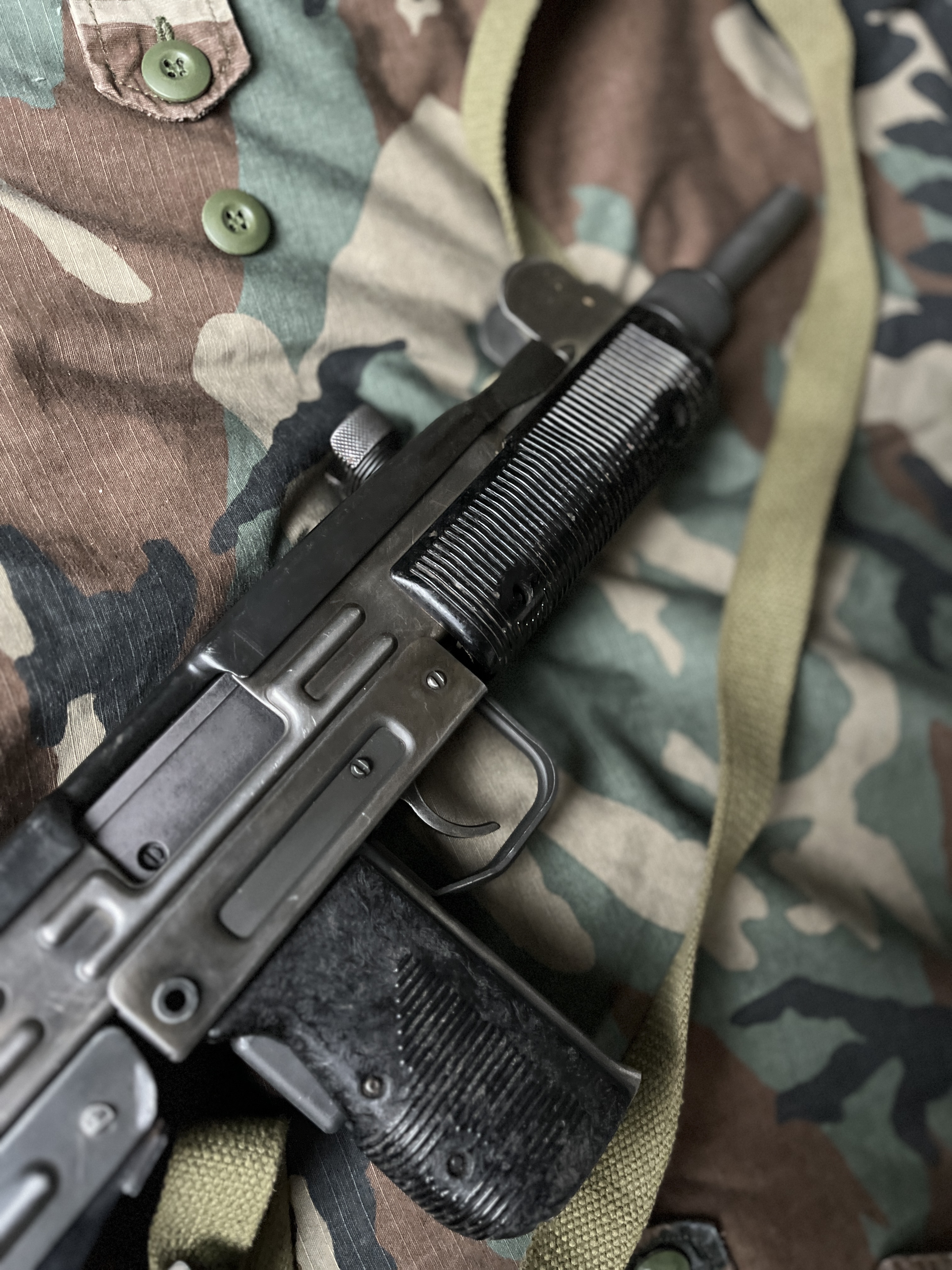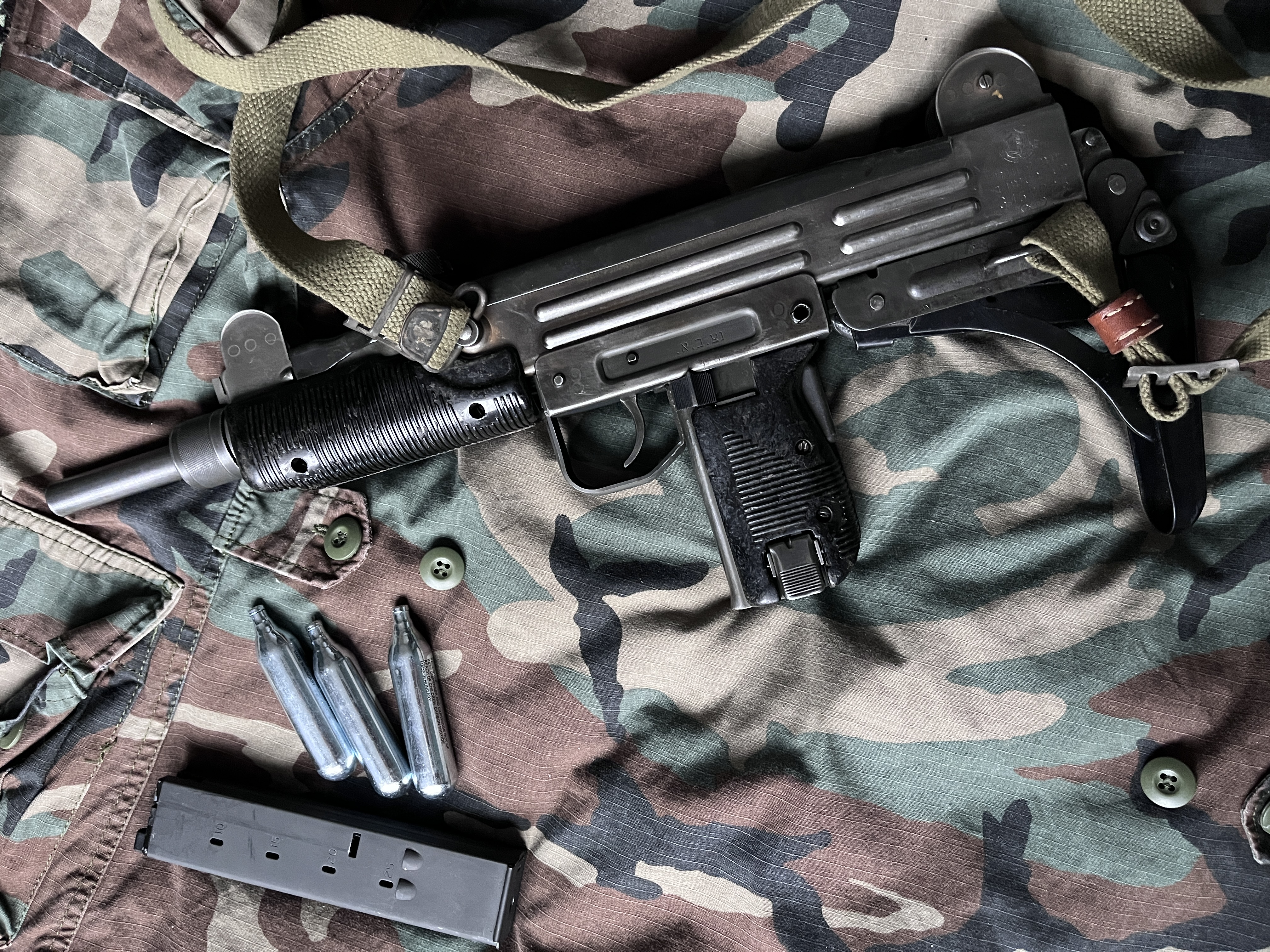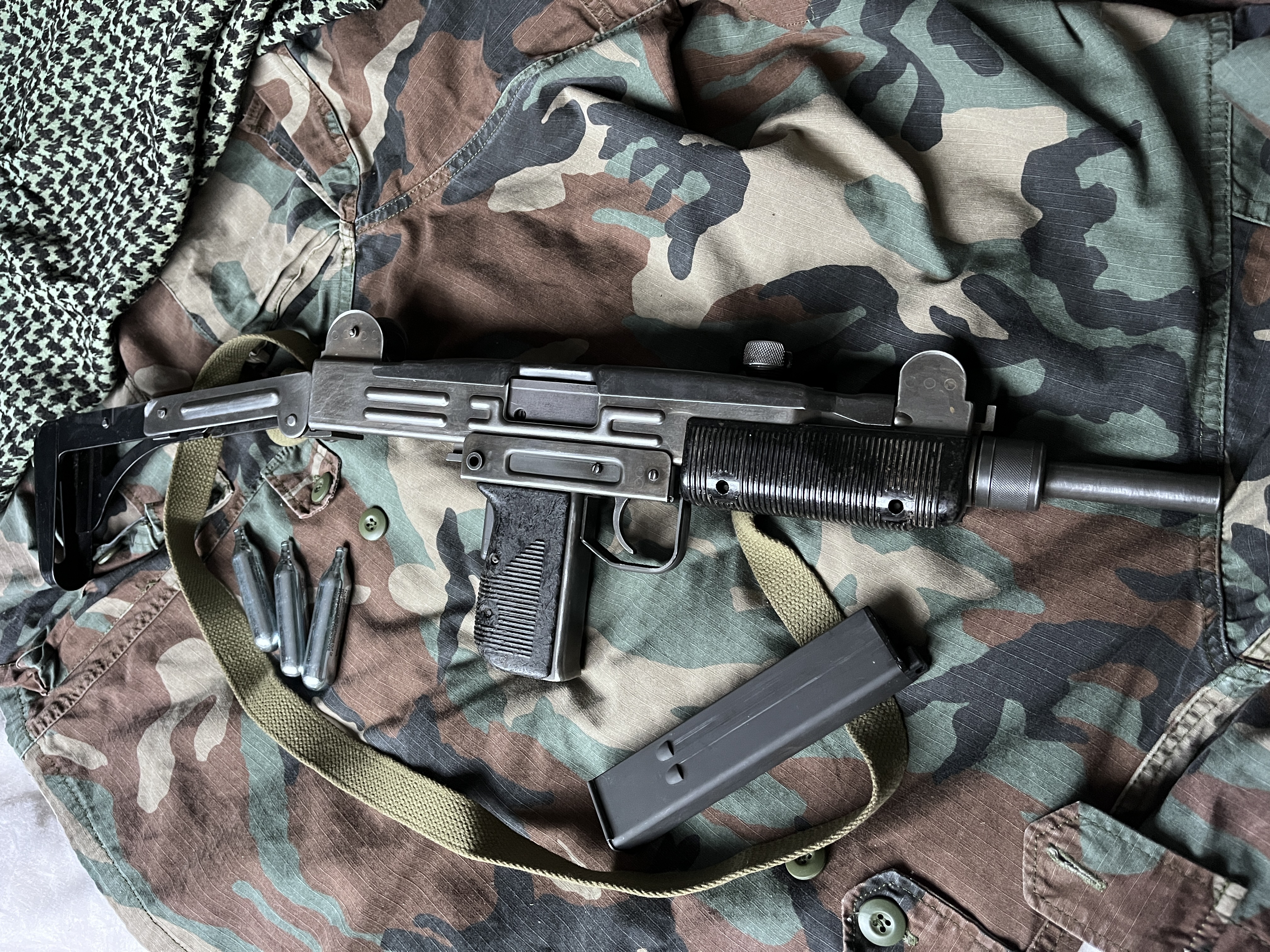 Tytuł: Northeast Uzi CO₂ — replika, nieużywana, realistyczna Opis: Replika na CO₂ — stan kolekcjonerski (nigdy nieużywana na strzelankach Asg). Wszystko działa. Większość części zewnętrznych to elementy z oryginalnej broni — bardzo realistyczna. DM w sprawie szczegółów.