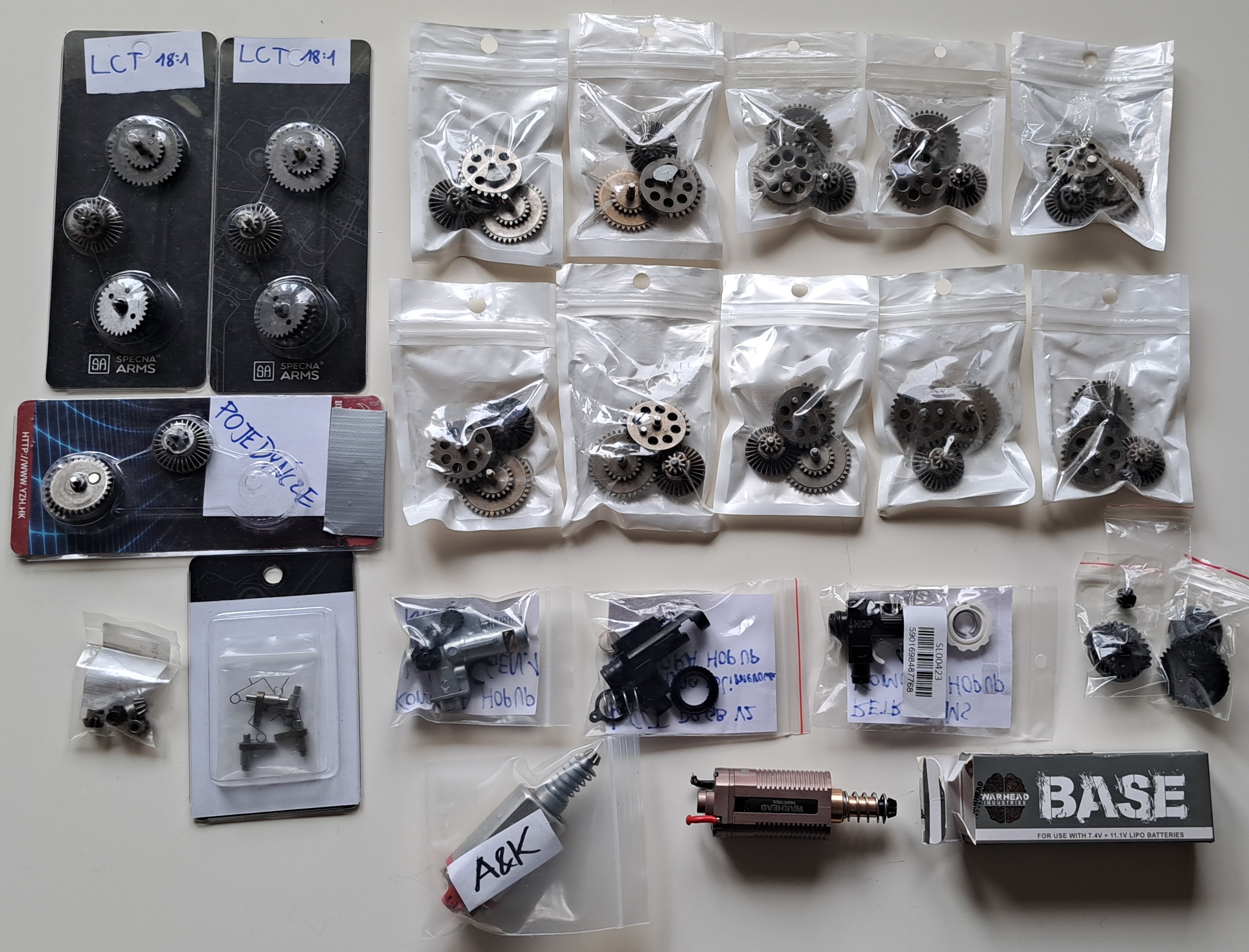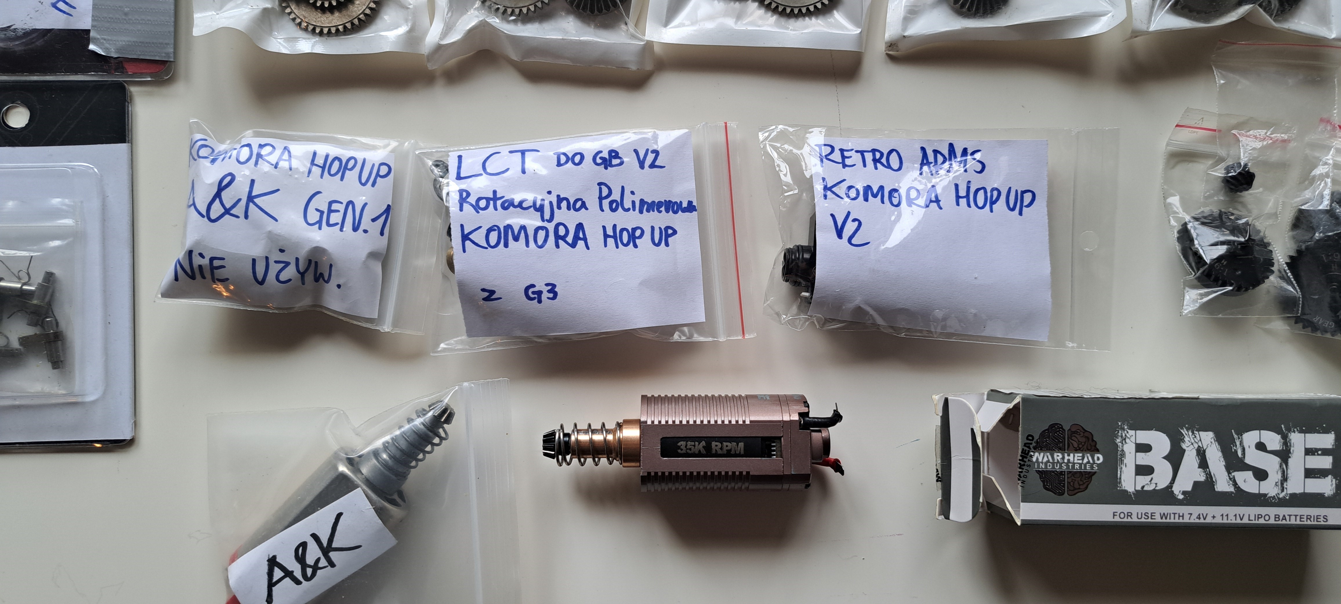 Pytania proszę w sms na nr. 787-614-881 Witam na SELL idą części większość jest nie używana Pobranie tylko z kwotą zabezpieczającą 50zl Możliwy odbiór w Iławie wysylka 17,- Zębatki LCT (60,-) Zębatki zestawy (30,-) Zębatki sztk. (10,-) Zębatki silnikowe (5,-) antireversale (15,-) zębatki full helical 16:1 SOLINK (125,-) silnik WARHEAD 35k rpm (350,-) silnik A&K (30,-) komora hopup RETROARMS Rotacyjna (60,-) komora hopup LCT Rotacyjna (50,-) komora hopup A&K gen.1 (20,-)