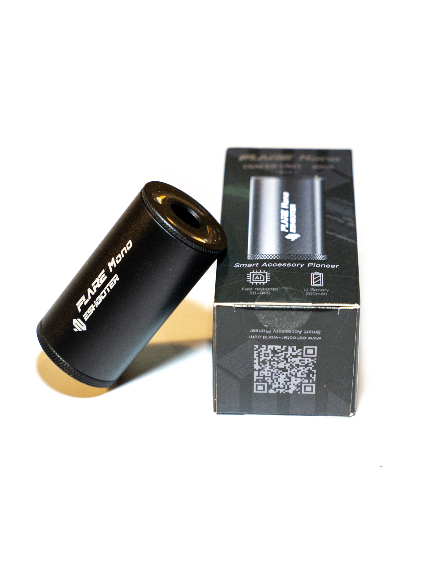 Nowy naświetlacz kulek Tłumik Tracer E-Shooter Flare Mono - Black Kupiony w zeszłym roku, nigdy nie użyty Cztery diody LED RGB umożliwiają oświetlanie kulek w kolorze zielonym i czerwonym. Czujnik o wysokiej częstotliwości z szybkim przesyłem danych wspiera działanie urządzenia przy szybkostrzelności przekraczającej 50 RPS. Wbudowany akumulator o pojemności 200 mAh, ładowany za pomocą portu USB-C, zapewnia do 6 godzin pracy oraz tryb czuwania trwający nawet do 3 miesięcy. Pyłoszczelność i wodoodporność na poziomie IP64 umożliwiają pracę w różnych warunkach. Zastosowany czujnik wibracji aktywuje urządzenie po wykryciu wstrząsu, a automatyczne przejście w tryb uśpienia następuje po 5 minutach braku aktywności. adapter z 14 mm CCW na 11 mm CW umożliwiający montaż na pistoletach oraz kabel USB-C do ładowania akumulatora.