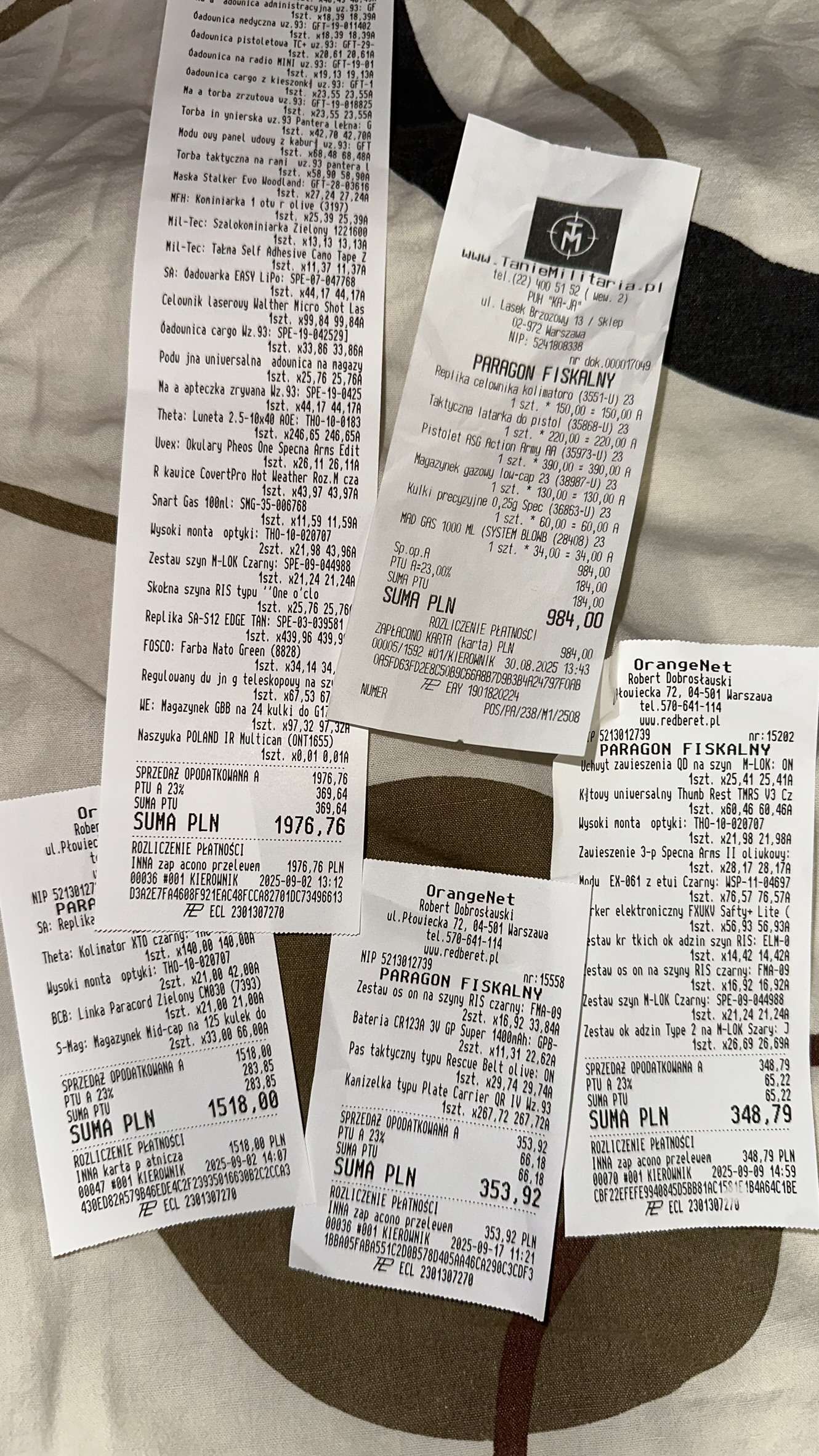 Sprzedam cały sprzet który jest nowy ponieważ nie dojechałem nigdy na strzelanke :) po za m4 do cqb, po krotce wymienie co wchodzi w jego skład: Wszystko oczywiście nowe, paragony są. zwykłe bądź elektroniczne dowody zakupu. Nigdy nie było na strzelance. Aby się zbędnie nie rozpisywać wszystko na ostatnich zdjęciach. a raczej mniejszość ponieważ dużo rzeczy kupowałem online Czego nie ma na paragonach a warto dopisać to np. 2 baterie lipo 1100 i 2200 11.1v i ładowarka. Magazynki do pistolów aap łącznie 4 sztuki, do mki cqb 3 sztuki, do mki dd 4 sztuki. Rękawiczek są 3 pary czarne M długie, czarne s bez palców, tan M długie. Okulary 2 pary. Dużo akcesoriów nie zostało wykorzystanych typu osłony szyny ris, dodatkowe ris na mlock, okładziny RIS, montaże skośne np. pod celownik laserowy czy mniejszą optykę. Dużo akcesoriów szpejowych również nie zostało" założonych na kamze czy umundurowanie takich jak ładownice mniejsze/większe, ładownice na magazynki czy też akcesoria typu granat błyskowy, smoke, odłamkowy( sprężynowe granaty), klamry, zapinki, naszywki itp. Pas taktyczny posiada apteczke, torbe zrzutowa, miejsce na 2 magazynki pistoletowe, torbe inżynierke, ładownice na granat odłamkowy/smoke, kolejną ładownicę wielofunkcyjną. Spokojnie sprzętu jak i wyposażenia jest na 2 graczy, w sumie 3 bo i snajpa w tym ghillie suit dla snajpera i kapelusz we wzór wz93 którego również nie widać na zdjęciach. AAp01 posiada latarke, kolimator nimrod red, laser, tracer, powiekszoną dzwignie przeładowania cnc, magwell cnc. AAp01c posiada kolimator. M4 DD posiada laser, ir, latarke w pq, latarke SF, kolimator, magnifajer, tracer i mnustwo akcesoriów CNC od magpul. M4 cqb posiada kolimator red dot na podwyższonym montażu, laser oraz latarke. Snajperka posiada doskonałą nie "najtańszą" lunetę ze wszelkimi regulacjami ręcznymi w czasie bitwy i podświetlanym krzyżem. Pasy taktyczne są 4 na wszystkie repliki w tym jeden dodatkowy 3 punktowy z możliwością szybkiego przepinania. Jest rownież kamerka nagrywająca w 1440p 60 fps z baterią wytrzymującą 1.5h. We wszystkich akcesoriach są nowe baterie jak i zapasowe w kilku sztukach. Posiadam wszystkie pudełka itd. Odbiór osobisty, Leszno Mazowieckie. Telefon do mnie: 573 323 120 Cena za całość 5.800 PLN Pisać, pytać, dzwonić.