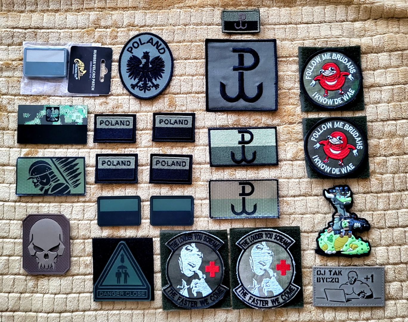 Na sprzedaż zestaw 23 naszywek. Wszystkie w świetnym/bardzo dobrym stanie, niektóre nowe. Licytacja od 1 zł., bez ceny minimalnej. W zestawie: - naszywka Kampfhund Husarz Gen. I - naszywka Combat-ID z flagą Polski w kamuflażu Pencott Greenzone - 4 x różnych rozmiarów naszywki „Polska Walcząca” - owalna naszywka z orłem i napisem „Poland” - naszywka Taiwangun „Smok airsoftowego wzgórza” – edycja limitowana (obecnie niedostępna) - naszywka Combat-ID „Oj tak byczq” - naszywka Punisher - 2 x naszywka (ATACS-FG i olive) „Follow me brudahs…” - 2 x komplet naszywek PVC Helikon z flagą Polski - 2 x komplet naszywek z flagą Polski i napisem „Poland” - naszywka PVC „Danger Close” - 2 x naszywka dla sanitariuszy/na apteczkę „The louder you scream…” Uwaga! Licytacja wyłącznie przez Allegro: https://allegrolokalnie.pl/oferta/bcm-naszywki-pencott-flaga-polska-smok-taiwangun-punisher-helikon