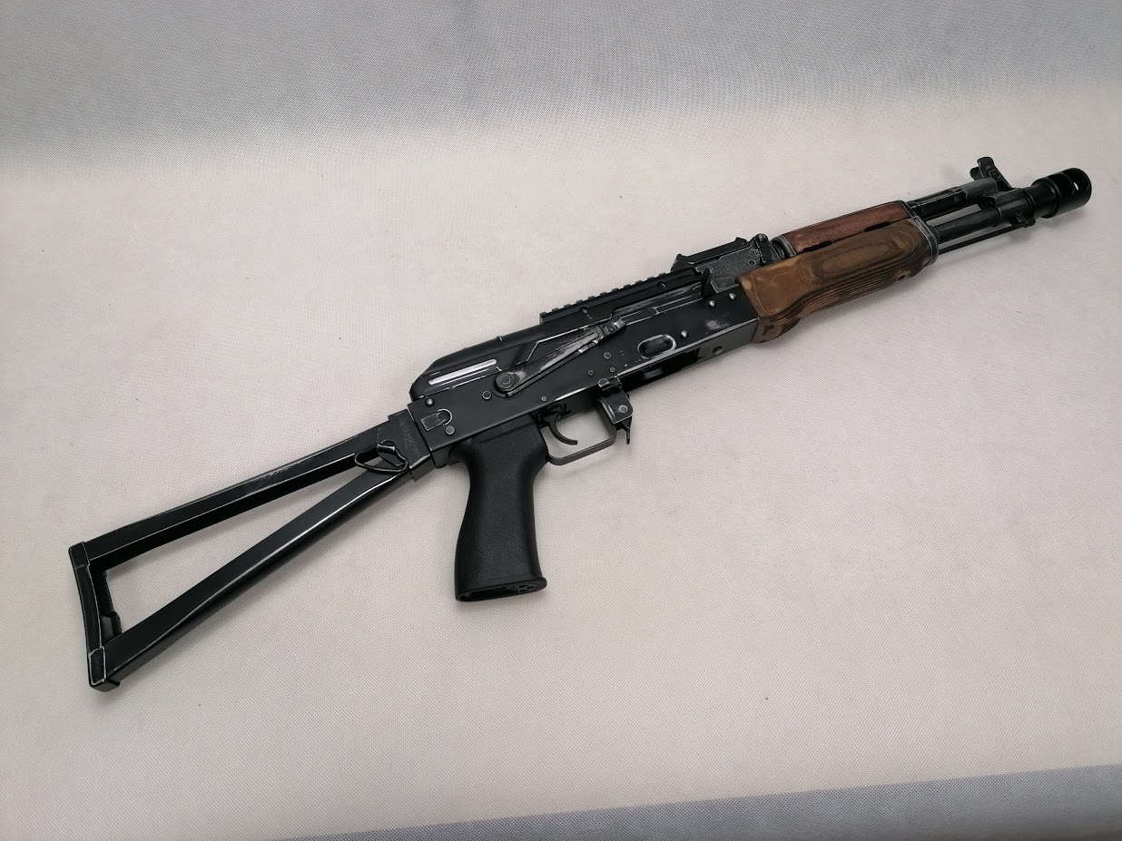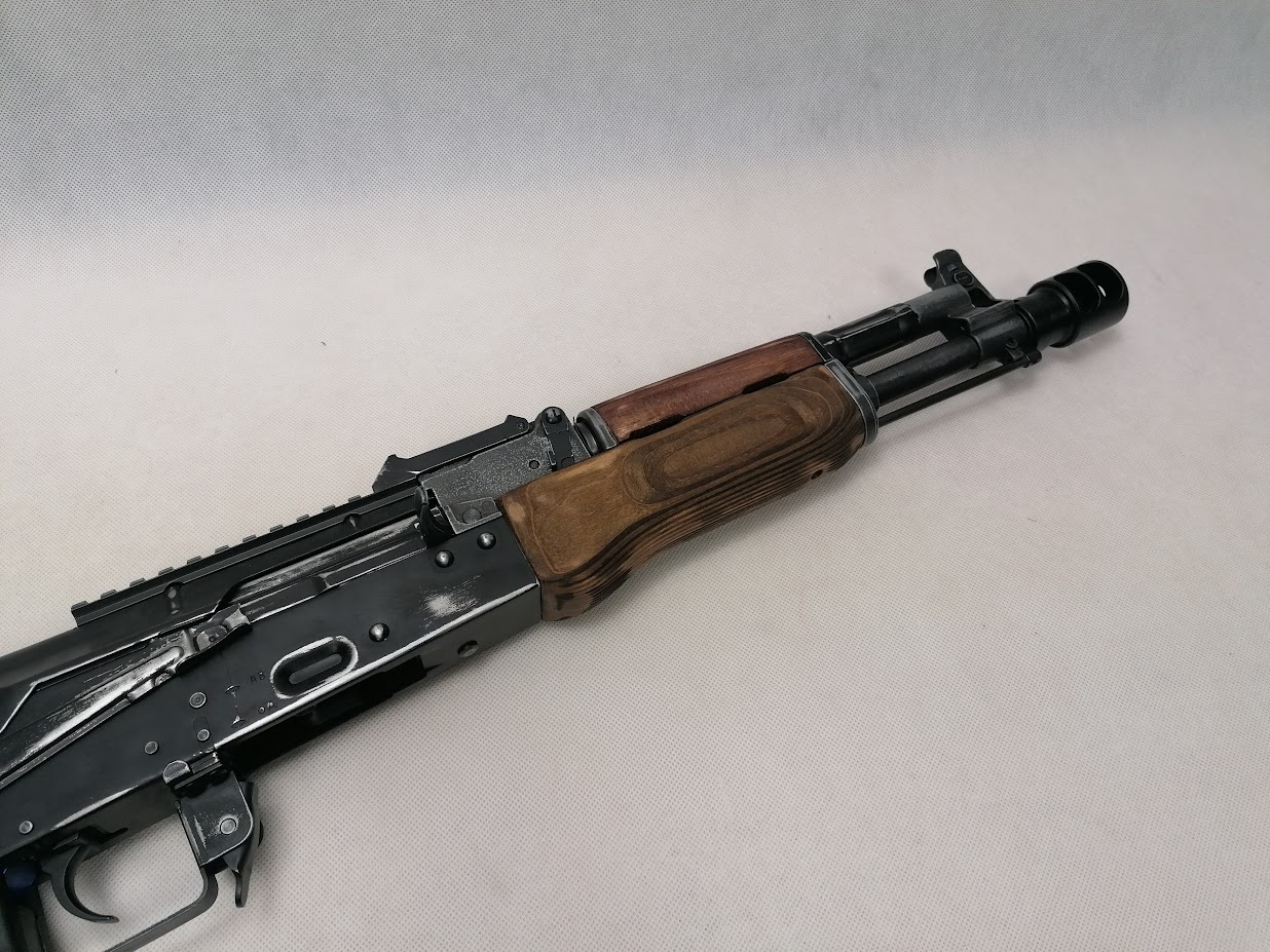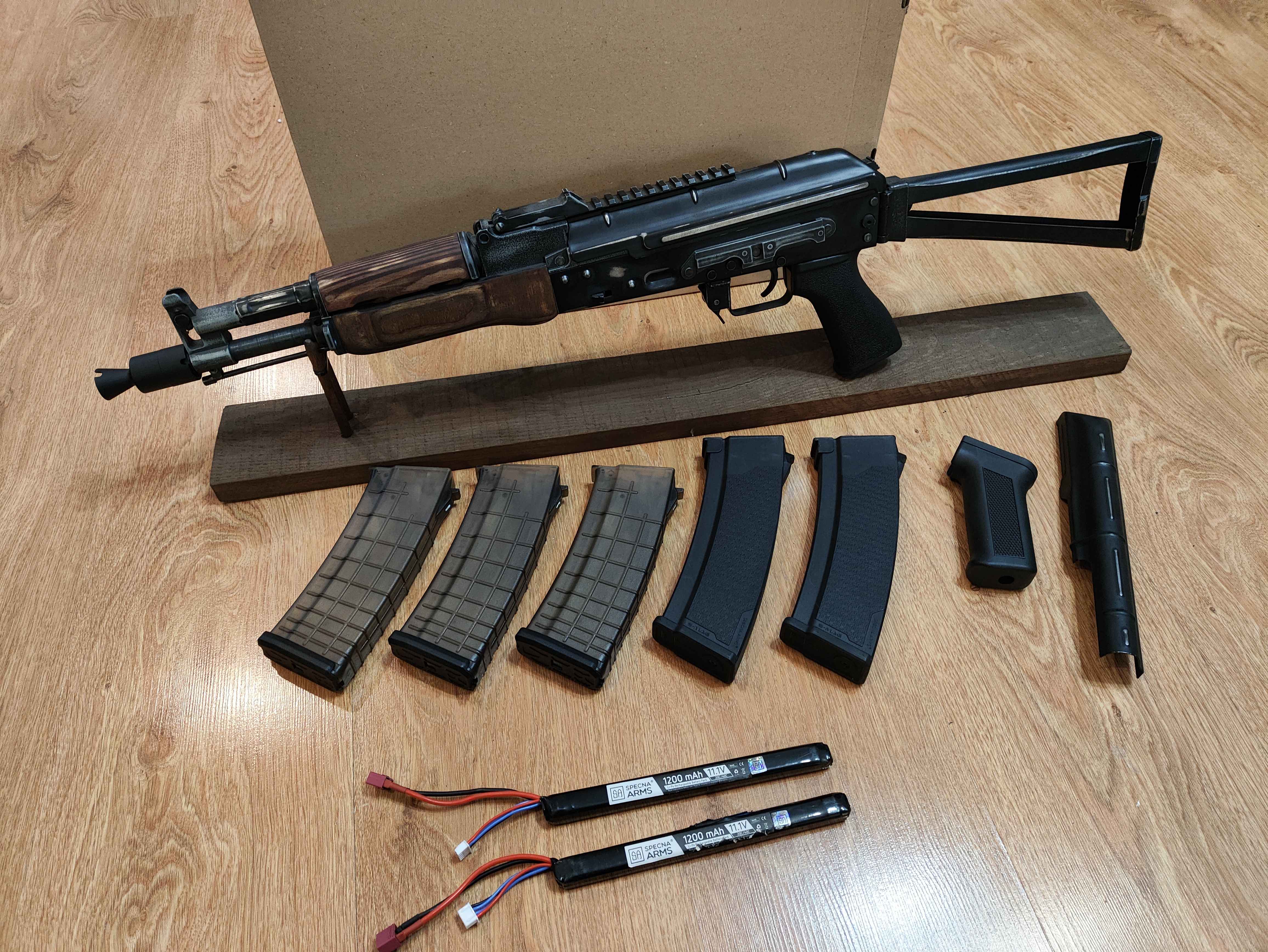 Specna Arms SA-J08 EDGE replika karabinu AK-105 (?) Bardzo fajna replika od specny... w pełni metalowa/stalowa z elementami drewnianymi, układ ASTER, dobrze spasowana brak luzów, jedynie lekki luz na kolbie - kolba jest składana. Lekko zmodyfikowana pod względem wizualnym oraz mechanicznym - replika jest nowa poskładana i trafia na sprzedaż. W wielkim skrócie, pełen serwis, podkładkowanie, smarowanie, zmiana oringów w celu poprawy szczelności, zmieniona gumka hopup - bardzo ładnie i równo kręci 0.25g / 0.32g :) zmienione zębatki na Tornado 13:1 i zrobiony short stroke - szybkostrzelność około 20-22 kulki sek. Układ Aster więc replika ma fajną reakcje na spust pod szturm jest idealnie. mocowo mamy 1.8j dla kulek 0.32g system szybkiej wymiany sprężyny także ewentualne dostosowanie mocy to chwila. Fajny zestaw 5 magazynków, dwie baterie, pudełko, pozostałe części.