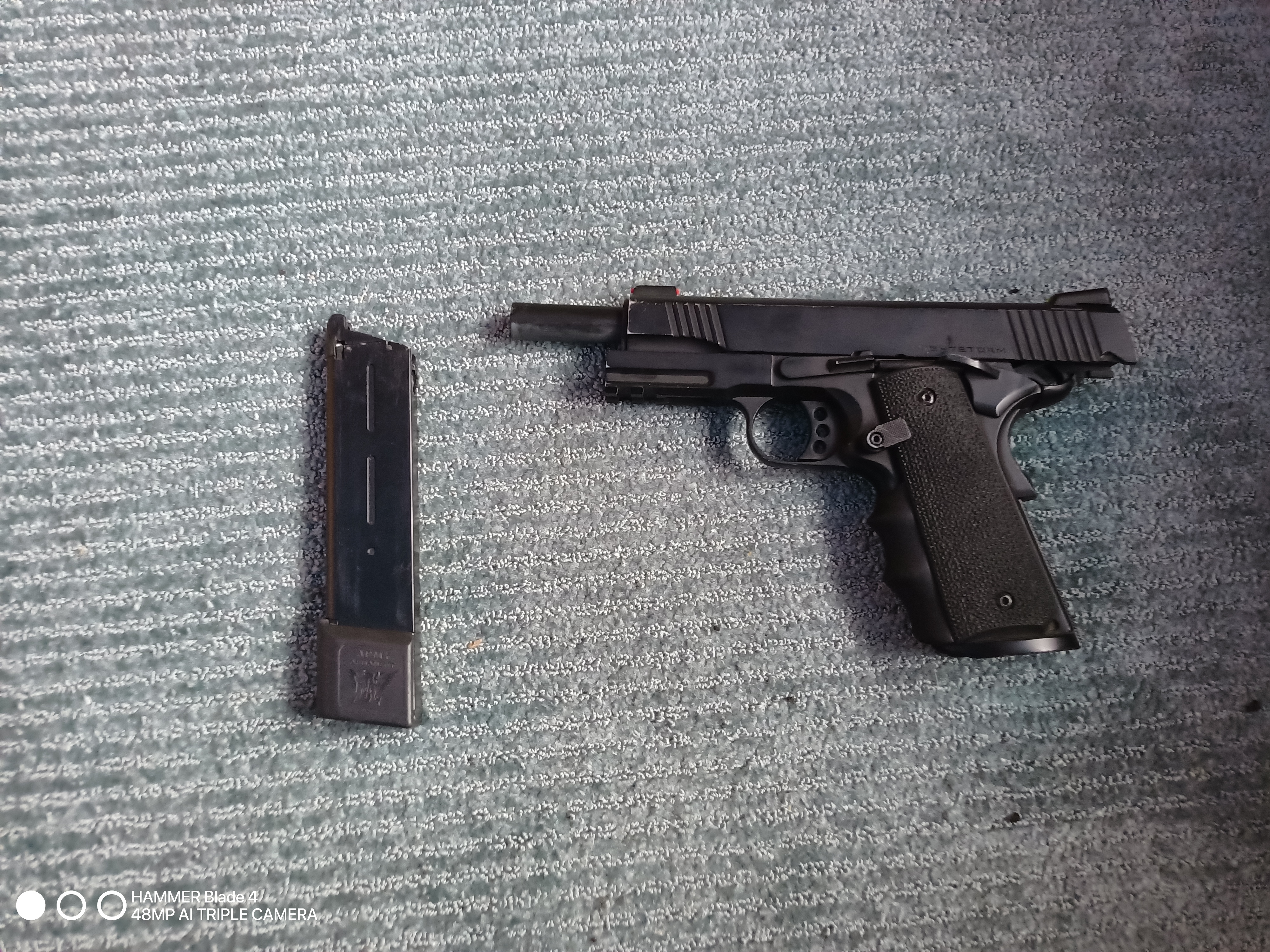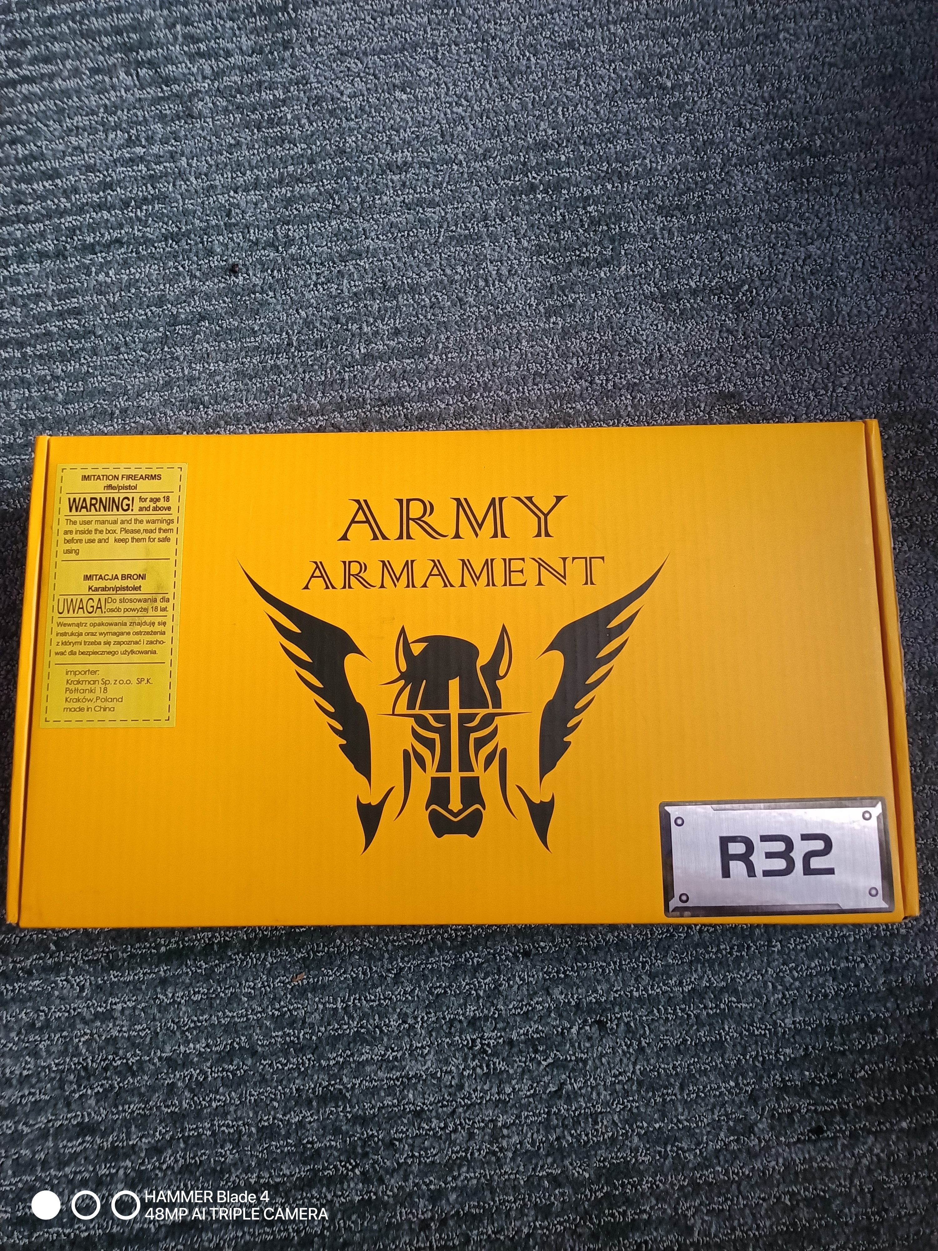 Army armament R32. Replika Amerykańskiego pistoletu colt 911. Zasilany jest on na greengas. Sam pistolet jest sprawny ale magazynek nie zawsze podaje kulki. Wymiana magazynku powinna rozwiązać problem. Cena za przesyłke uzgadniana przy zakupie (według ceny dostawcy)