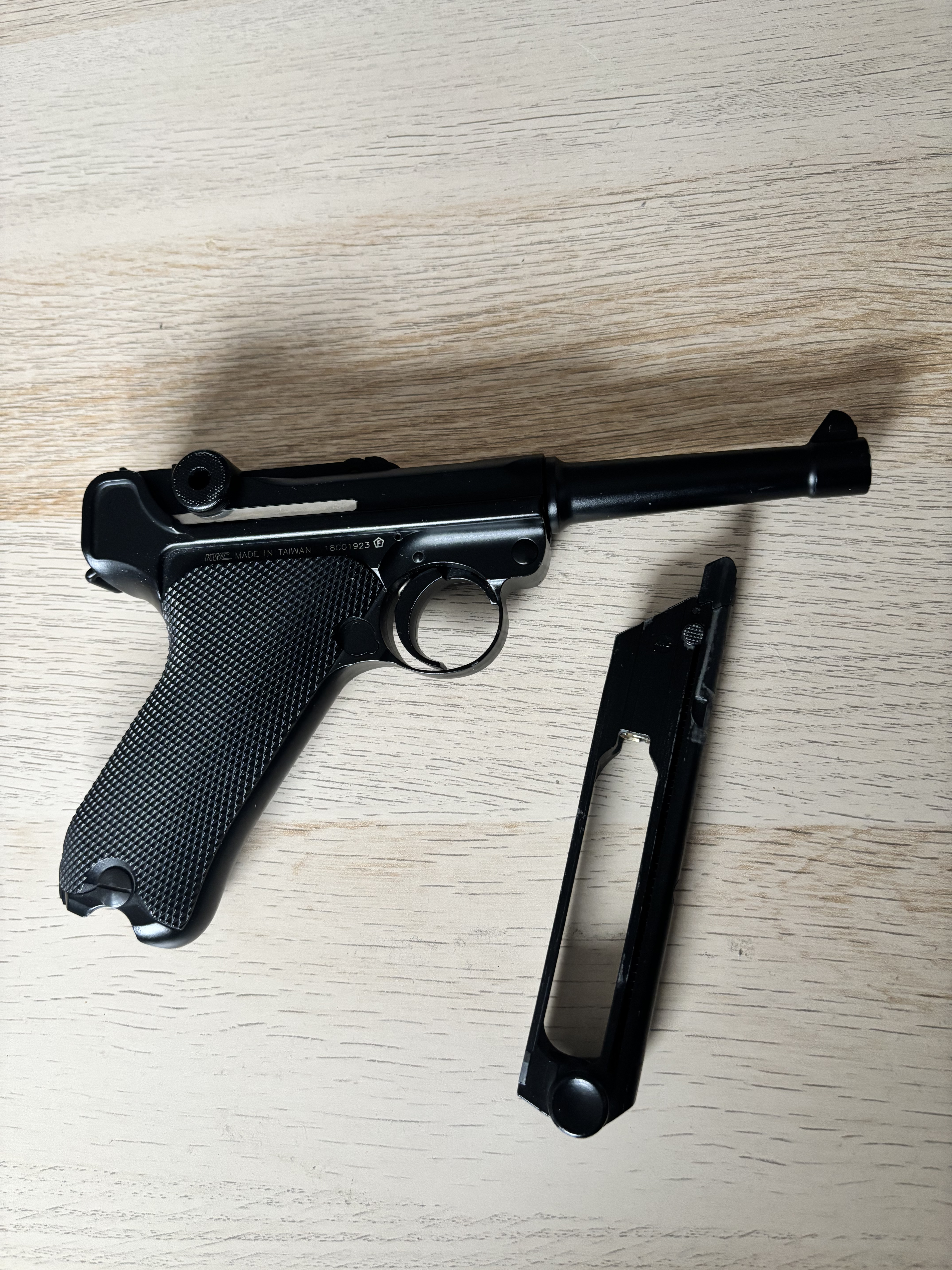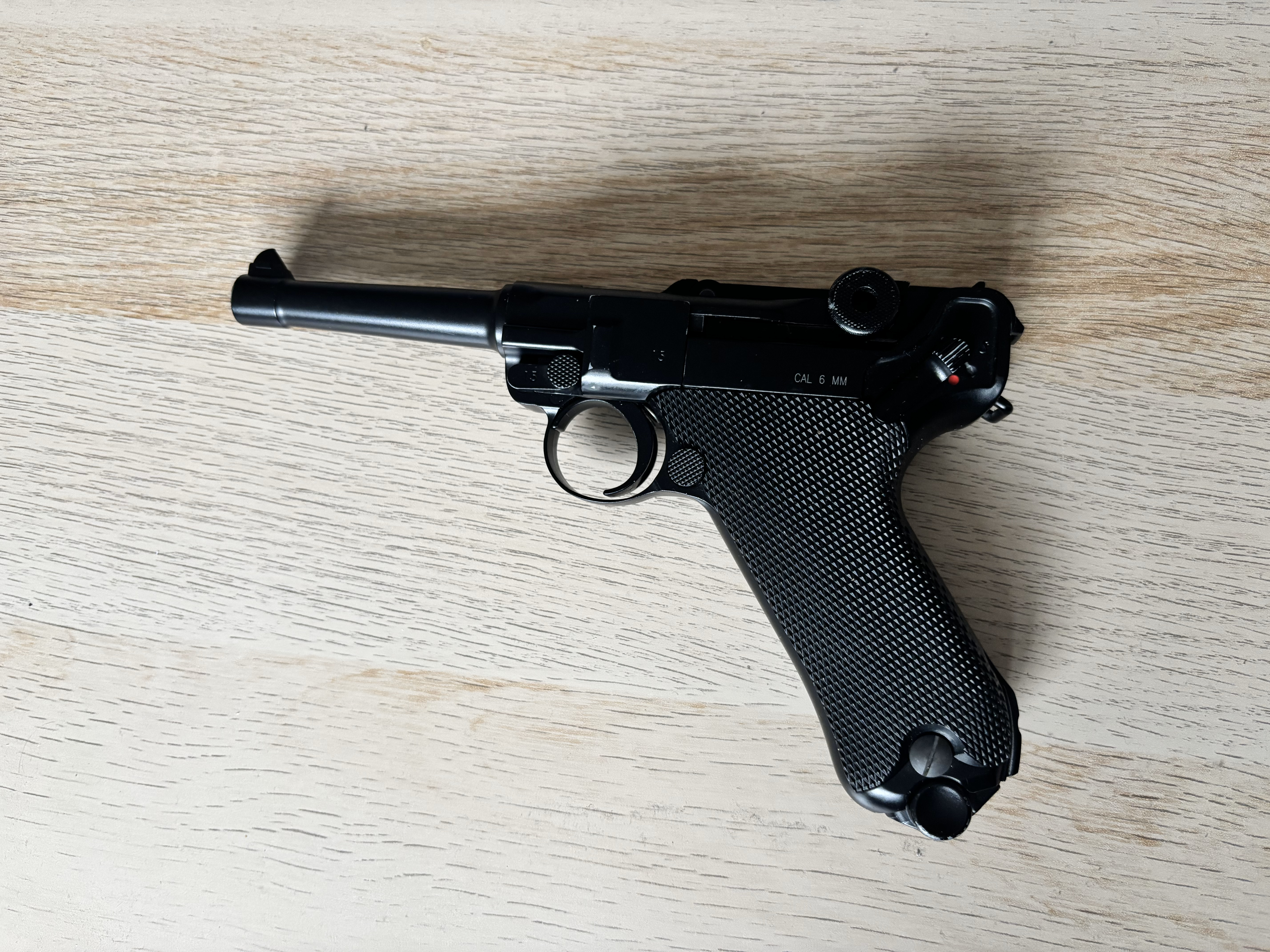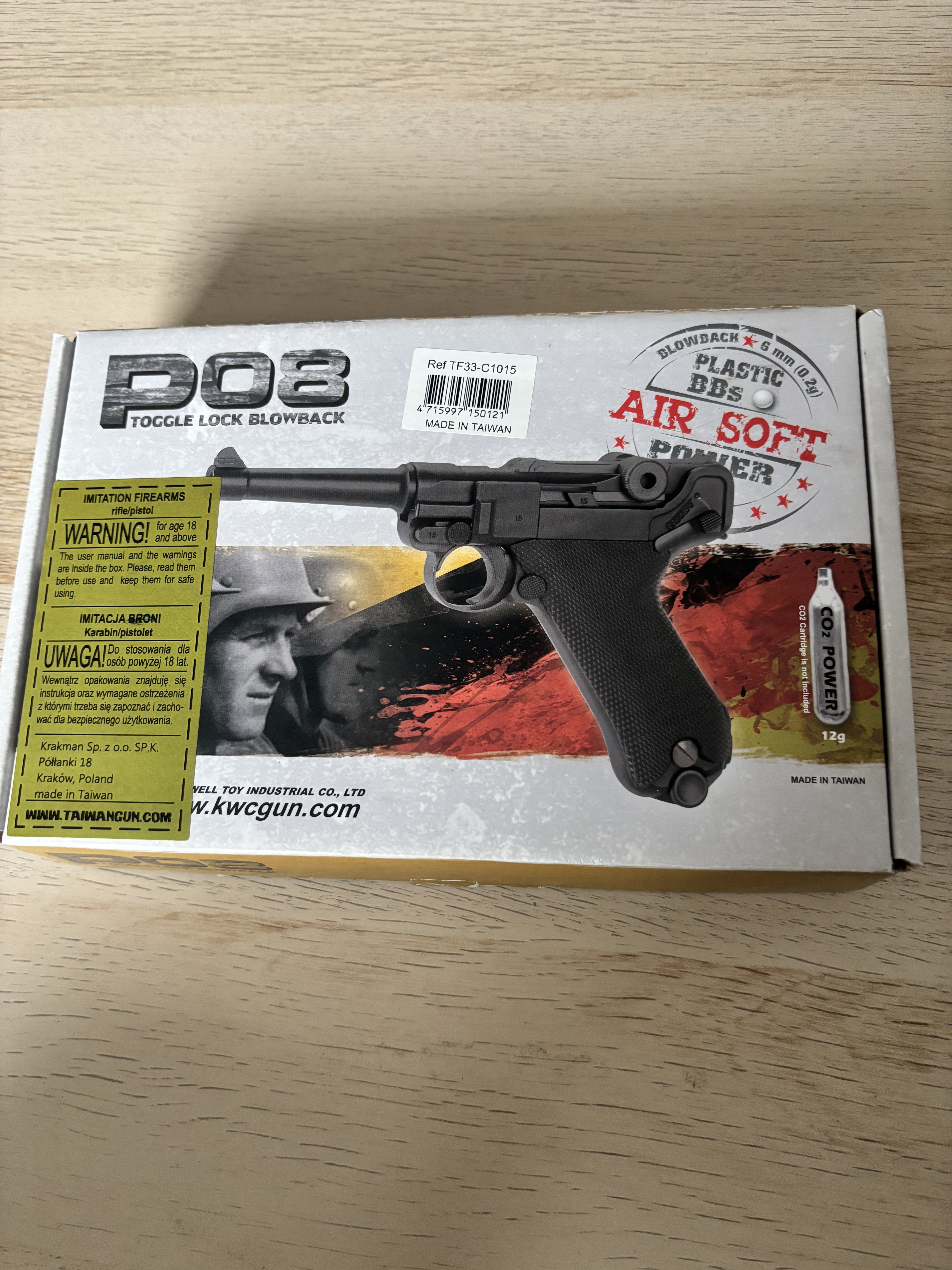 Witam posiadam na sprzedaż pistolet asg parabellum P08 marki KWC na CO2 . Replika użytkowana sporadycznie była na dwóch historykach i czasami przestrzelana w ogródku do puszek , głównie leży w szafie i się kurzy
