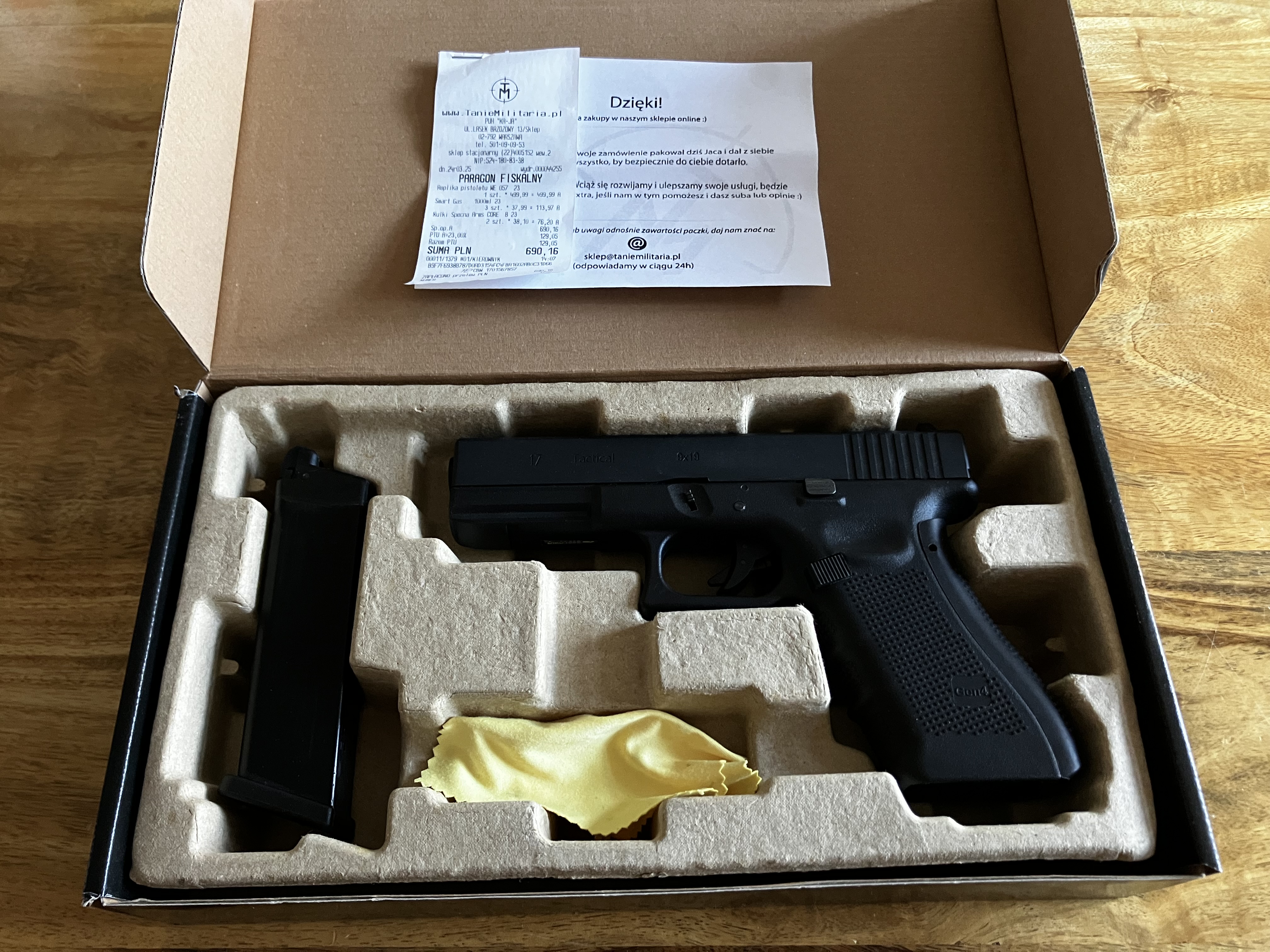 Witam, sprzedam zestaw WE G17 4 Gen - WE-057 w stanie bardzo dobrym. Zasilany na green gas. W zestawie 2.5 puszki gazu oraz 1.5 opakowania kulek, łącznie ok 4500 sztuk. Replika znajduje się w oryginalnym pudełku, dołączam paragon zakupu. Zestaw obejmuje: G17 4 Gen - WE-057 wraz z magazynkiem 2.5 puszki gazu 1.5 opakowania kulek Pudełko Dowód zakupu