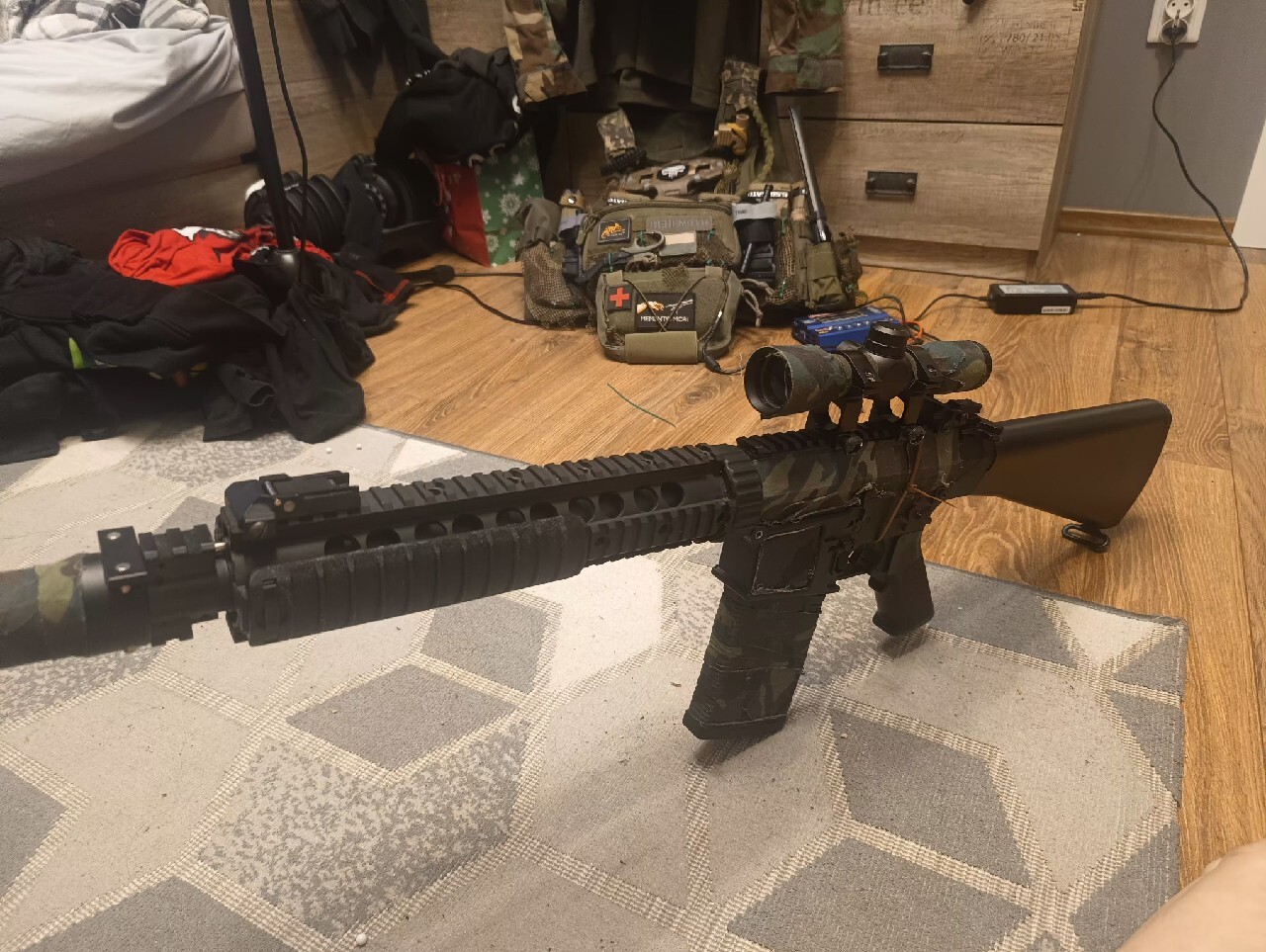 Replika MK11 MOD 0 / SR-25 A&K Sportsline – zestaw Sprzedam replikę samopowtarzalnego karabinu MK11 MOD 0 (SR-25) firmy A&K. https://www.taiwangun.com/pl/karabin-snajperski-aeg/replika-samopowtarzalnego-karabinu-mk11-mod-0-sportsline-a-k Replika jest w 100% sprawna i działa prawidłowo. Replika spadła, jedyną wadą jest to, że jeden zatrzask górnej szyny RIS się wyłamał – w tym miejscu szyna jest obecnie przymocowana trytytką. Po upadku replika była na przeglądzie u serwisanta, który potwierdził, że wszystko jest OK i replika działa poprawnie. Moc 455 fps na 0,20g. W zestawie: replika MK11 MOD 0 / SR-25 A&K 2 magazynki CYMA (brak oryginalnego magazynka) luneta 4x – bardzo tania (wartość ok. 100 zł), ale jak ktoś nie ma, to będzie w sam raz na start oryginalne pudełko Minusy: uszkodzony jeden zatrzask górnej szyny (szyna trzyma się na trytytce) brak chwytu przedniego, który był w oryginalnym zestawie (był bardzo tani i i tak do wymiany) Poza wymienionymi wadami replika w pełni sprawna technicznie.