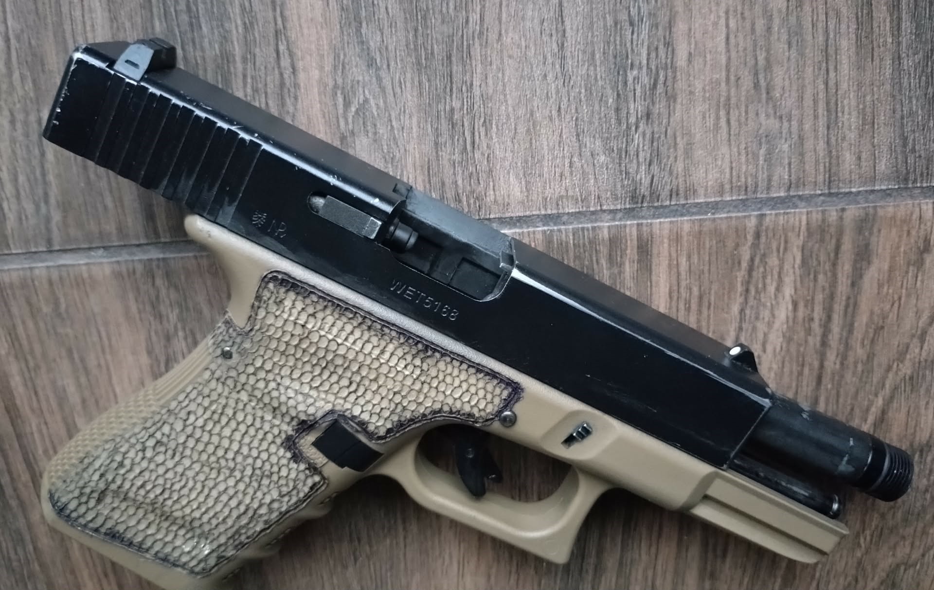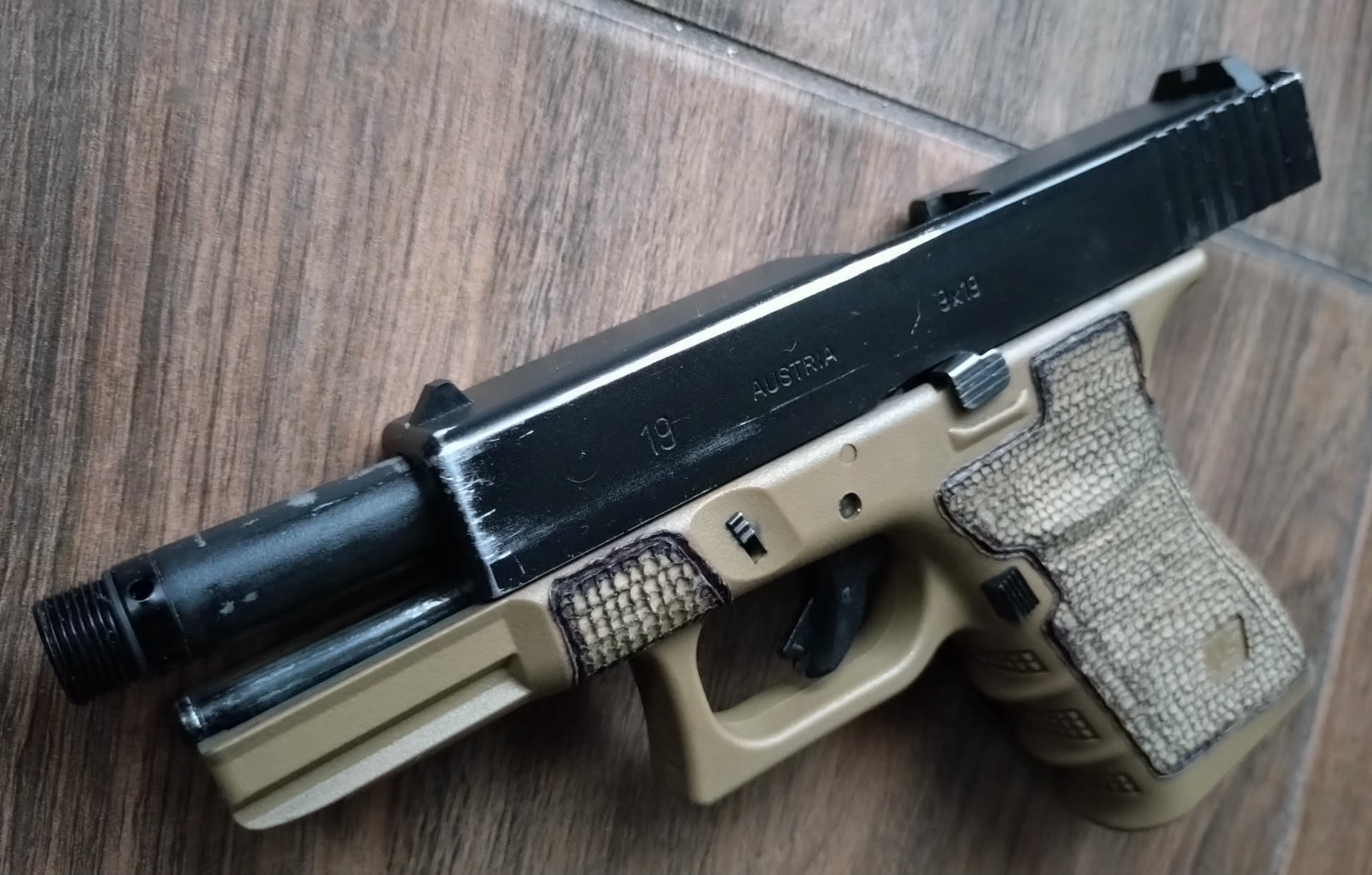 Sprzedam replikę pistoletu Glock 19 z oznaczeniami (bez logo Glock) firmy WE-Tech. Replika pistoletu sprawna, wszystkie magazynki sprawne i szczelne. Nie miałem problemów z repliką. Klameczka generuje na gazie WE 0,9 J. Strzela jak na tak mały pistolet celnie, powtarzalnie i daleko. Wymieniałem gumkę na SHS, polerowałem komorę Hop-Up oraz zmieniłem lufe zewnętrzną na taką z lufą z gwintem, do montażu tłumików. To co widać to jeszcze modyfikacja zewnętrzna w Stippling, aby lepiej trzymała się w dłoni. Jestem pierwszym właścielem całego zestawu. Możliwość wysyłki lub odbioru osobistego we Wrocławiu.
