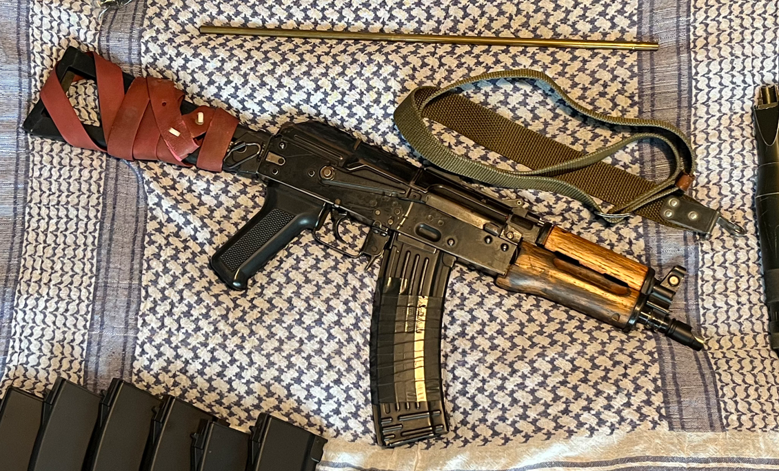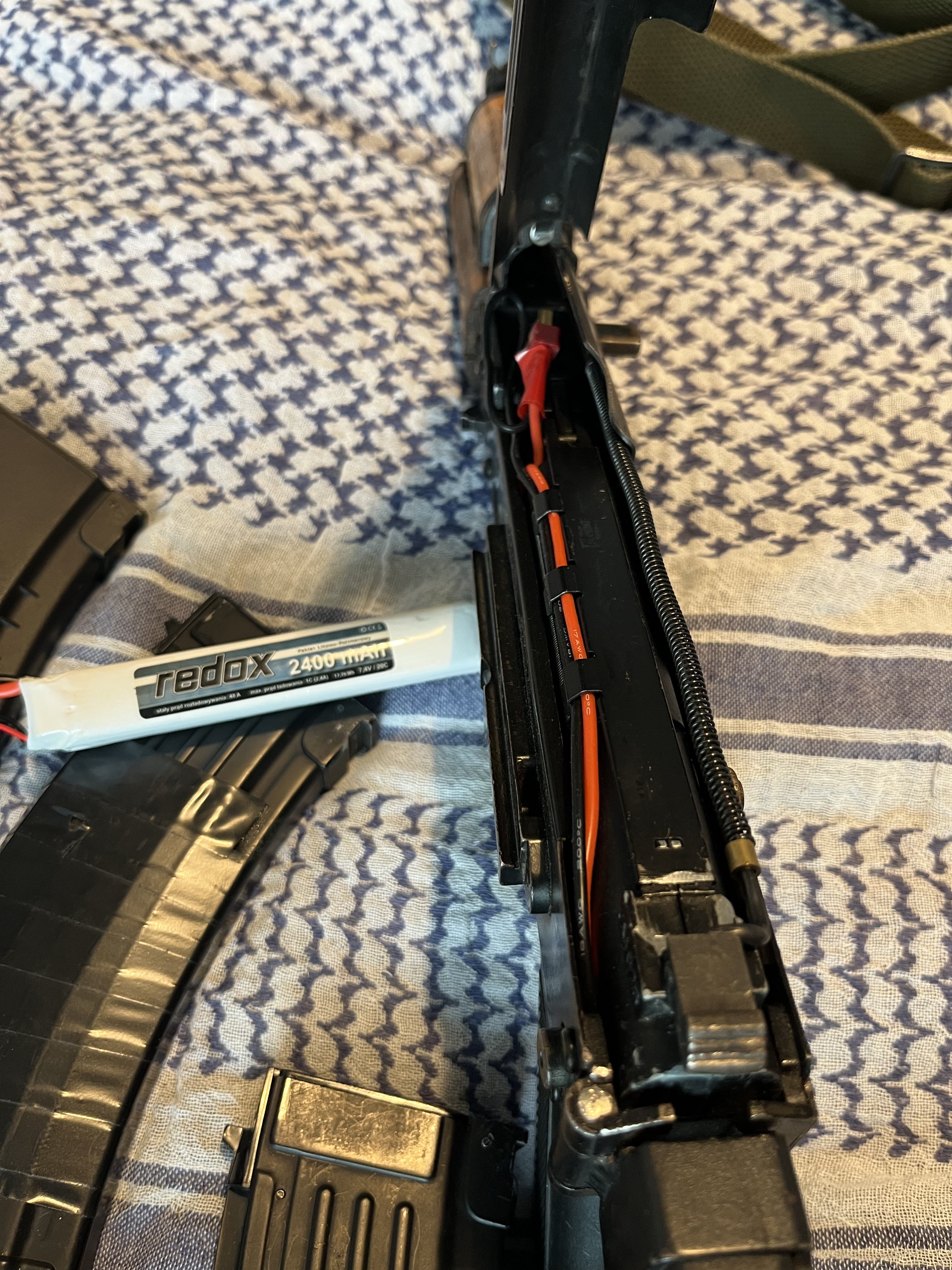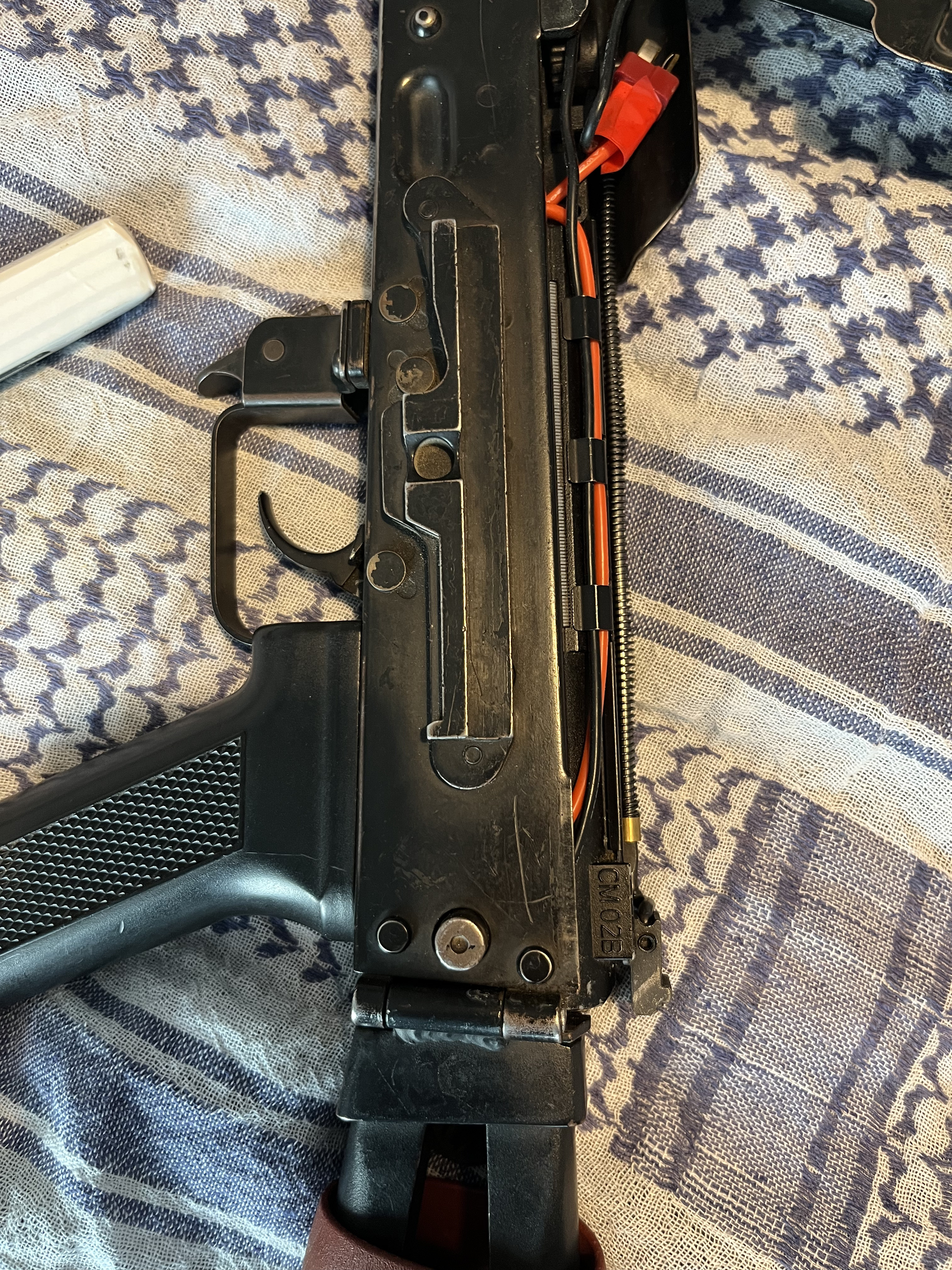 AEG aks74u, body VFC, bebechy to sklejka różnych części w obudowie GB z cymy, całość ma jakieś 10-15 lat. Częściowo sprawna - nie działa ogień pojedynczy z powodu drobnej usterki spustu i selektora. Ogień ciągły i bezpiecznik sprawne. Ma nieco luzów na łożu i kolbie. Atrapa suwadła wymieniona na taką, jaką widać na zdjęciu. Korpus stalowy, nie ZnAlowy, łoże drewniane. Na ostatnim chronowaniu wykazała ok. 380 fps. Jeśli dobrze pamiętam ma założoną sprężynę M120. Bonusowo w zestawie: - atrapa tłumika dźwięku razem z poprzednią, dłuższą lufą, którą można schować w tłumiku - 8 magazynków mid-cap - trochę części zapasowych (komora hop-up, gumka hop-up, atrapa suwadła, sprężyna główna, etc.) - oryginalny, radziecki pasek dwupunktowy - oryginalny, rosyjski żgut (różowa opaska zaciskowa) - akumulator redox li-po 7.4V, 2400 mAh Od lat leży w szafie i się kurzy, bo wypadłem z hobby. Preferowane oględziny osobiste żeby nie było niespodzianek.