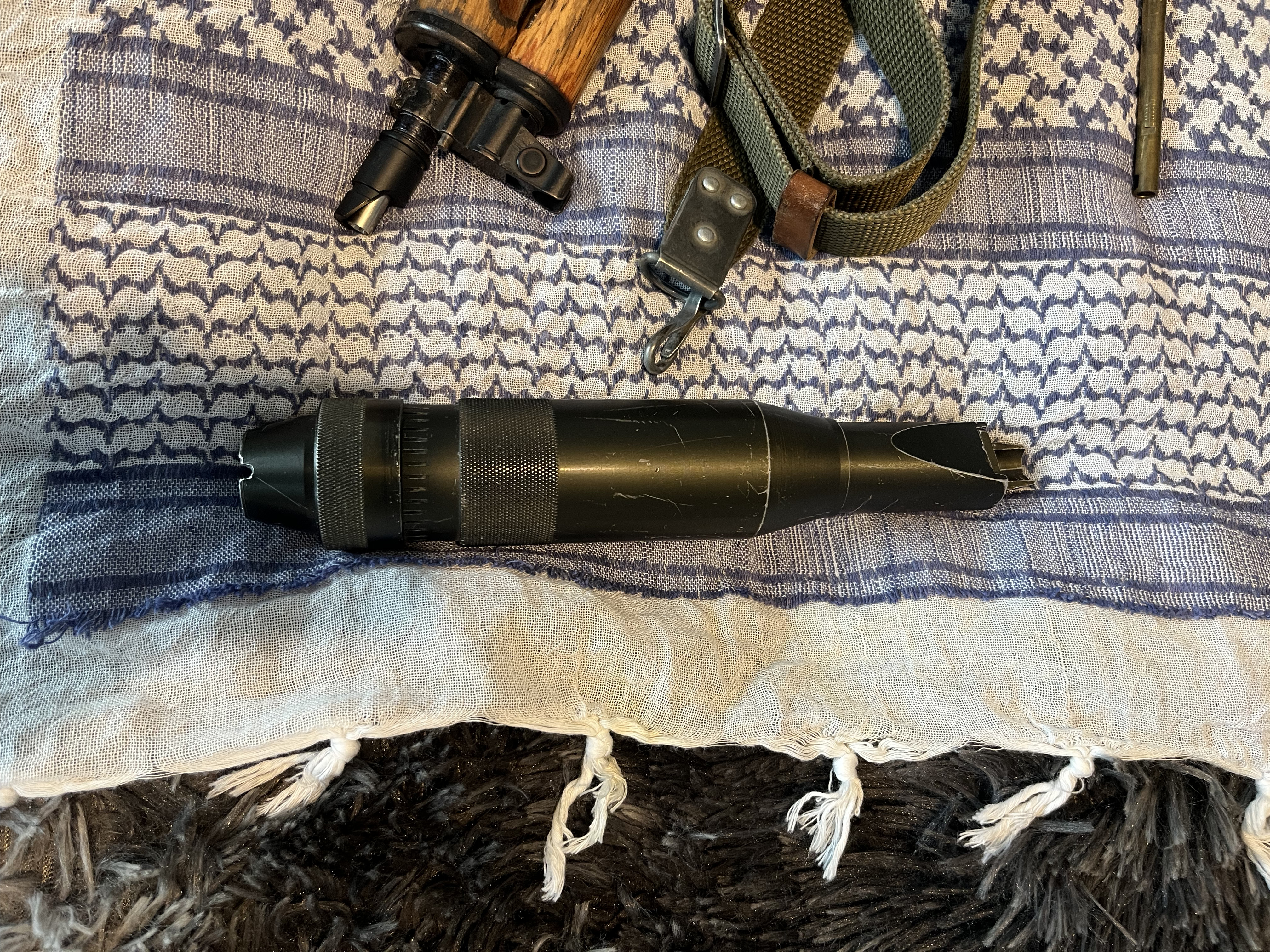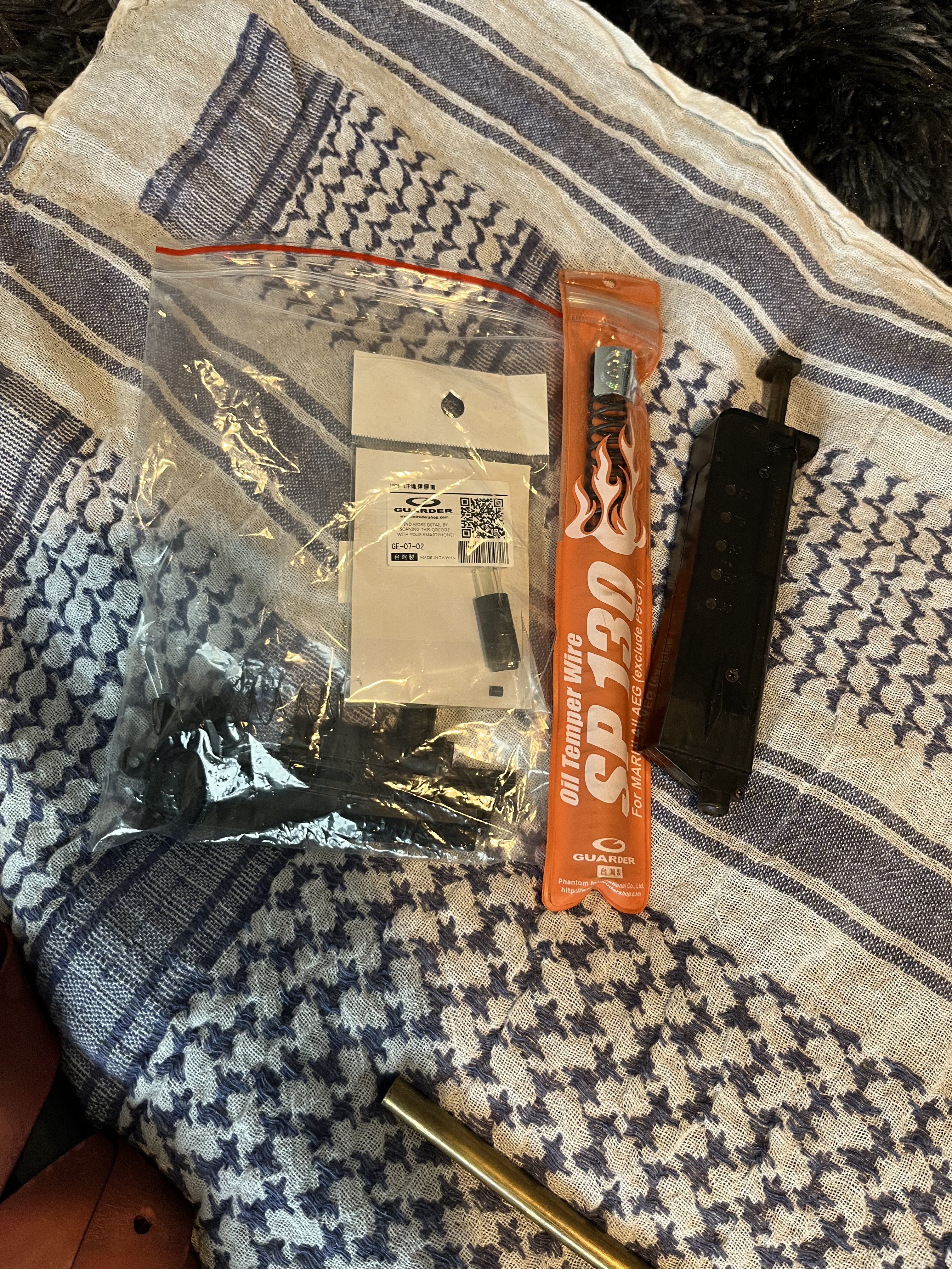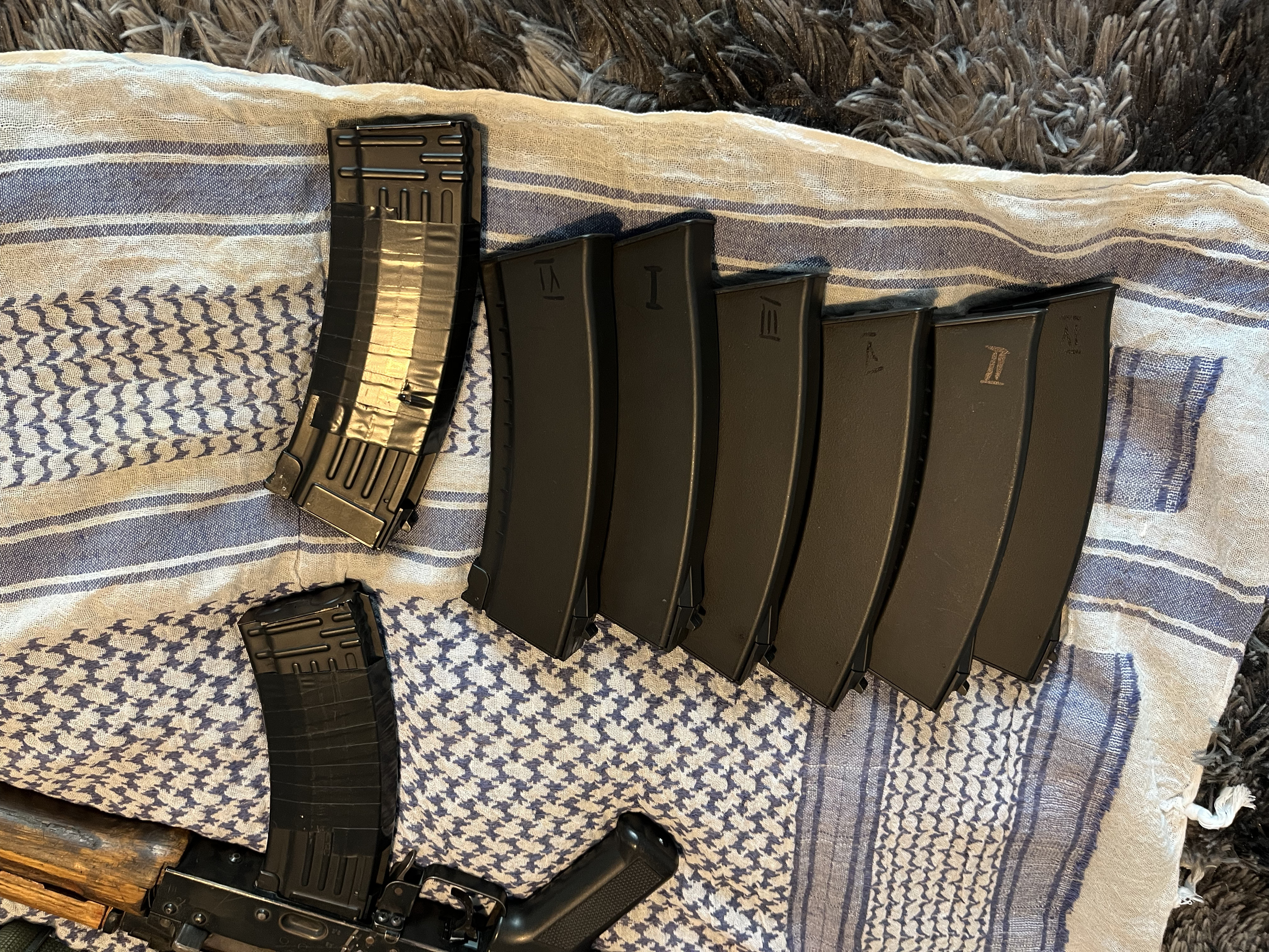 AEG aks74u, body VFC, bebechy to sklejka różnych części w obudowie GB z cymy, całość ma jakieś 10-15 lat. Częściowo sprawna - nie działa ogień pojedynczy z powodu drobnej usterki spustu i selektora. Ogień ciągły i bezpiecznik sprawne. Ma nieco luzów na łożu i kolbie. Atrapa suwadła wymieniona na taką, jaką widać na zdjęciu. Korpus stalowy, nie ZnAlowy, łoże drewniane. Na ostatnim chronowaniu wykazała ok. 380 fps. Jeśli dobrze pamiętam ma założoną sprężynę M120. Bonusowo w zestawie: - atrapa tłumika dźwięku razem z poprzednią, dłuższą lufą, którą można schować w tłumiku - 8 magazynków mid-cap - trochę części zapasowych (komora hop-up, gumka hop-up, atrapa suwadła, sprężyna główna, etc.) - oryginalny, radziecki pasek dwupunktowy - oryginalny, rosyjski żgut (różowa opaska zaciskowa) - akumulator redox li-po 7.4V, 2400 mAh Od lat leży w szafie i się kurzy, bo wypadłem z hobby. Preferowane oględziny osobiste żeby nie było niespodzianek.