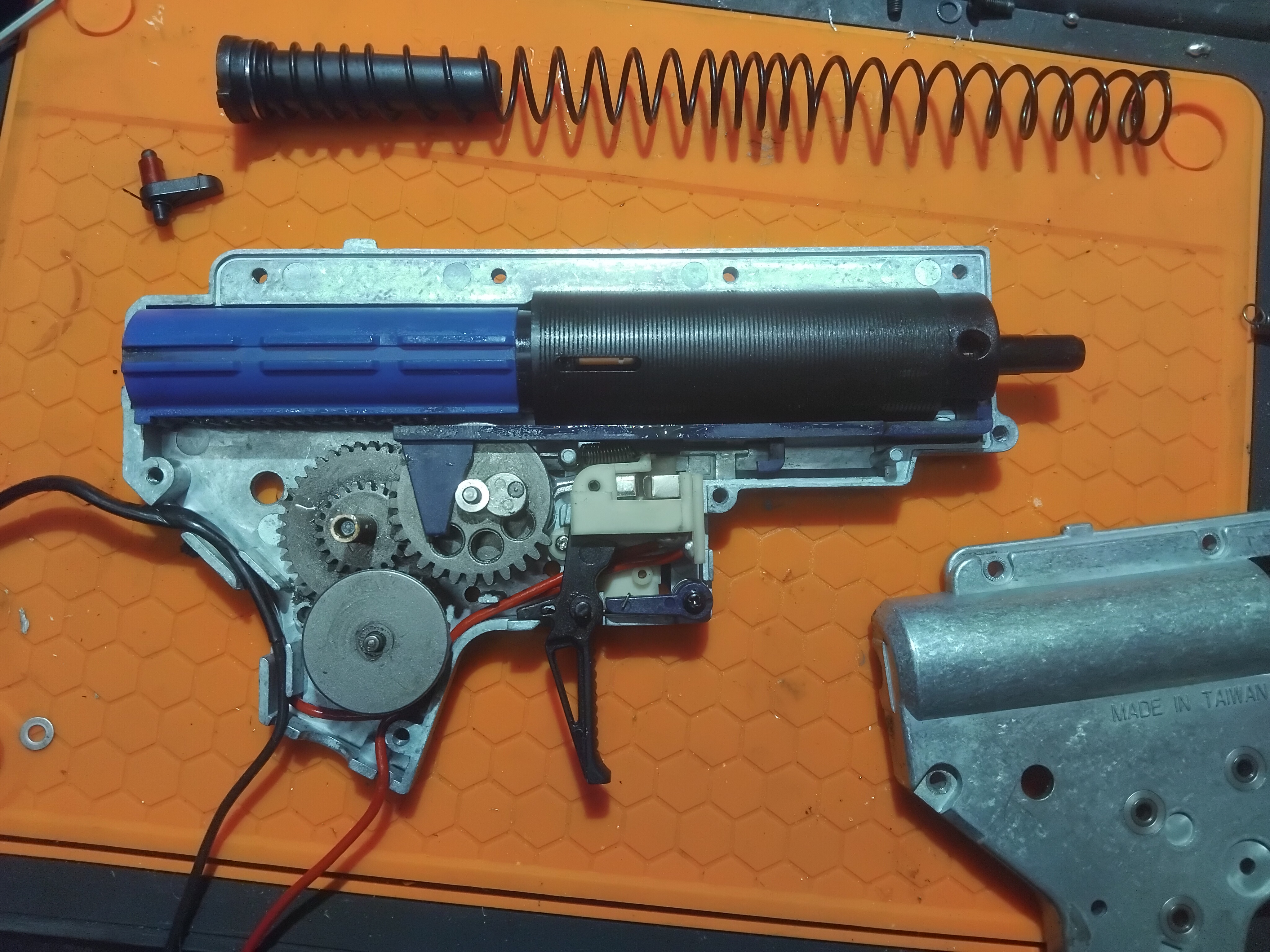 M4A1 LMT Defender ze stajni G&P, solidna i osiowa konstrukcja, korpus bez luzu, front delikatnie się rusza ( ale to norma) są zadrapania, brak pęknięć, był robiony ddlikatny mod: Szkielet Ultimate, Kostka stykowa G&P, Łożyska 7mm ślizgowe Ultimate, Cylinder typ 1 Lonex Głowica cylindra Lonex + sorbo Epeesa 60⁰ 4,2mm Tłok shsa 14 stalowych zębów Głowica tłoka SYSTEMA AERO DYSZA 21.2mm Guarder Zębatki G&P stalowe Wtyk T-Deans Precka 6.03mm 370mm Krytac Gumka fioletowy Prometheus wraz z dystanserem Komora fabryczna VFC rotacyjna Spreżyna SP120 AimTop. Silnik hi-torque na magnesach neodymowych SYSTEMA Spust Novritscha z miejszym skokiem. całość generuje 1.9j na kulkach 0.32g zasięg około 75m ale celnie około 65m. Plus minus 1m. Pomiar pokazał 1.903J więc się trzyma. Tylko sprzedaż możliwa negocjacja z rozsądkiem. Replika 3x magazynek (2x mid-cap, 1x hi-cap) Ładowarka lipo Lipo 7.4v