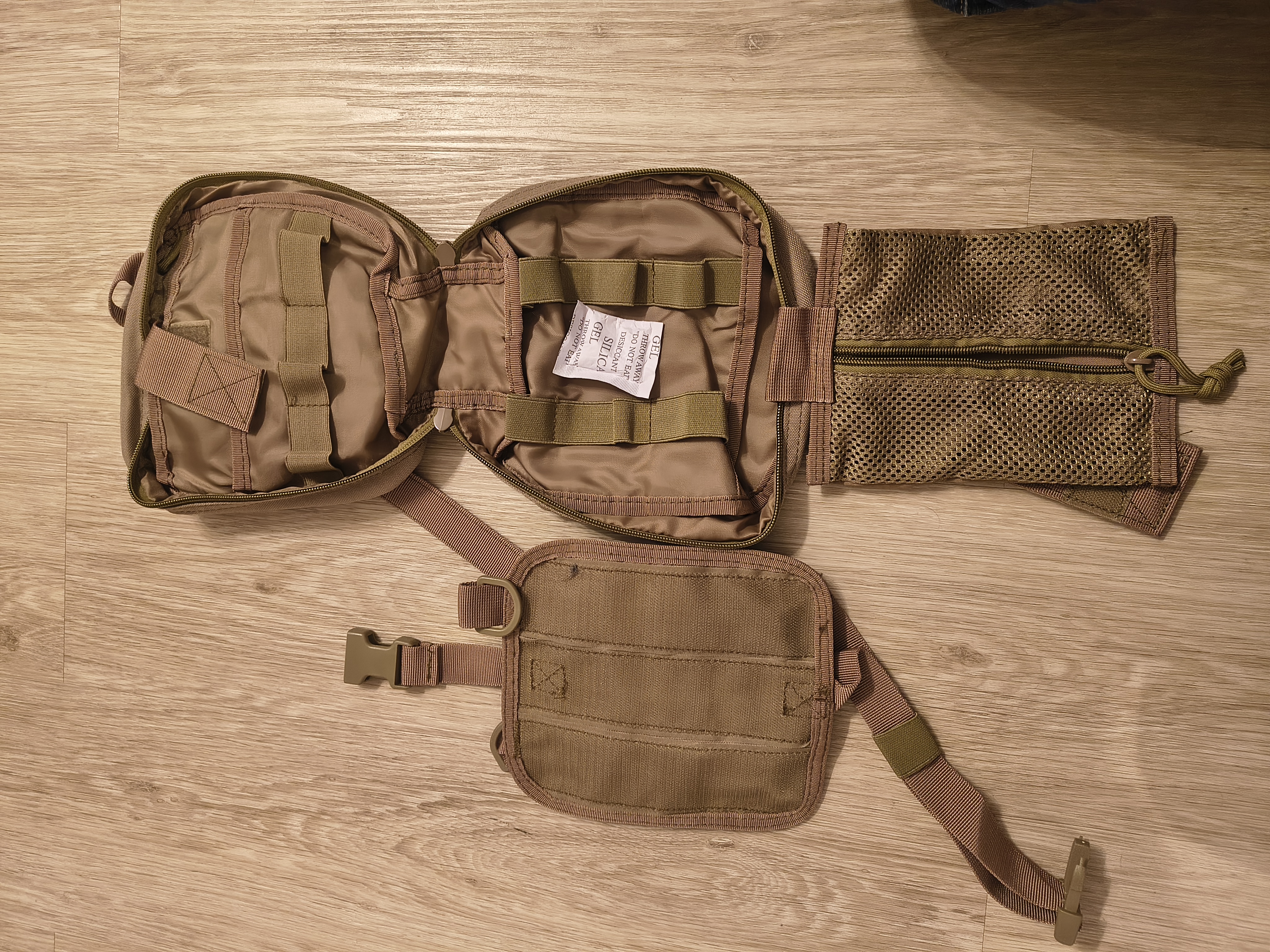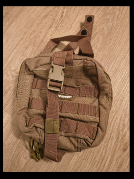 Apteczka, dwuczęściowy organizer. Pozwalający na bardzo dobry dostęp do zawartości dzięki mocowaniu na rzep panelu molle. 20x20x7
