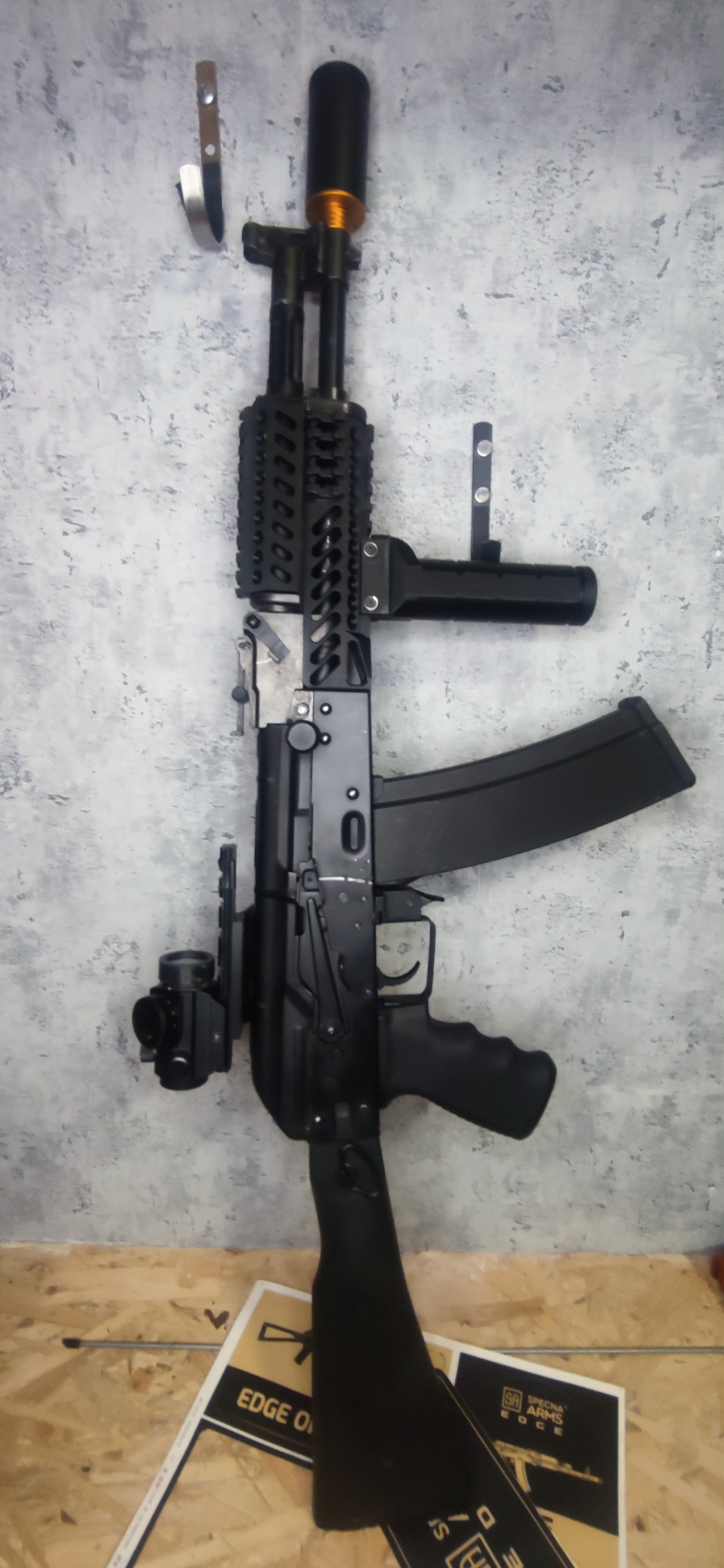 Witam, Zapraszam do zakupu, poniżej zamieszam osiągi i listę części: Na kulkach 0,28g wyciąga 1.8J W zestawie: Replika Szyna jaskółczy ogon Magazynki mid cap 4 sztuki ( dwa s -mag 2 Cyma czarny i bakielitowy) Bateria 11.1v Przebieg 4000 kulek. Replika wyposażona w MOSFET Aster Gate V.3 Zębatki 16:1 Doszcelniona pneumatyka Silnik high tourqe SPECNA ARMS Gumka Prometeus. Brak urządzenia wylotowego. Jest w zamian atrapa tłumika. W zestawie również Zestaw frontów taktycznych ( druk 3d ) Oraz oryginalnych.(Zdjęcie numer dwa) Dodaje chwyt RK-01. Cena do rozsądnej negocjacji. Kolimator nie jest częścią zestawu