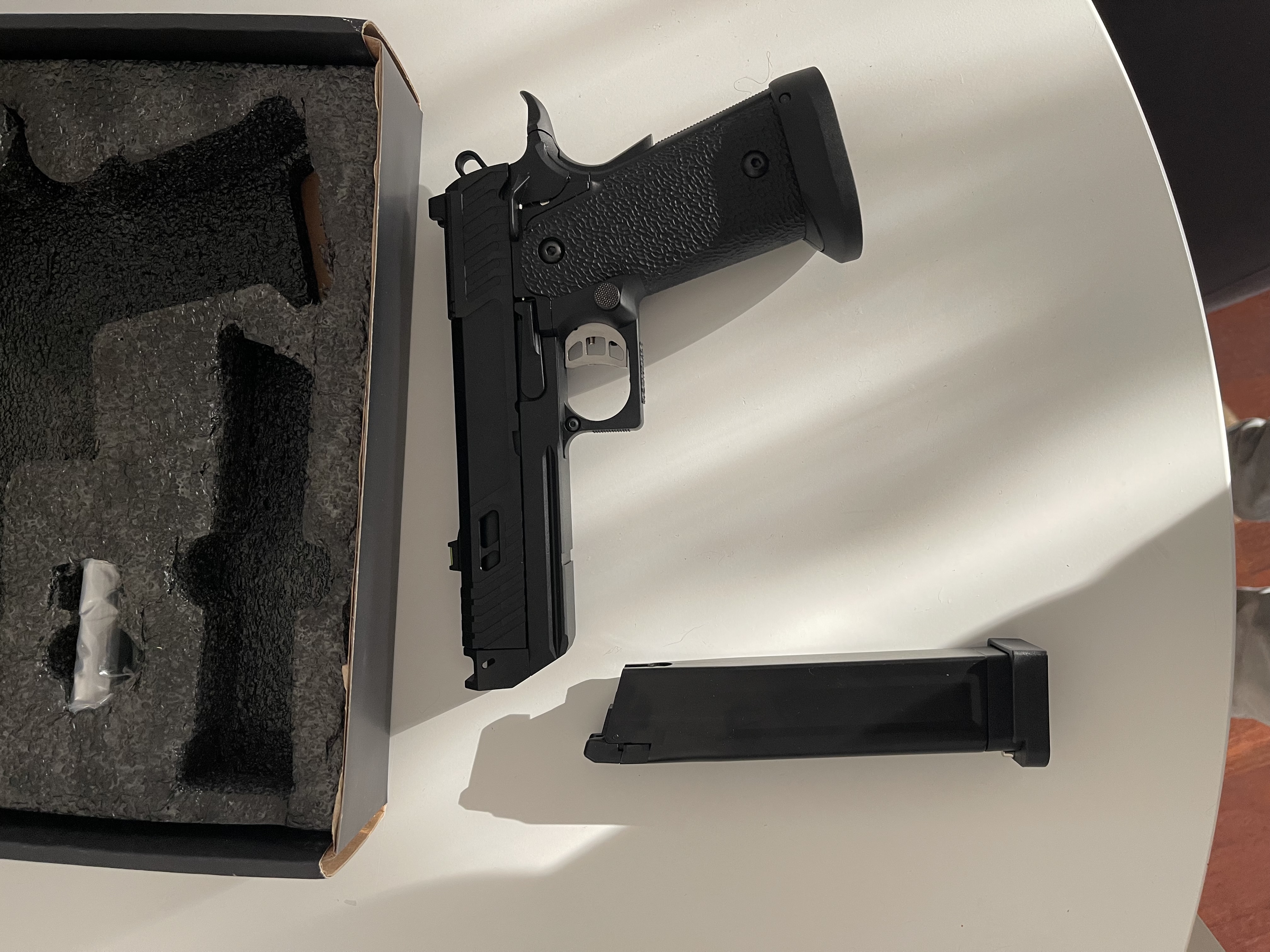 Do sprzedania nowa klamka, nie wystrzeliła ani jednej kulki. W zestawie magazynek na green gas (klamki można też używać z magami CO2) oraz blaszka do montażu kolimatora. Możliwa wysyłka