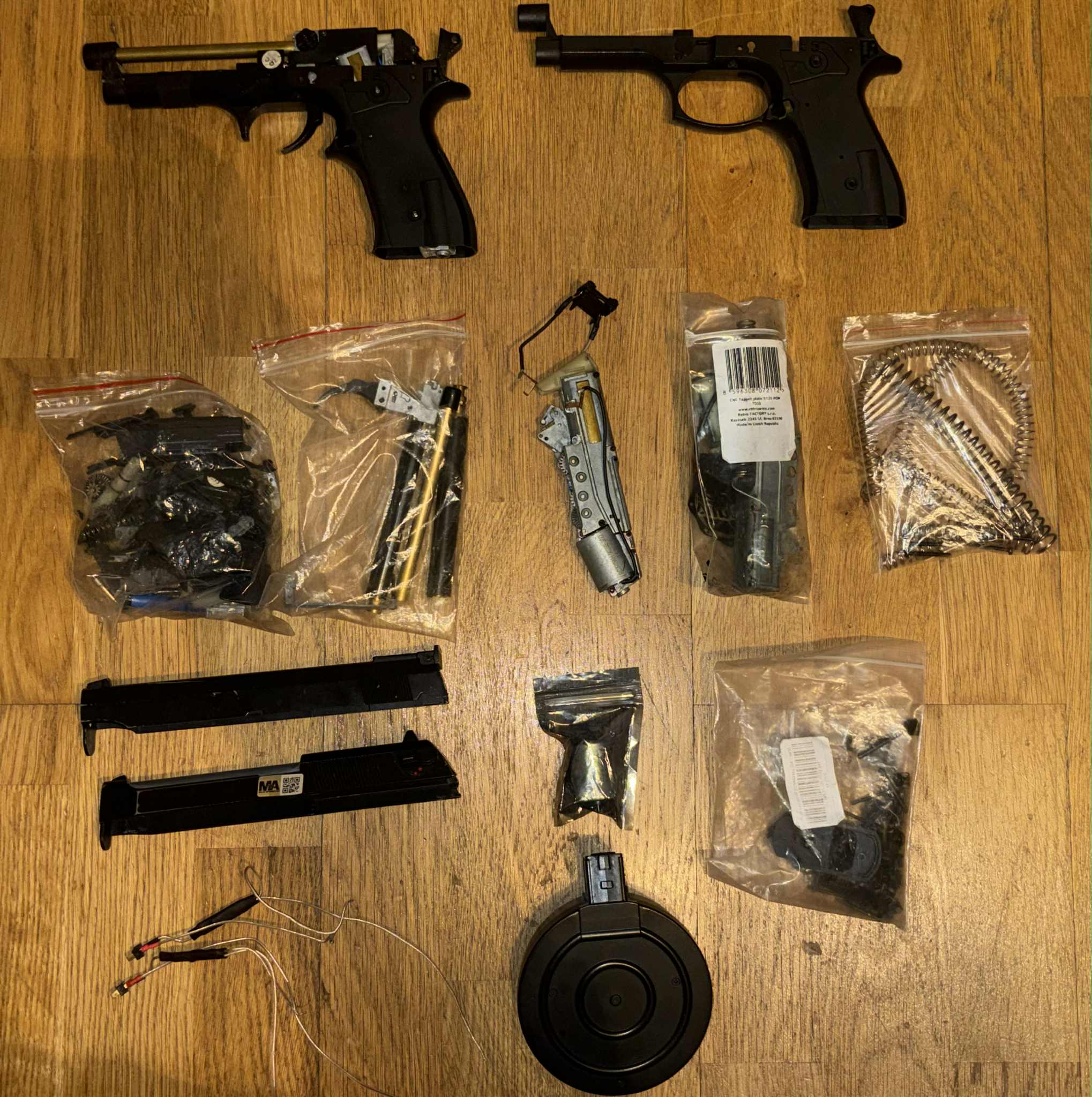Witam, Mam na sprzedaż parę pozostałości po Asg, a dokładnie po cymoklamkach, części są od replik cm.126,cm.127 i cm.128, trudno mi stwierdzić czego ile dokładnie jest od danego modelu bo części są pomieszane. Części leżą i się kurzą, a może komuś się przydadzą, ja szczerze nie wiem ile to jest warte w tym stanie, więc czekam na propozycję cenowe, ile kto da za tyle przyjmę, ale wiadomo że propozycje z ,,rozsądkiem". Lista: 1. Sprawna działająca replika cm.126 (działa i strzela, tylko brakuje jej trochę części i jest posklejana klejem) 2. Korpus do Cm.126 (Korpus jak korpus) 3. Worek z częściami (dysze,zębatki, inne części wewnętrzne i zewnętrzne) 4. Worek z częściami (lufy, osłony, spust i gumka) 5. Kompletny gerbox (nie wiem od którego, ale wygląda na CHYBA kompletny i sprawny) 6. Worek z gerboxem (nie jest on kompletny) 7. Woreczek z częściami (sprężyny i śrubki) 8. Zamek do cmm.126 i cm.127 (zamki jak zamki) 9. Woreczek ( jest tam silnik, CHYBA sprawny) 10. Woreczek z częściami (są tam piny, zębatki, śrubki i części wewnętrzne i zewnętrzne) 11. 2xprzewody (CHYBA są sprawne) 12. Magazynek Mp5 (magazynek CHYBA jest do Mp5 od firmy well, do jg nie pasuje) Nie wiem ile są te rzeczy warte w tym stanie, dlatego czekam na propozycję, bo nie chce żeby się zmarnowało, a może komuś się przydadzą