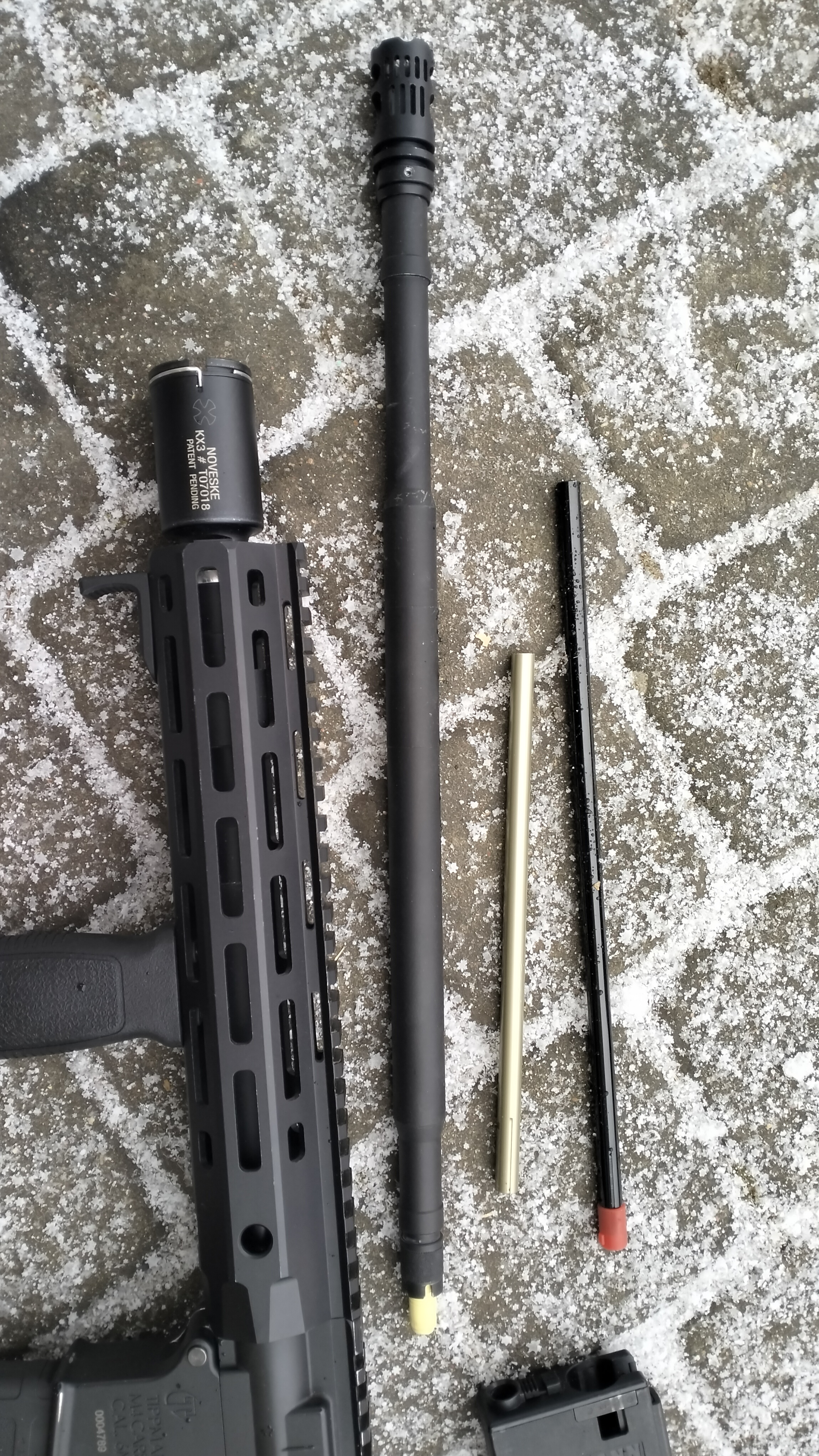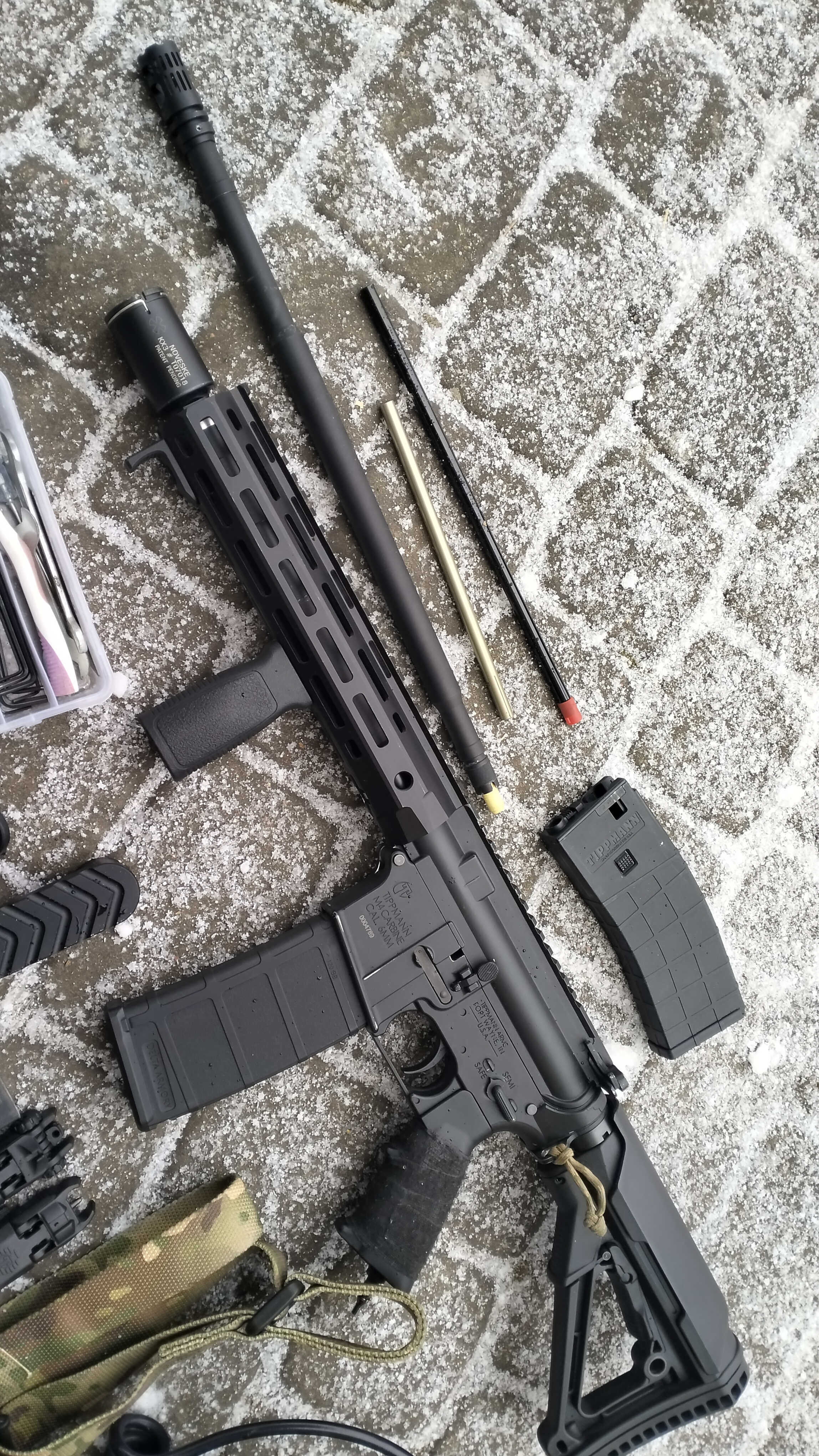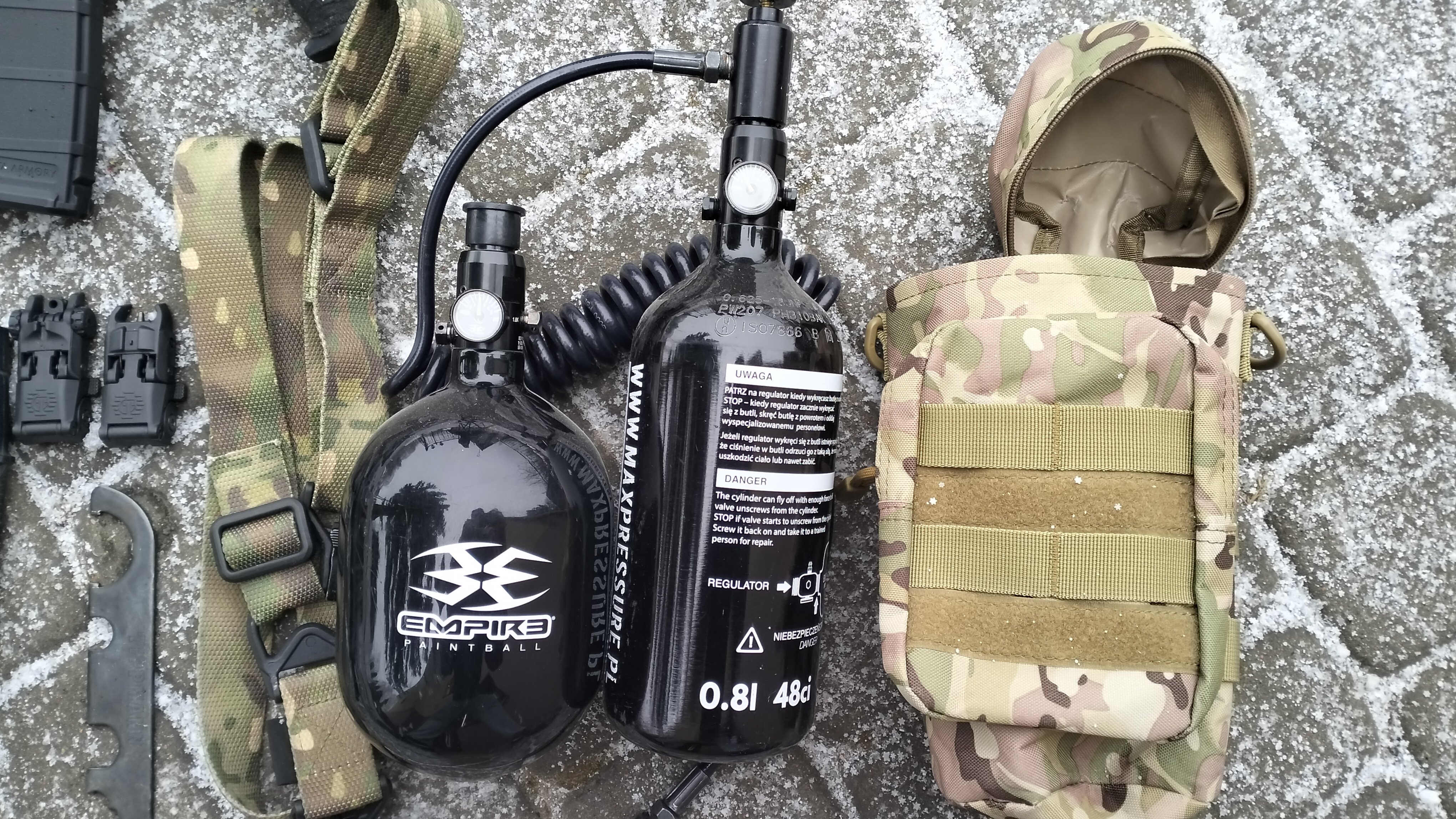 Do sprzedania mam tippmanna z zestawem gratów. Jestem co najmniej 3cim właścicielem. Zacznę od minusów repliki - z takimi dostałem od poprzednika. W body jest wypiłowany mały otworek, przez który można regulować fpsy bez rozkładania i odgazowywania repliki. Plus i minus. Druga wada to upiłowany kawałek buffer-tuba żeby można założyć aluminiową nakładkę/mikro kolbę. Ubytki widać na fotach. Na strzelanie to nie wpływa. Jakby coś buffer tube pasuje od G&P gbb i pochodnych. Otworek w body można zaklaistrować :) Co do plusów i atutów samej platformy to oferuje ona strzelanie z magazynków zasilanych kapsułami CO2, lub przez zasilanie sprężonym powietrzem. Replika posiada blow-back z regulacją mocy odrzutu Replika posiada możliwość regulacji ROF Replika posiada możliwość regulacji FPS Replika posiada możliwość regulacji powietrza podawanego do lufy Replika korzysta z magów AEG Replika korzysta z luf AEG lub GBB Do repliki pasują łoża AEG Do repliki pasują chwyty pistoletowe GBB Replika nie potrzebuje regulatora do butli HP, sam zawór on/off Platforma w całości mechaniczna, prosta i niezawodna. Replika ma zainstalowany dwell-screw mod, twang remover, tulejkę w buffer tubie dającą ok 70fps w zależności od długości lufy, oraz TDC. TDC pierwsza wersja nawet nie testowana w boju, ale kręci kulki :) Ogólnie sama replika nie była ze mną na żadnej strzelance. Kupiłem z chęcią powrotu do ASG, ale nie byłem na żadnej akcji. Kilka-kilkanaście setek kulek koło domu dla funu i testów. Samo strzelanie jest bardzo przejemne. Czuć blow-back, który dodatkowo można zmodować/wzmocnić. Dzięki modom również, jest ok tylko 5fps rozrzutu co jest super wynikiem dla tippmanna. Jest to ogólnie moja druga sztuka i nawet nie wiedziałem, że da się stosować gumki i lufy GBB - a ponoć dają super efekt. Generalnie dopasowanie gumki i dystansera to 90% sukcesu w tej giwerce. Trzeba się tu pobawić żeby osiągnąć oczekiwany efekt podkręcania i stabilne fpsy. Replika lubi ciężkie kulki, jak to HP, i dobrze strzela z wszelkimi gumami maple leaf - duży element podkręcający. Polecane też są madbulle, zielone G&G. Jak ktoś umie R-hopy, S-hopy itp to jak najbardziej. Kwestia dystansera, docisku, typu TDC. W obecnej dobie druku 3d można się bawić. W zestawie są dwa power tuby. Jeden daje ok 400fps, drugi 500. Obecnie zainstalowany jest dystanser dający ok 70fps i fps przykręcone do limitów szturmowych i DMR. Można szybko przekształcić karabin w zależnie od potrzeb. Można też dostosować jeden power tube pod limit CQB -bazowo ok 360fps plus regulacja. O! Semi only też można ustawić :) Stan giwerki oceniam na bdb. Nic nie lata, zbita buda, smukła i lekka jak gbb. Front pochodzi z serii M90x DE, pasuje idealnie i 10 cali uważam jest uniwersalną długośćią. Docisk na rzymską śrubę dla mnie genialny. W zestawie: Replika wąż zasilający z szybkozłączką ninja Butla stalowa maxpressure do 2029 plus 10lat Butla karbonowa empire do 2031 plus 5 lat Torba na butle Zestaw do używania CO2 Mag na CO2 Dodatkowy Power tube Lufa długa ok 40cm Lufa krótka ok 15cm Przedłużka ok 10cm Stalowa precka 410cm Stalowa precka VFC 6.05 27cm Lufa GBB WE z jakąś gumką Docinana precka madbulla ok 20cm Zawieszenie kopia MS-3 5 midów Nakładka na kolbę Zestaw do produkcji TDC Oraz inne rzeczy widoczne na fotach. Oryginalny klucz tippmann, oryginalne smary, oryginalny system hop-up, klucze, części, części do butli, pierdoły. Może dorzucę coś jeszcze na m-loka, risa, albo jakieś gumki do testów i zabawy. Zestaw nie zawiera optyki! Mile widziany odbiór osobisty. Starachowice-Skarżysko-okolice. Woj. Świętokrzyskie. Mogę też wysłać, wystawić gdzieś.