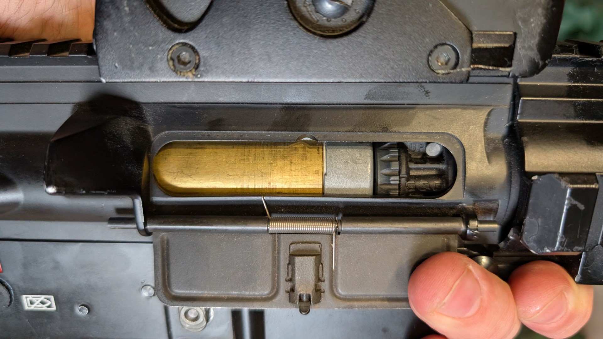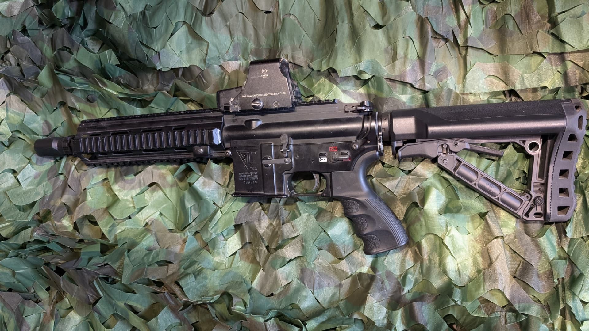 G&G z serii „Advanced”. Model zaprojektowany jako platforma do ćwiczeń, w oryginale posiadał system odrzutu zamka (obecnie nieaktywny dla lepszej wydajności). Specyfikacja techniczna: Wnętrze: Zmodyfikowany szkielet v2, usunięte zbędne mechanizmy dla bezawaryjności. Moc: ok. 1.10J na kulkach 0.25g. Układ celnościowy: Komora HU z G2H, zielona gumka G&G, nowa precyzyjna rurka wewnętrzna Specna 275mm. Napęd: Zębatki ROCKET (SHS) + short stroke -3, sprężyna m100/m110 SHS, łożyska kulkowe. Pneumatyka: W pełni customowa (chillpad, dysza G2H). Elektronika: Zaawansowany układ sterowania Titan (wersja bez BT) – pozwala na pełną konfigurację cyklu i czułości elementu inicjującego strzał. Front: Nowa atrapa urządzenia wylotowego SLR. Ważne informacje użytkowe: Magazynki: Podajniki siedzą bardzo stabilnie. Modele S-mag wymagają zdecydowanego domknięcia, co eliminuje luzy boczne. Przy markach typu Guarder należy użyć nieco więcej siły przy wpinaniu (wpływa to minimalnie na stabilność FPS). Detale konstrukcyjne: Klapka osłaniająca system HU otwierana manualnie, rączka przeładowania bez sprężynki powrotnej, w miejscu prawego przełącznika trybu znajduje się zaślepka. Zabawka jest świeżo po profesjonalnym przeglądzie technicznym. UWAGA: Widoczny na zdjęciach celownik optyczny nie jest częścią oferty.