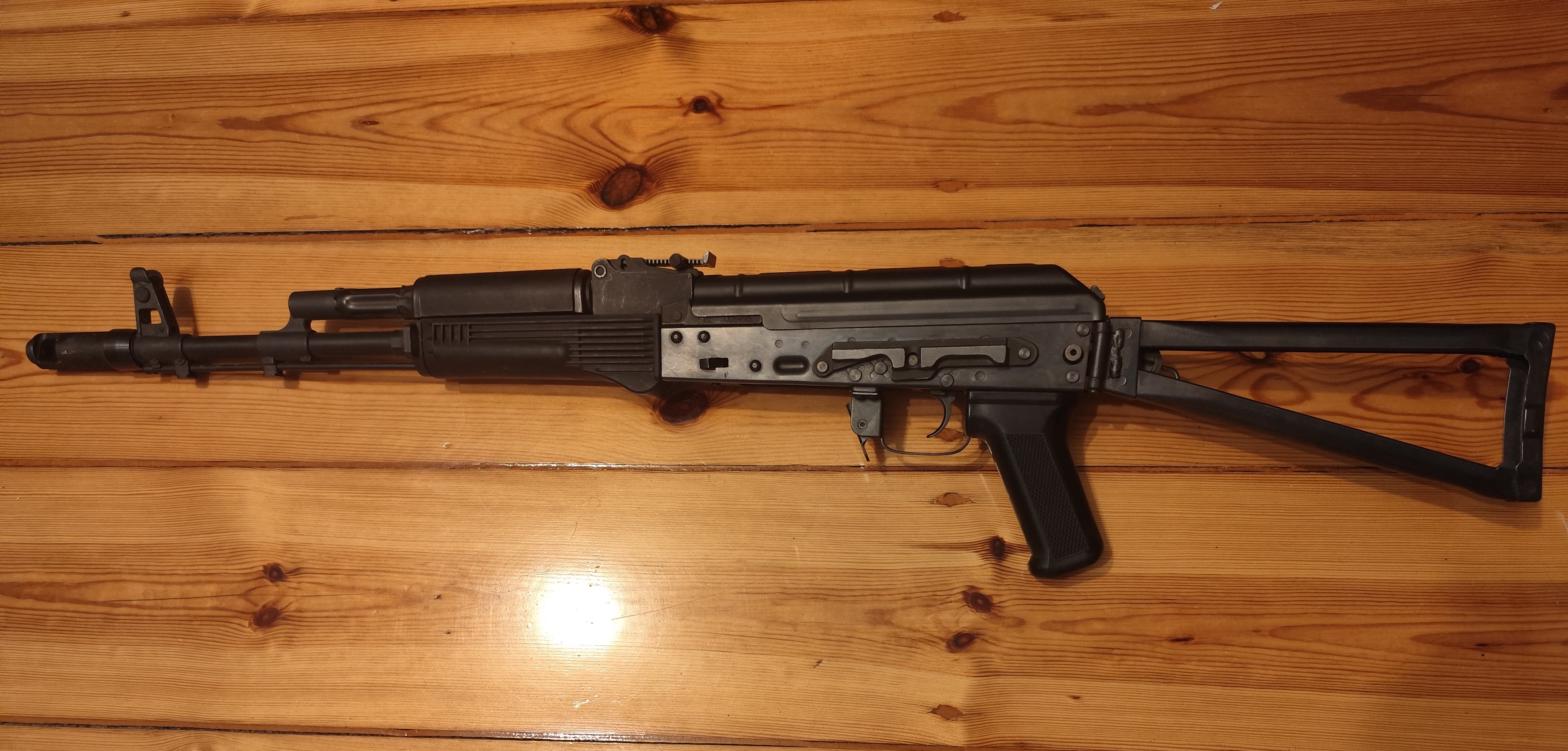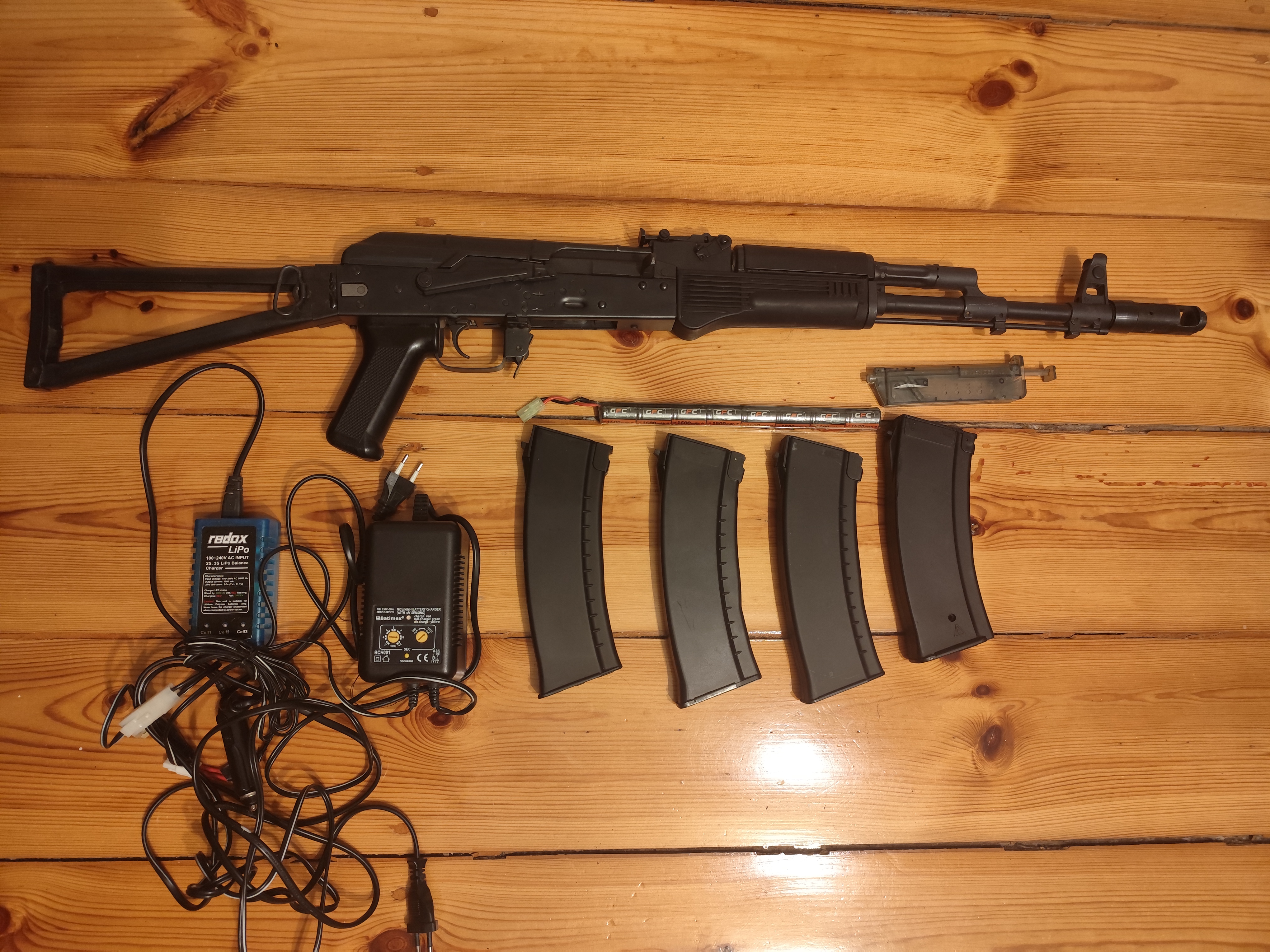 Na sprzedaż leci replika AK-74 od firmy E&L Generalnie kupiłem ją jakoś w 2014/2015 z myślą o tym zeby mieć coś porządnego i z tego strzelać. Ale jakoś nie specjalnie strzelałem. Byłem z nią może na jednej/dwoch strzelankach. A tak to od 10lat leżała w pokrowcu pod łóżkiem. Jeśli chodzi o dane techniczne to za bardzo nie pamiętam. Jedyne co moge powiedzieć, że miala jakieś 380-400fpsów. Serio, nie siedze w ASG od dawna juz. xD Jedyne co sugeruje to przed zabraniem jej na strzelankę wypadałoby ją przesmarować. Poza giwerą dorzucam - 4 magazynki (3 midyi 1 hicap). 2 z nich mają uszczerbione mocowania, ale o dziwo dobrze siedzą w replice. - 2 ładowarki. Jedna do LiPo. A druga do NiMh, z tego co pamietam miała tez chyba funkcje rozładowywania baterii, ale głowy sobie uciąć nie dam. - Akmulator NiMh 1600mah. Podłączyłem go na chwilę do ładowarki, a potem do giwery i wszystko działa. Dodatkowo dorzucam jakieś 10tys kulek, w tym 4tys nieodwartch Madbulli 0.30. Dorzucam też jakieś części od starego gearboxa z innej repliki którą kiedyś miałem. Bo mi serio sie nie przydzadzą. Jak chętny nie bedzie ich chciał to sie najwyzej wyrzuci na śmietnik ;) Generalnie preferuje odbiór osobisty, bo nie trzeba pakować :D Wartości przesyłki podałem orientacyjnie, bo nie wiem ile mnie policzą, ale podejrzewam, że te 30 trzeba liczyć. Oczywiście cena do rozsądnej negocjacji, ale nie w stylu "daje 500 i jestem jutro"
