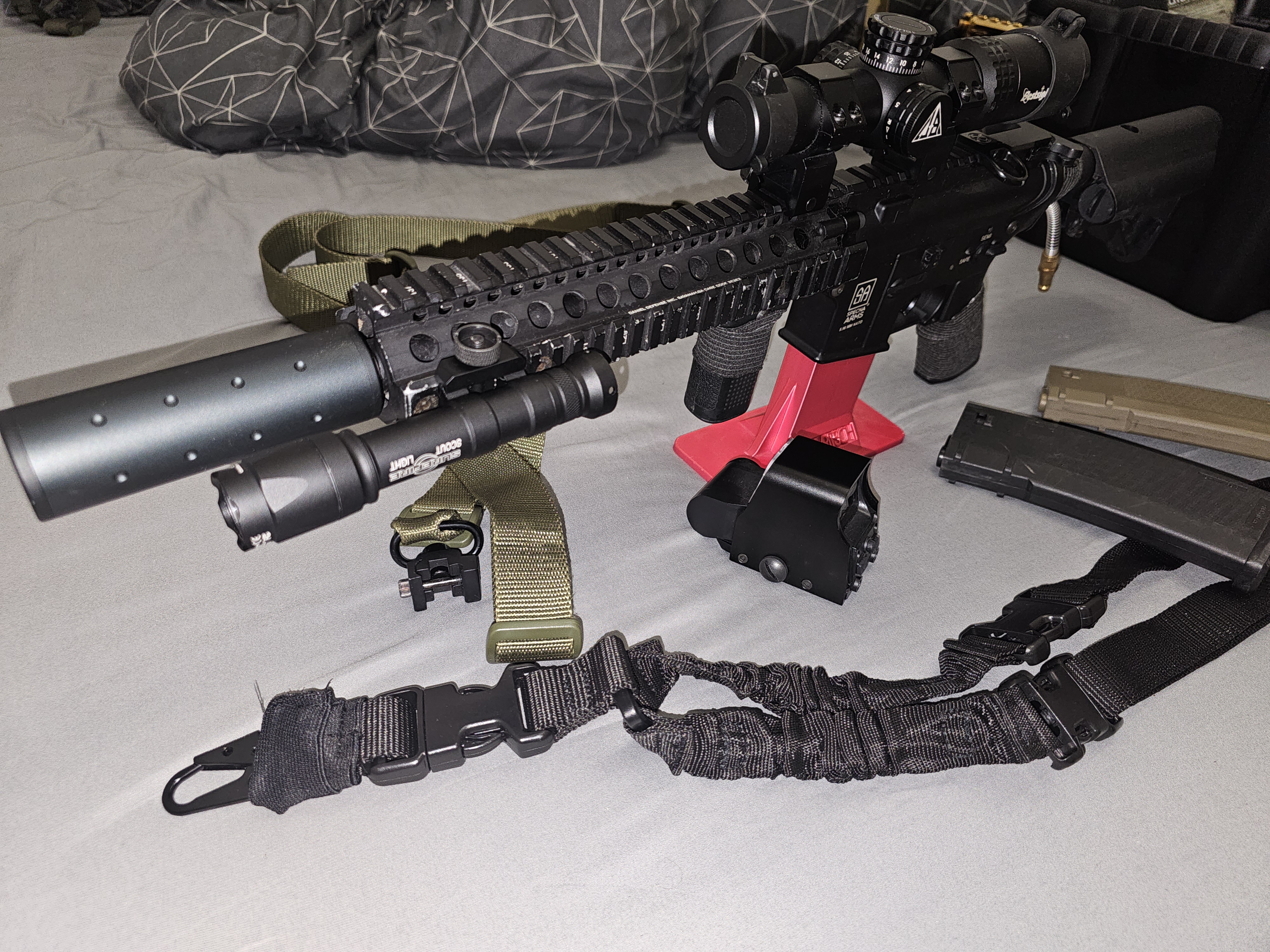 Sprzedam specna arms Daniel Defense Mancraft v2 2 magazynki Latarka sunfire (bez baterii) Chwyt przedni Lufa precka Komora cnc Luneta biegowa Tlumik Celownik cholograficzny Stopka do postawienia broni novritsch 2 pasy do mocowania broni