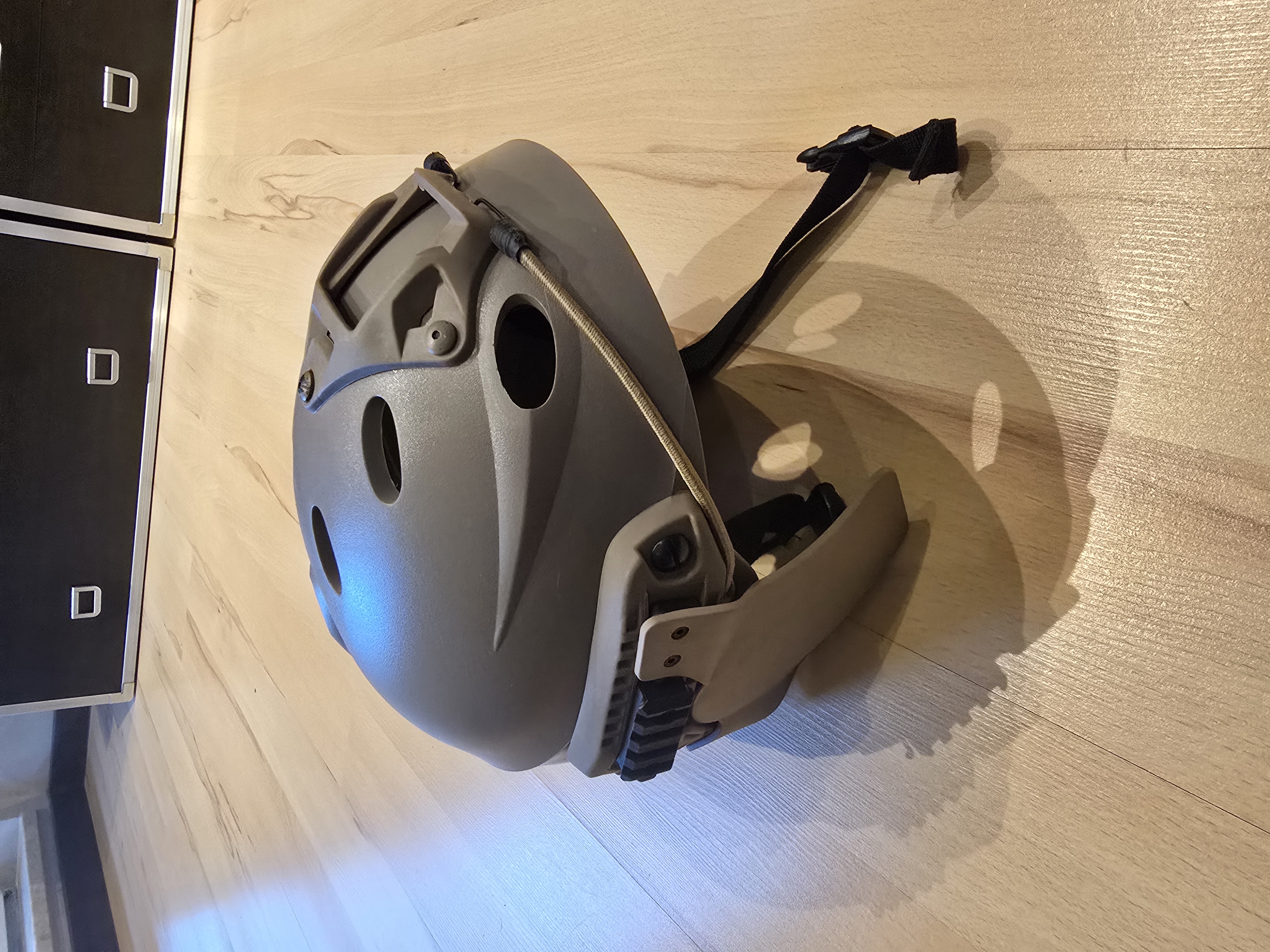 Hełm taktyczny z grubego tworzywa z gumowymi ochronnikami uszu. Firma noname, ale jest solidny. Posiada szyny do mocowania osprzętu. Od strony głowy gąbki. Posiadam sporo innego szpeju i dwie repliki w innych ogłoszeniach, zapraszam :)