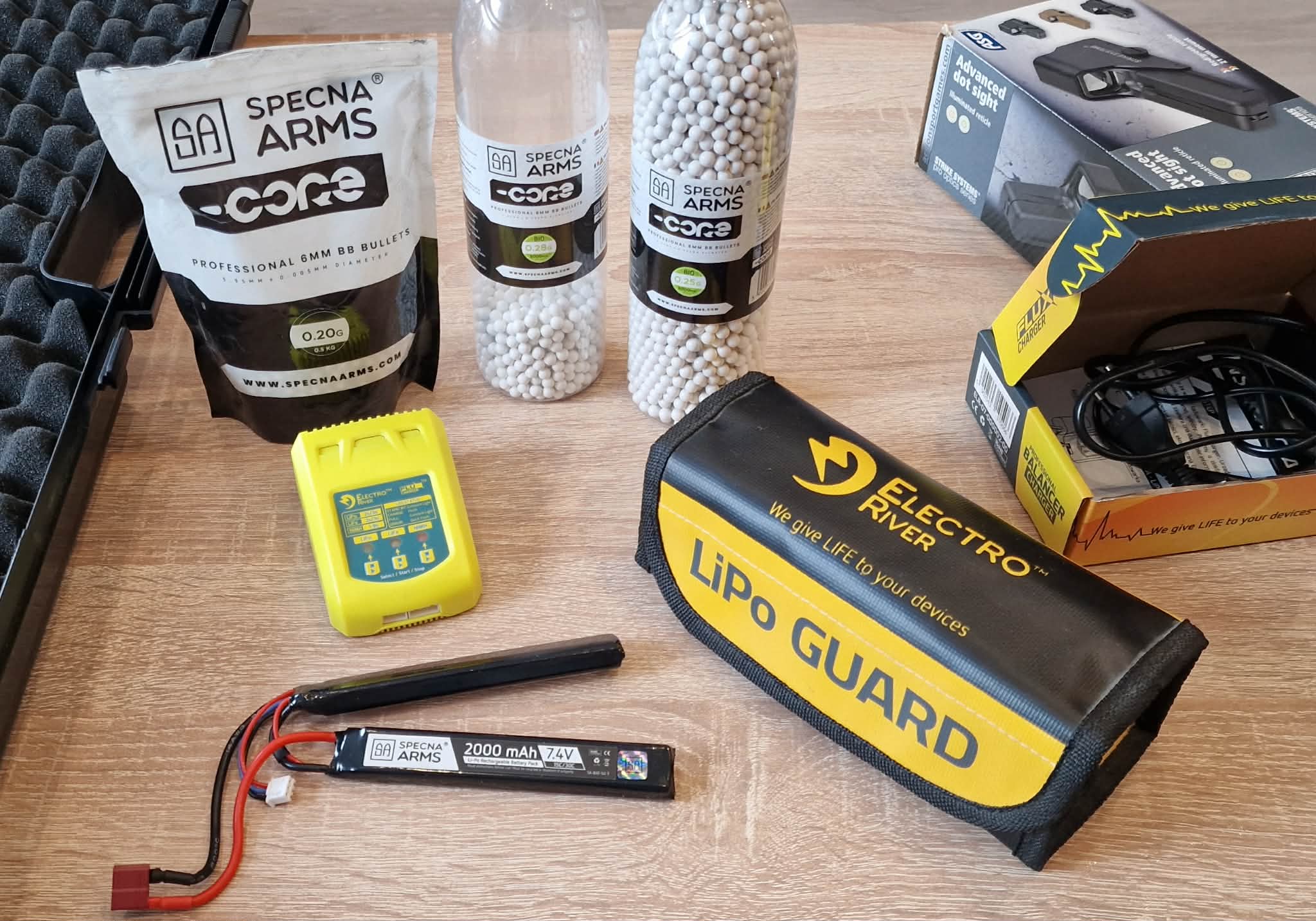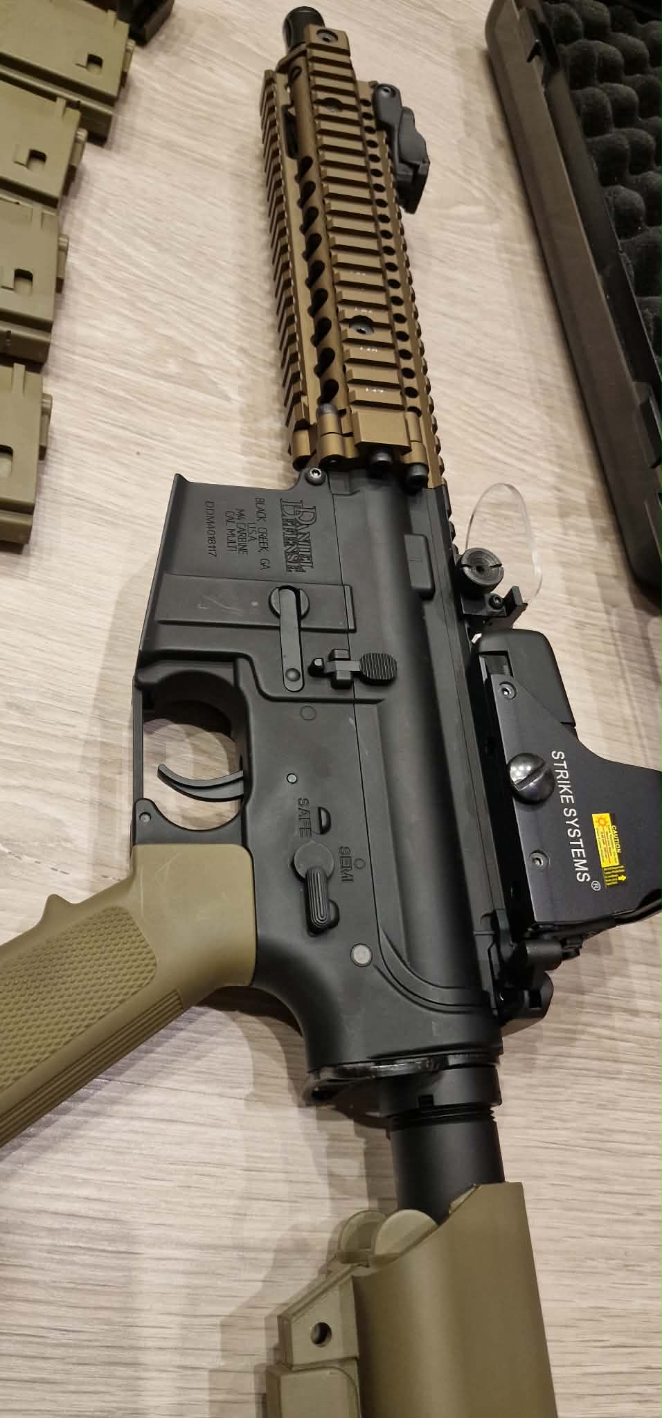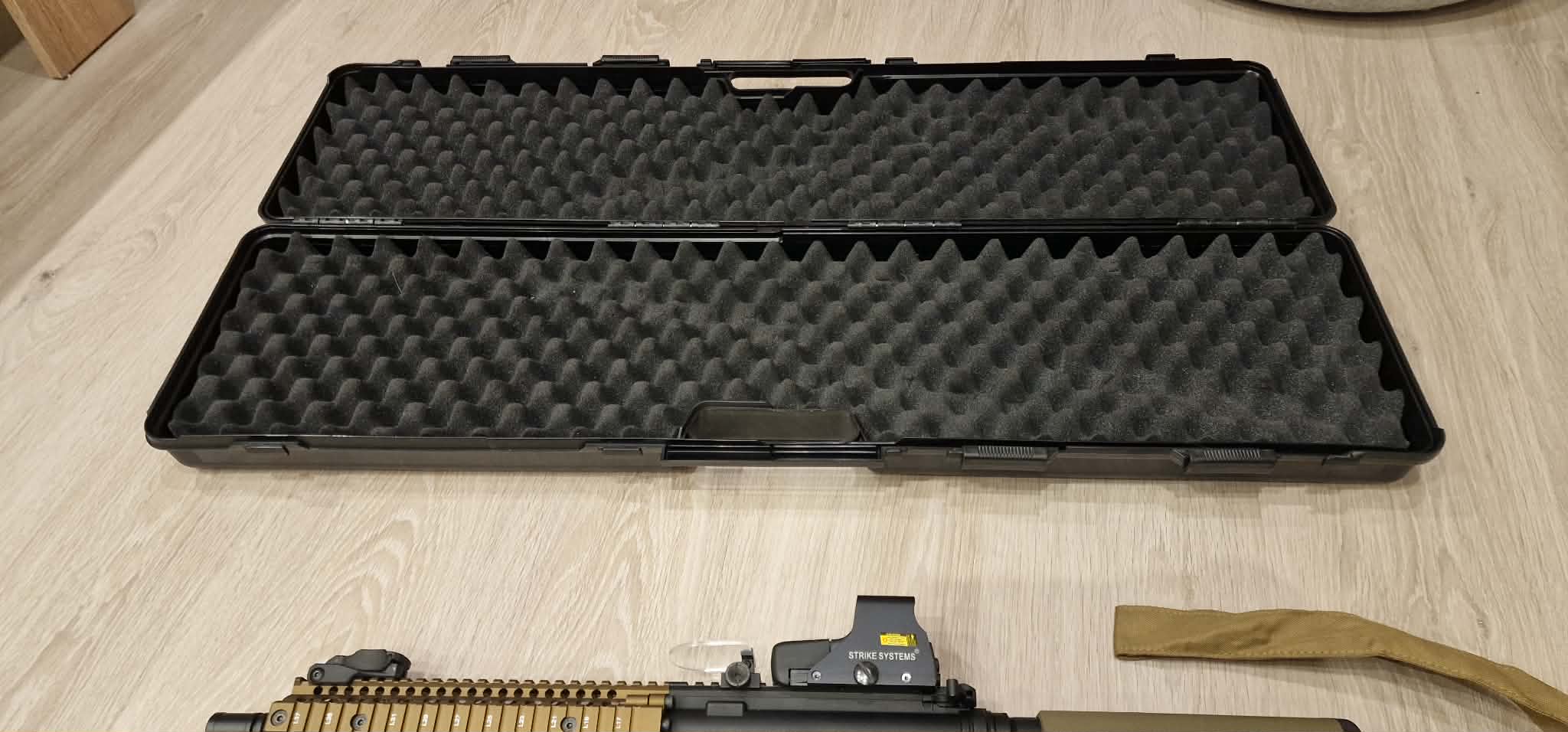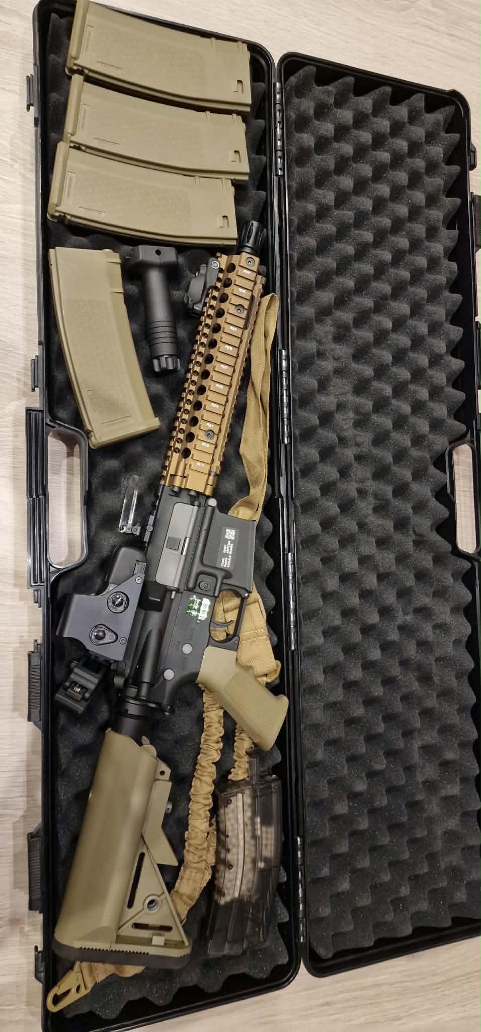 AEG Daniel Defense MK18 SA-E19 Edge - Chaos Bronze Replika oryginalna, nie rozkręcana, wystrzeliła z 2000 kulek, aktualnie leży i się kurzy. Sprzedaje cały zestaw widoczny na zdjęciach, czyli: -Replika wraz z uchwytem pionowym -Kolimator ( 551 R/G Advanced Dot Sight ) -Osłona na kolimator - 4 magazynki (mid-cap) o poj. 125 kulek -Pas bungee jednopunkowy -Akumulator firmy Specna Arms 7,4V o poj. 2000mAh -Torba LiPo GUARD -Ładowarka electro river flux charger - Całe opakowanie kulek bio 0,25g + dwa otwarte 0,28g oraz 0,2g\ -Walizka na karabin o wymiarach 950x230x110mm