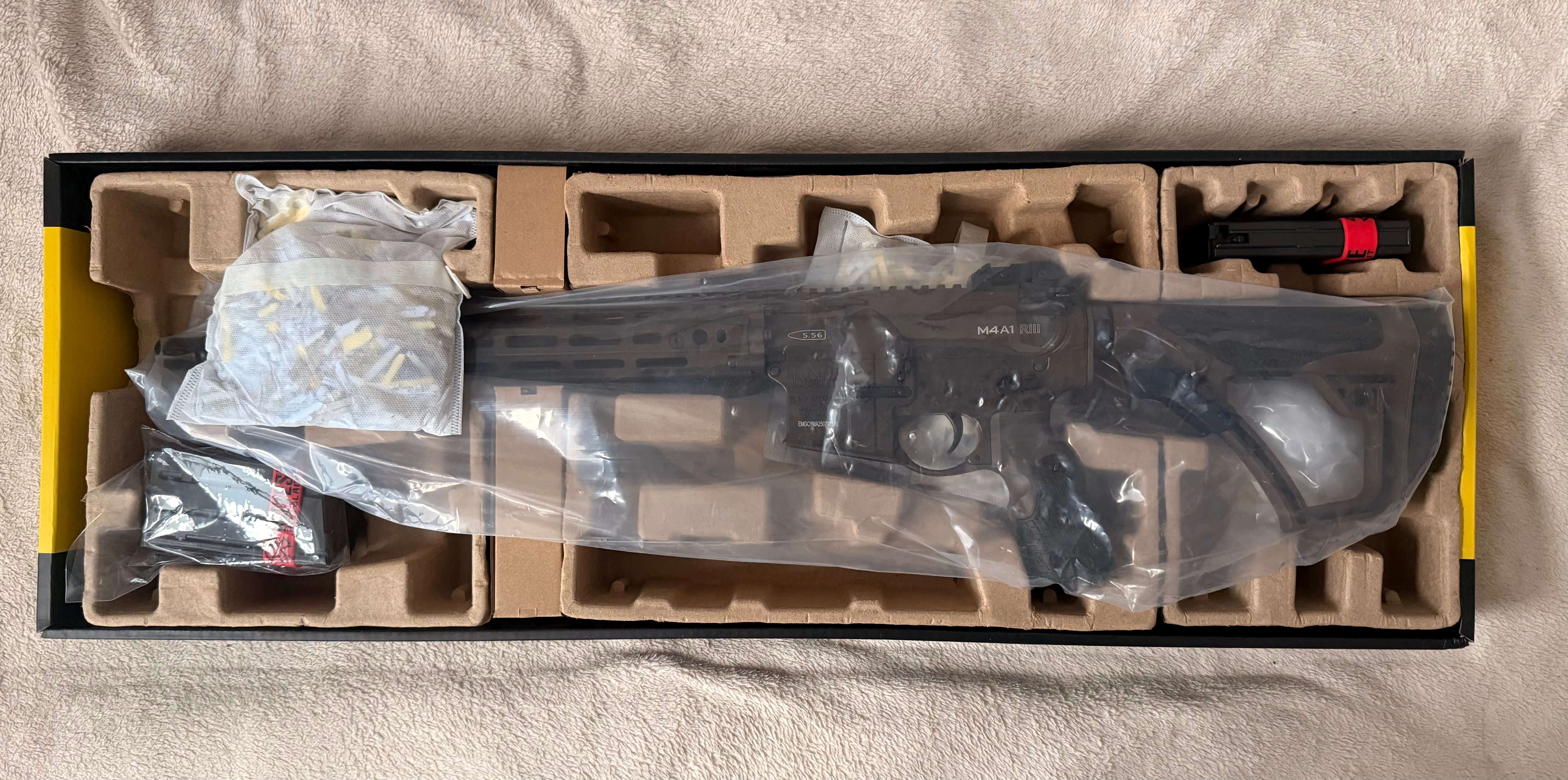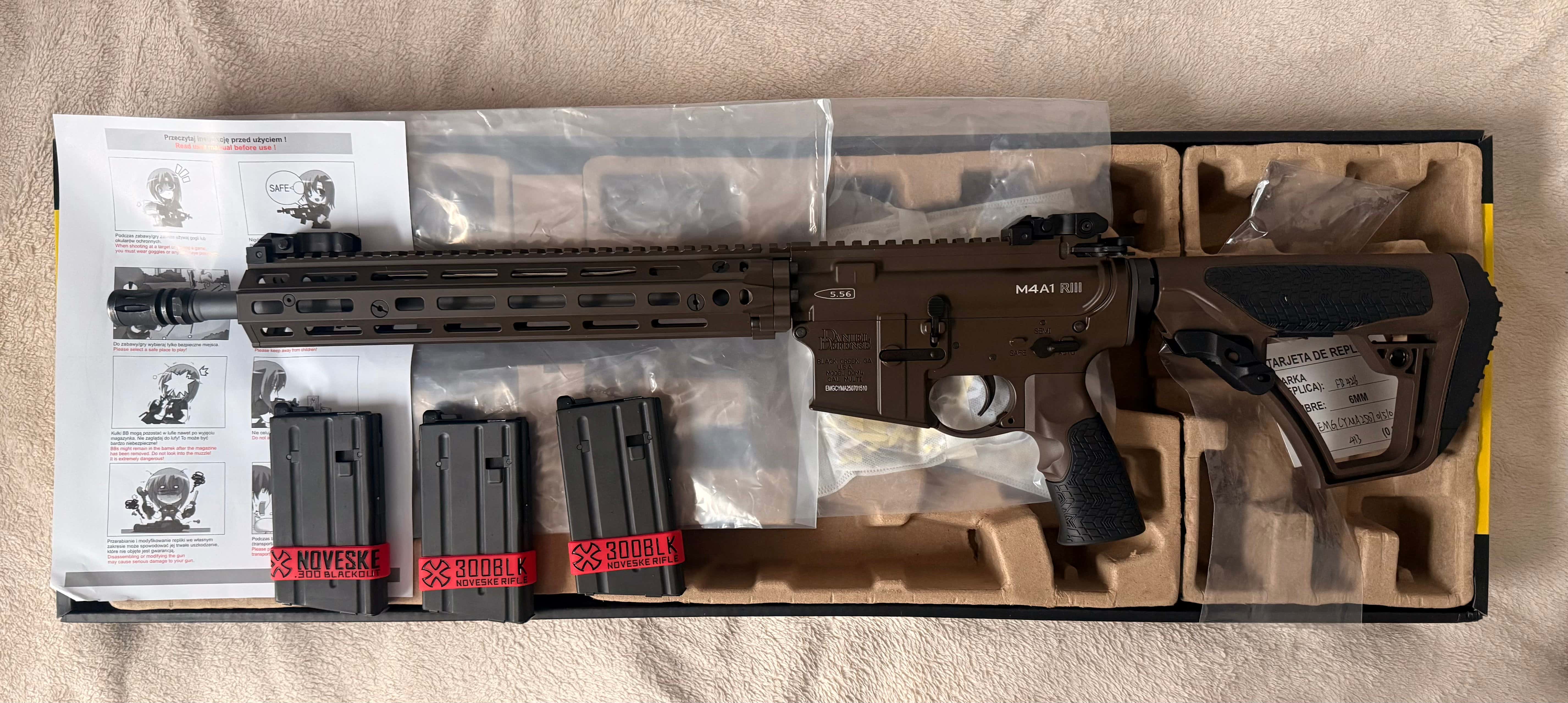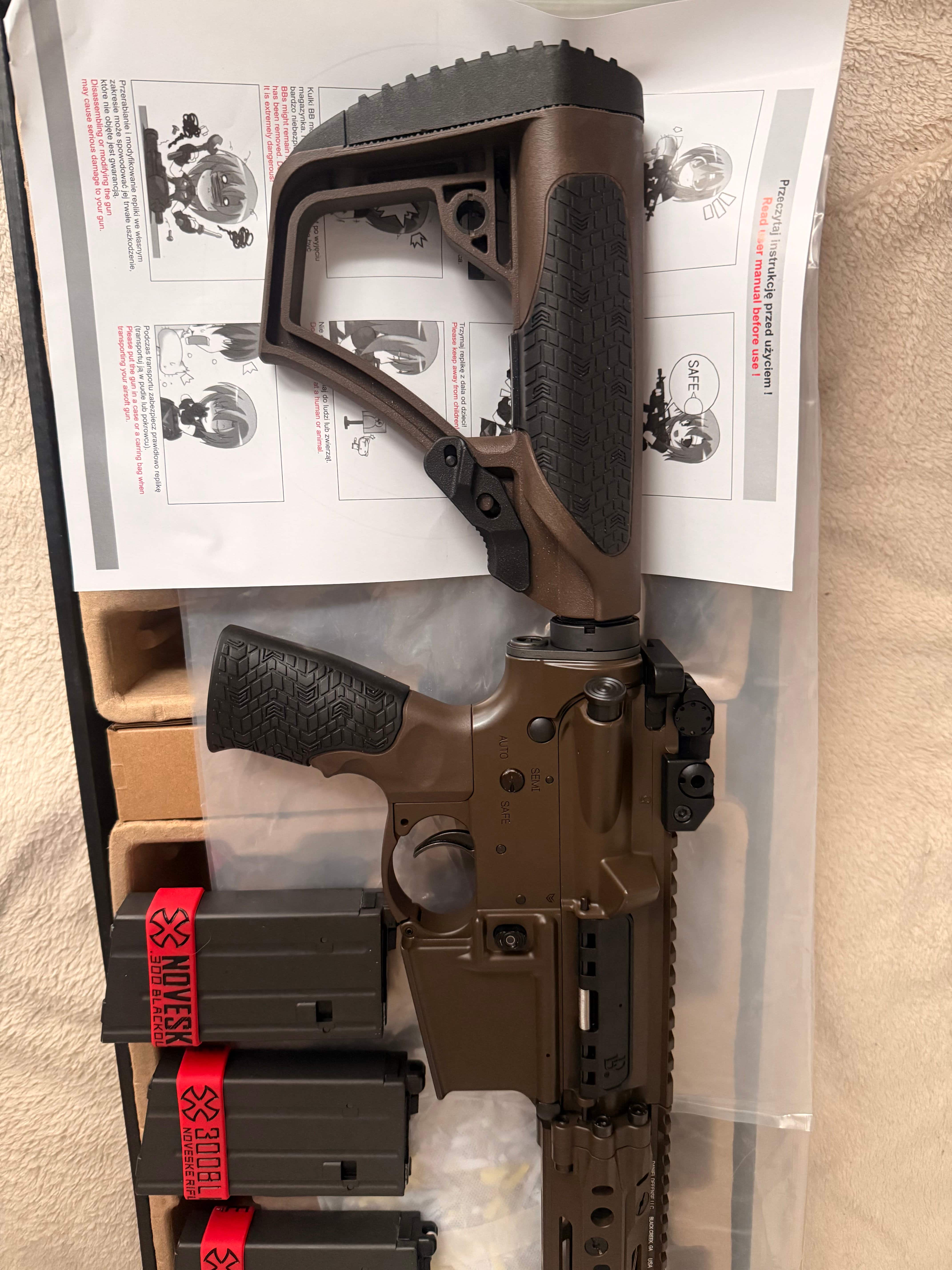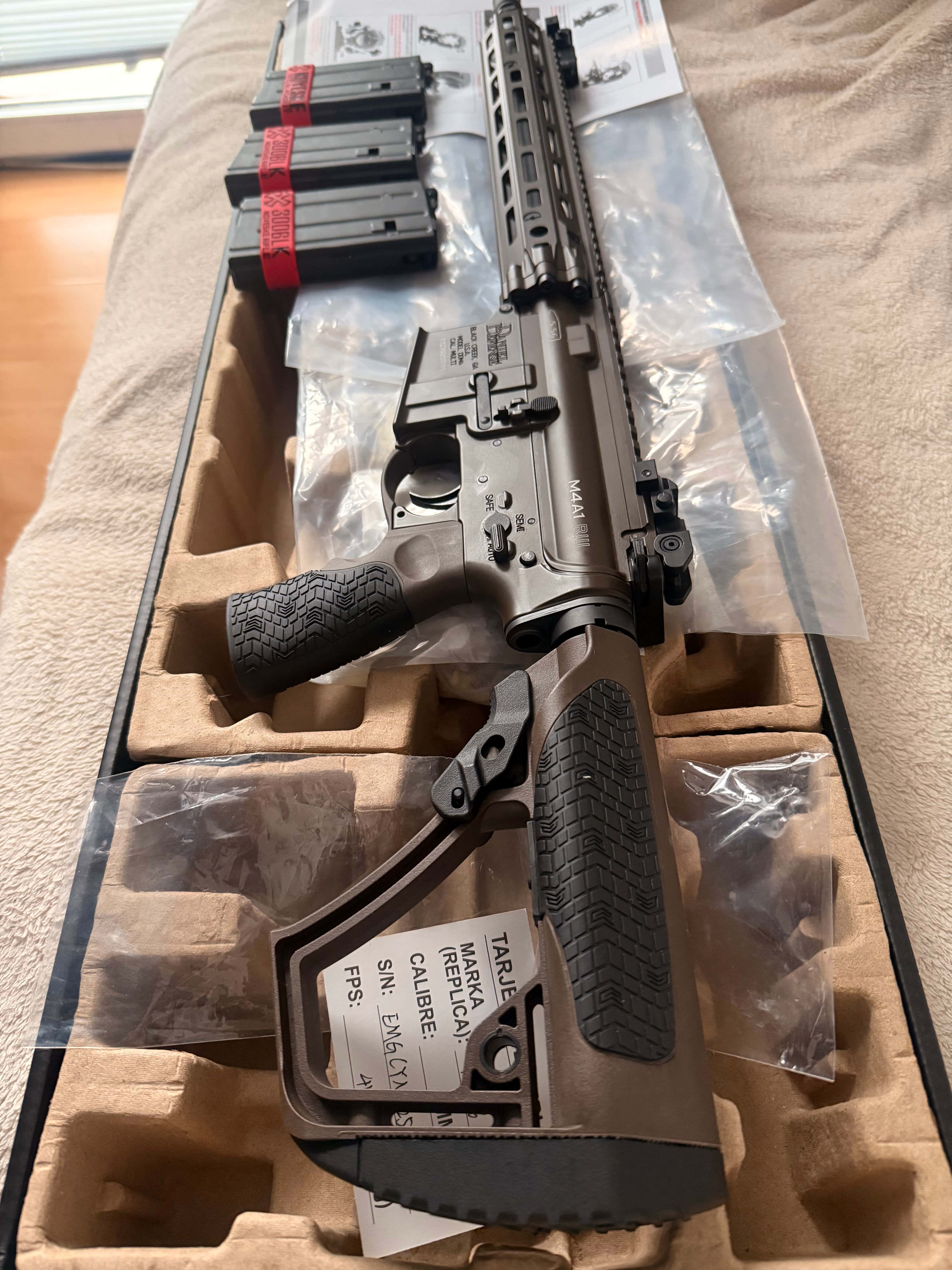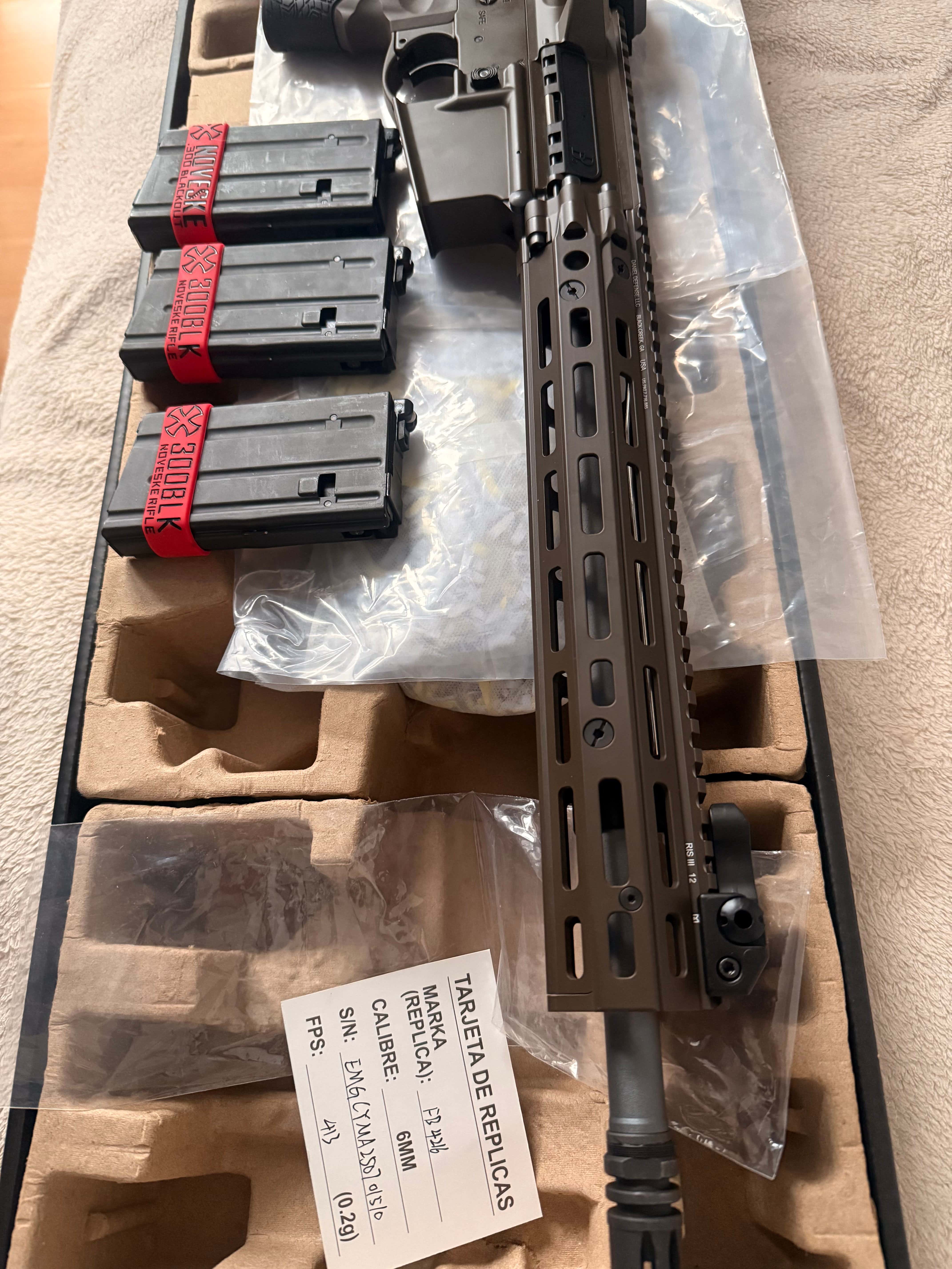 Cześć, Sprzedam replikę Daniel Defense DDM4 MK18 RIII z łożem 12.5" w czekoladowym kolorze. Seria Lighting. Replika jest w zasadzie jak nowa, wymieniłem jedynie gumkę HU na Maple Leaf Autobot 60* (ori dodam do zestawu). Przebieg to dosłownie z 50 kulek w ogrodzie. Zmieniła mi się wizja i idę w coś innego. Widoczna jest ryska na łożu. W zestawie trzy krótkie magazynki Tokyo Marui 20bb (idealnie pasują pod SPR). Bez magów cena 1800 PLN. Sprzedaję z ori kartonem, wszystkimi foliami, dowodem zakupu (TG) itp itd.