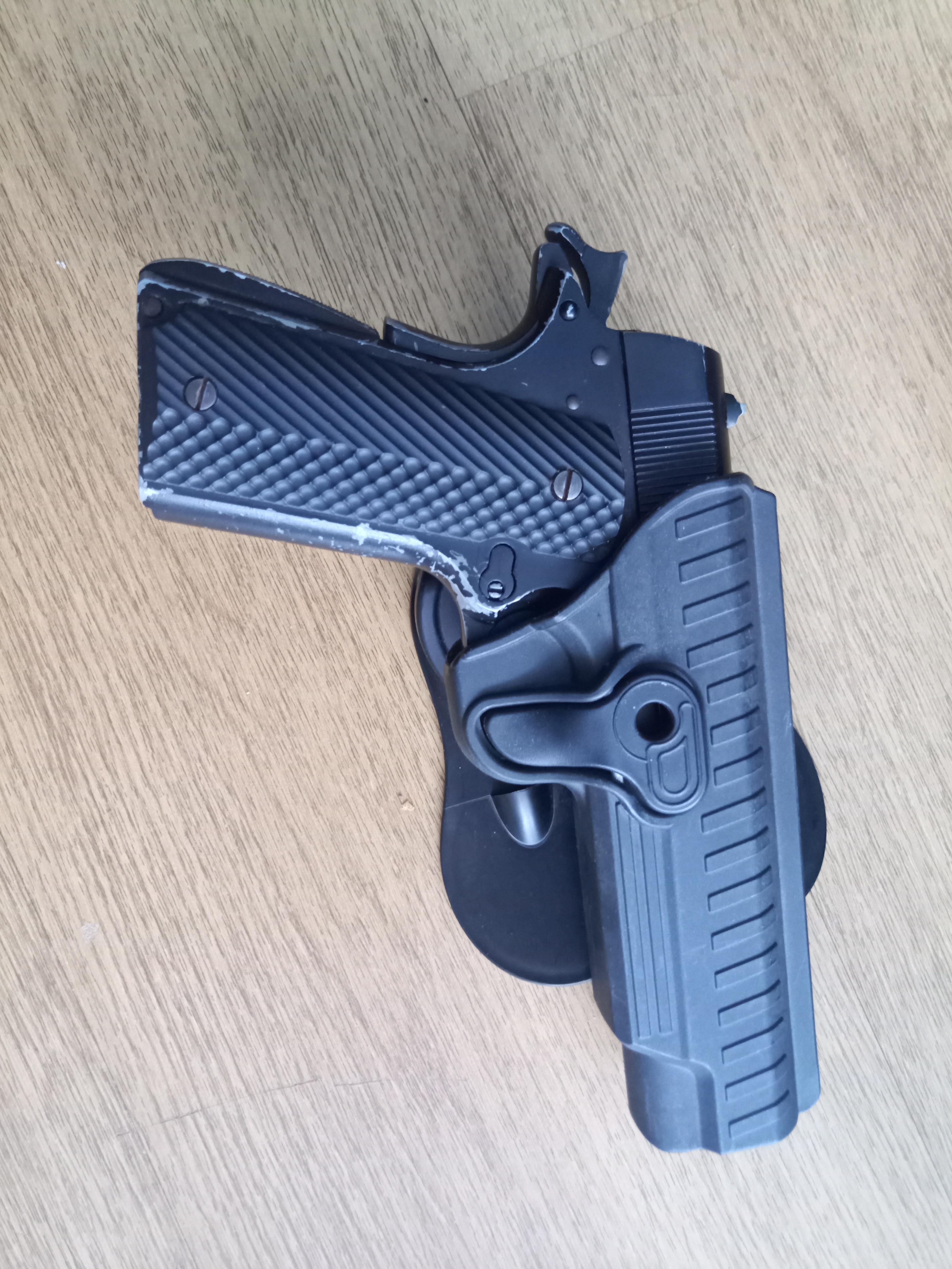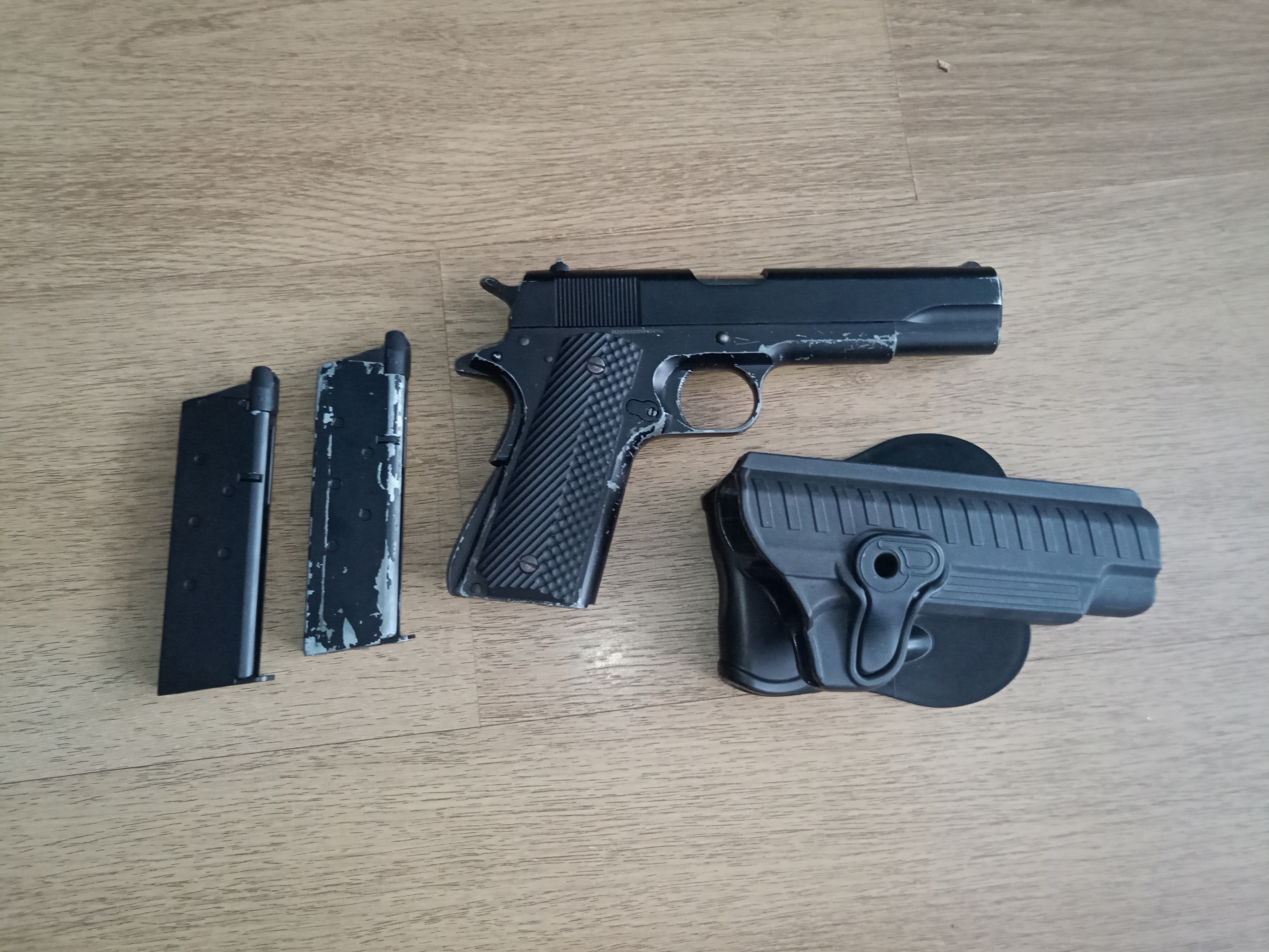 Replika bez oznaczeń, 2x magazynek na GG, kabura polimerowa. colt doszczelniony, magazynki szczelne, wszystko sprawne. Posiada gwint wewnętrzny na tłumik
