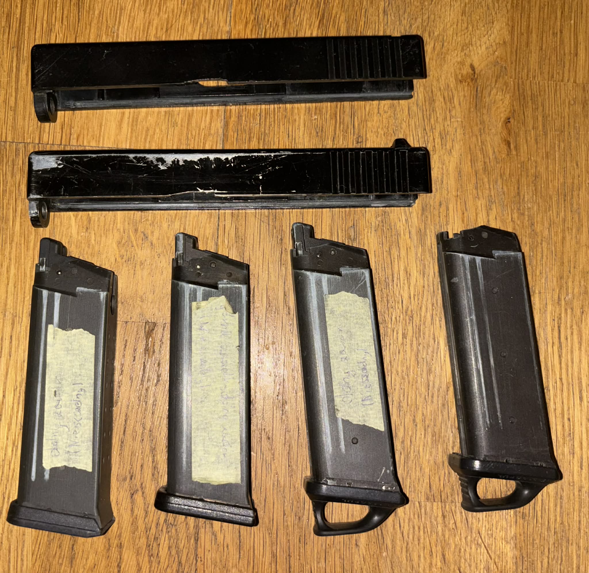 Witam, Mam na sprzedaż parę pozostałości po Asg, a dokładnie po Glockach 19 od firmy ASG. Części leżą i się kurzą, a może komuś się przydadzą. Cena za wszystko to 50zł Lista: 1. 4 magazynki do Glocka 19 firmy Asg (3 magazynki są nie szczelne, do wymiany są 2 magazynkach dolne zawory, w 1 magazynku dolny zawór i górna uszczelka, a 1 magazynek jest jako dawca już brakuje w nim zaworów i uszczelek) górnego zaworu i górnej uszczelki) 2. 2xzamki (1x metalowy i 1x.plastikowy, oba nie mają muszki) 3. Woreczek z częściami (Są tam lufy plastikowe zewnętrzne, lufy wewnętrzne, element do sprężyny w magazynku, spust) 4. Woreczek z częściami (Nie mam pojęcia co to za części) 5. Woreczek z częściami (Są tam jakaś sprężynka, ta blaszka z tyłu glocka i inne części) 6. Woreczek z częściami (Są tam jakieś sprężynki i parę innych części) 7. Koszyk dyszy (W takim stanie jak widać) Za wszystko 50zł