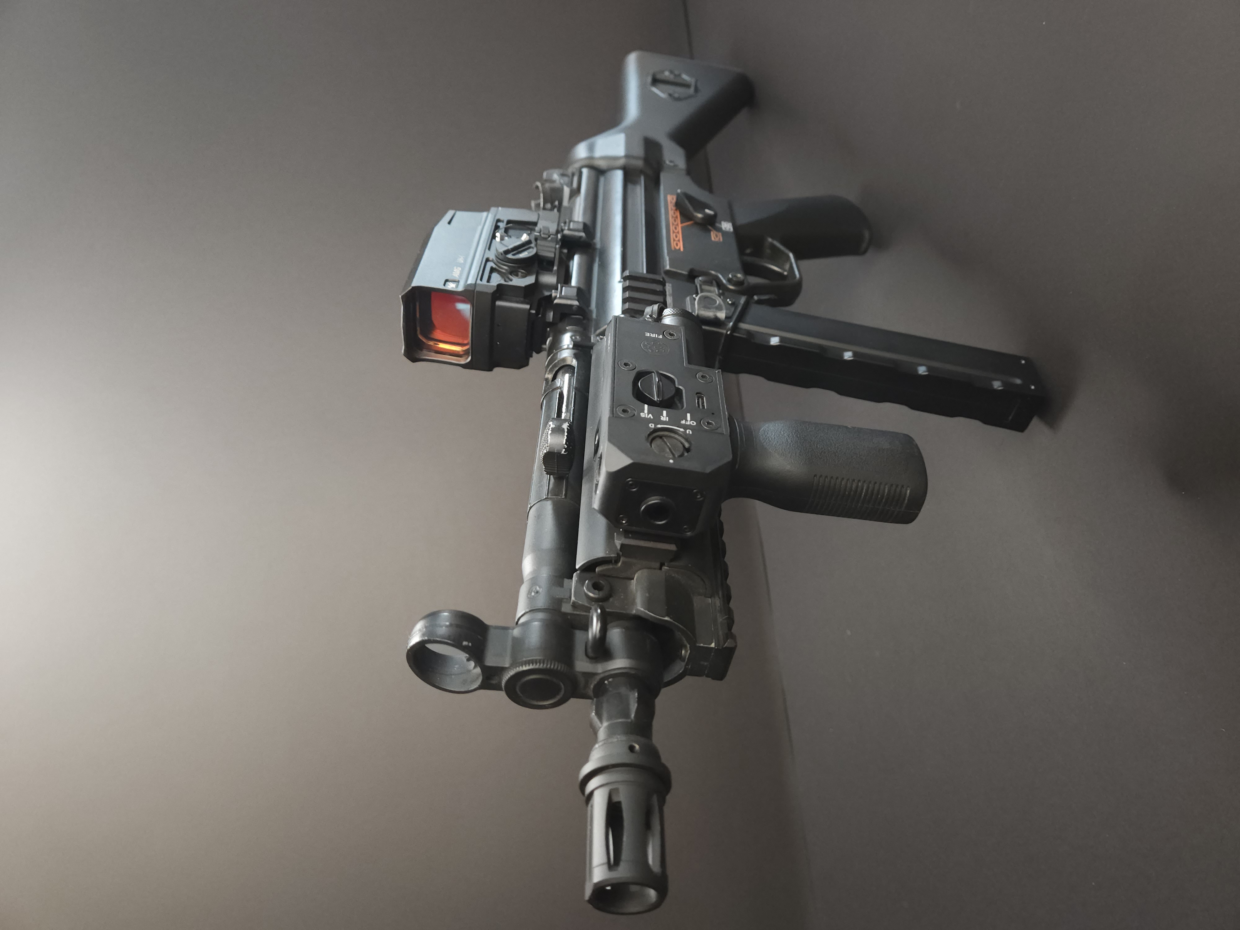 Replika firmy JG w wersji metalowej, z frontem RIS. Przeszła ona przegląd zerowy, zostały wypodkładkowane zębatki, ustawione AOE, wszystko nasmarowane najlepszymi smarami. Ustawiona na tę chwilę na 260fps - służyła do treningów dla mojego siostrzeńca - stąd też obniżona moc, wystarczy jedynie wymienić sprężynę na mocniejszą. MP5 posiada w zestawie jeden magazynek hi-cap, chwyt przedni dodaje do zestawu. Z mankamentów to wytarty gwint na lufie zewnętrznej (koszt 15zł). Brak oryginalnego pudełka. Za dodatkową opłatą mogę dorzucić nową baterię 7,4V 2000mah mieszczącą się w stałej kolbie. Widoczne dodatki w postaci Kolimatora oraz Lasera - nie wchodzą w skład zestawu.