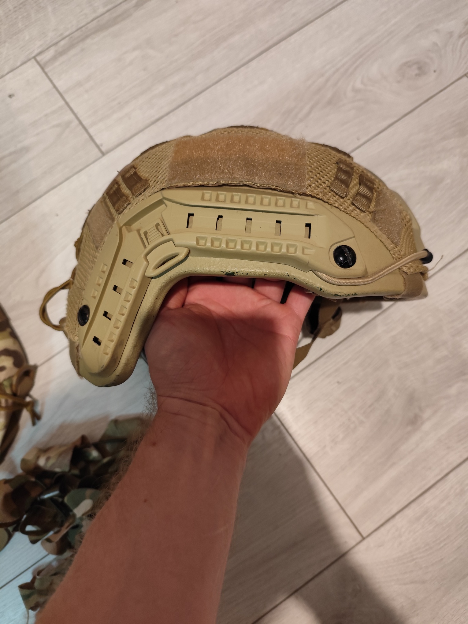 Witam, mam na sprzedaż hełm firmy Aholdtech ( z Aliexpress) ponoć balistyczny ale sprzedaję jako balastyczny. Kopia OPS Core FAST, rozmiar XL na głowę 59-62cm, Ultra High Cut. Fasunek chiński Team Wendy. Kolor Tan/piaskowy, ma załozony pokrowiec w chińskim multicamie. W zestawie jest też siatka maskująca w multicamie (też z aliexpress), mocno porwana i pokrowiec transportowy w stanie praktycznie jak nowy. Wracając do hełmu - odciągi nieużywane jak nowe, pokrowiec stan BDB, hełm trochę drapnięty na krawędziach jak na zdjęciach. Do gniazda pasują prawdziwe montaże Wilcox czy Norotos bez żadnego luzu. Wszystkie klamry całe, dial z tyłu działa. Waży 1.7kg ze wszyskim co w ogłoszeniu. Ma dołożone trochę dodatkowych poduszek bo jestem prawie łysy i mnie gniótł to tu to tam. Bez włosa na głowie hełm ci odciskiem odpowie. Ale nie ten bo ma nadokładane poduszki. No i co najważniejsze - Aholdtech, choice of life saved. Nie wiem czy uratuje ci życie ale na pewno uratuje cię przed bogactwem. Polecam. Cena: 750zł.